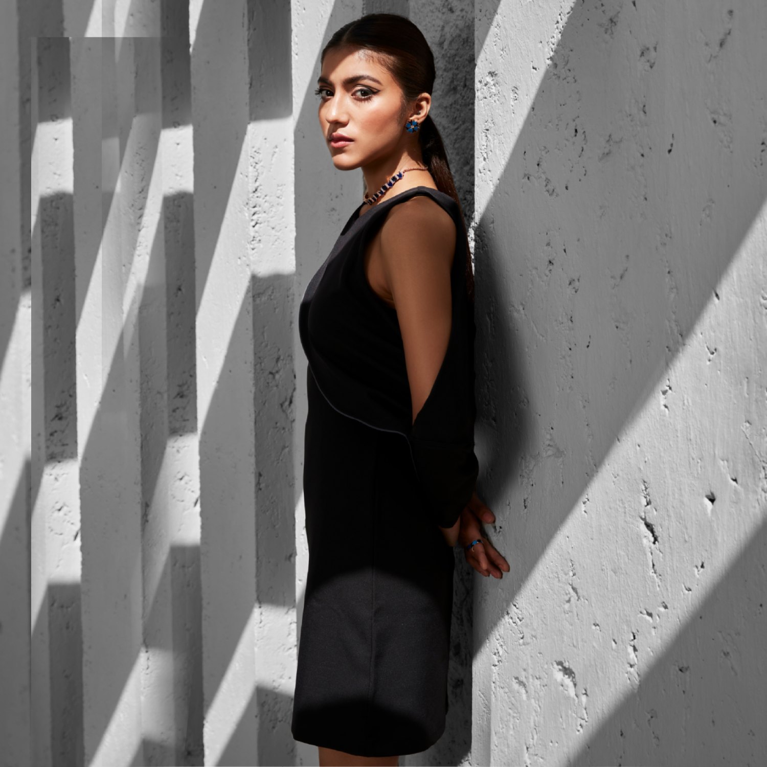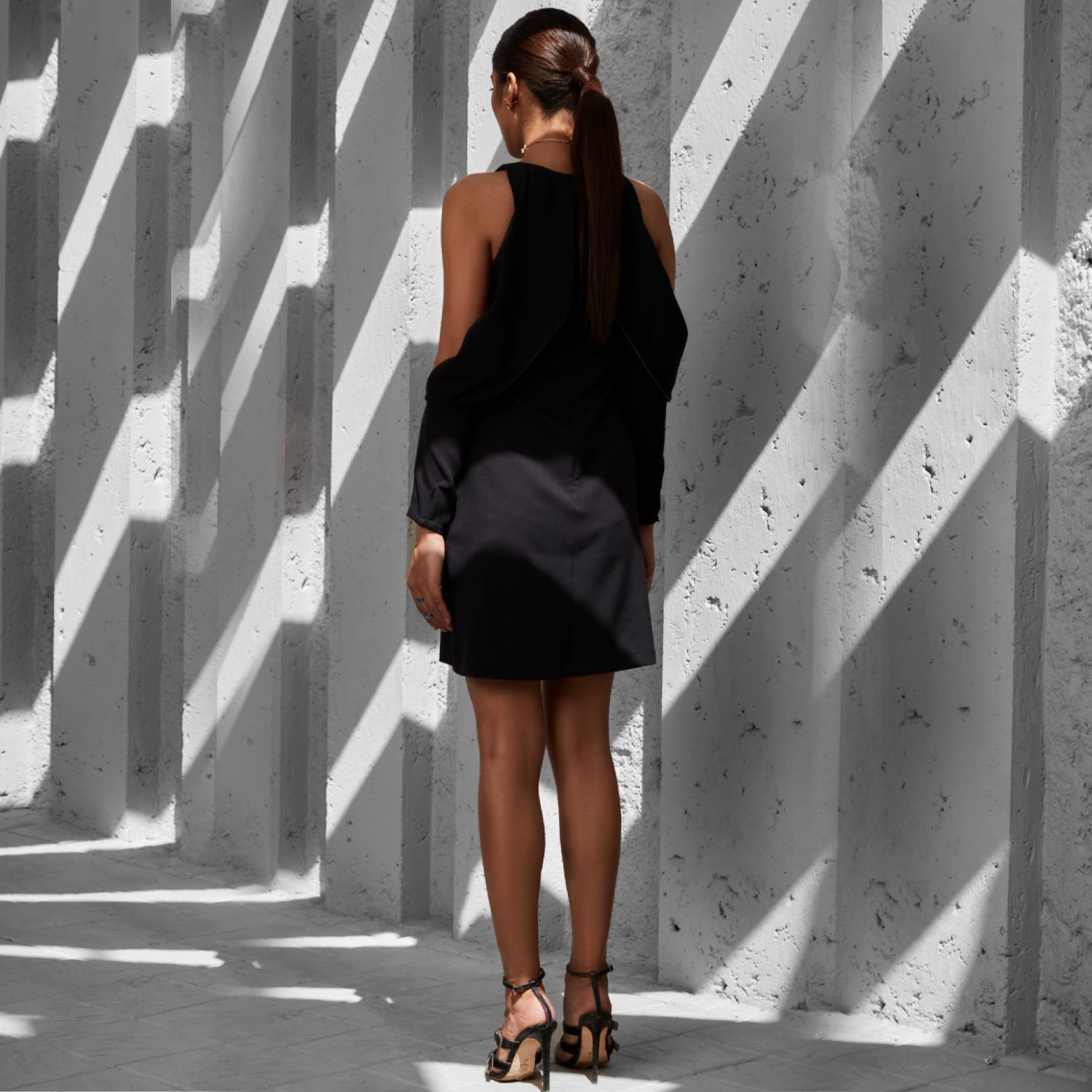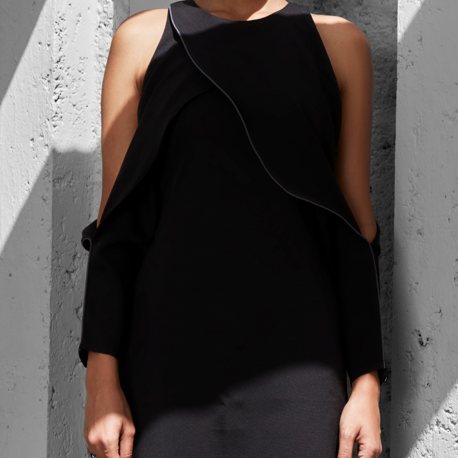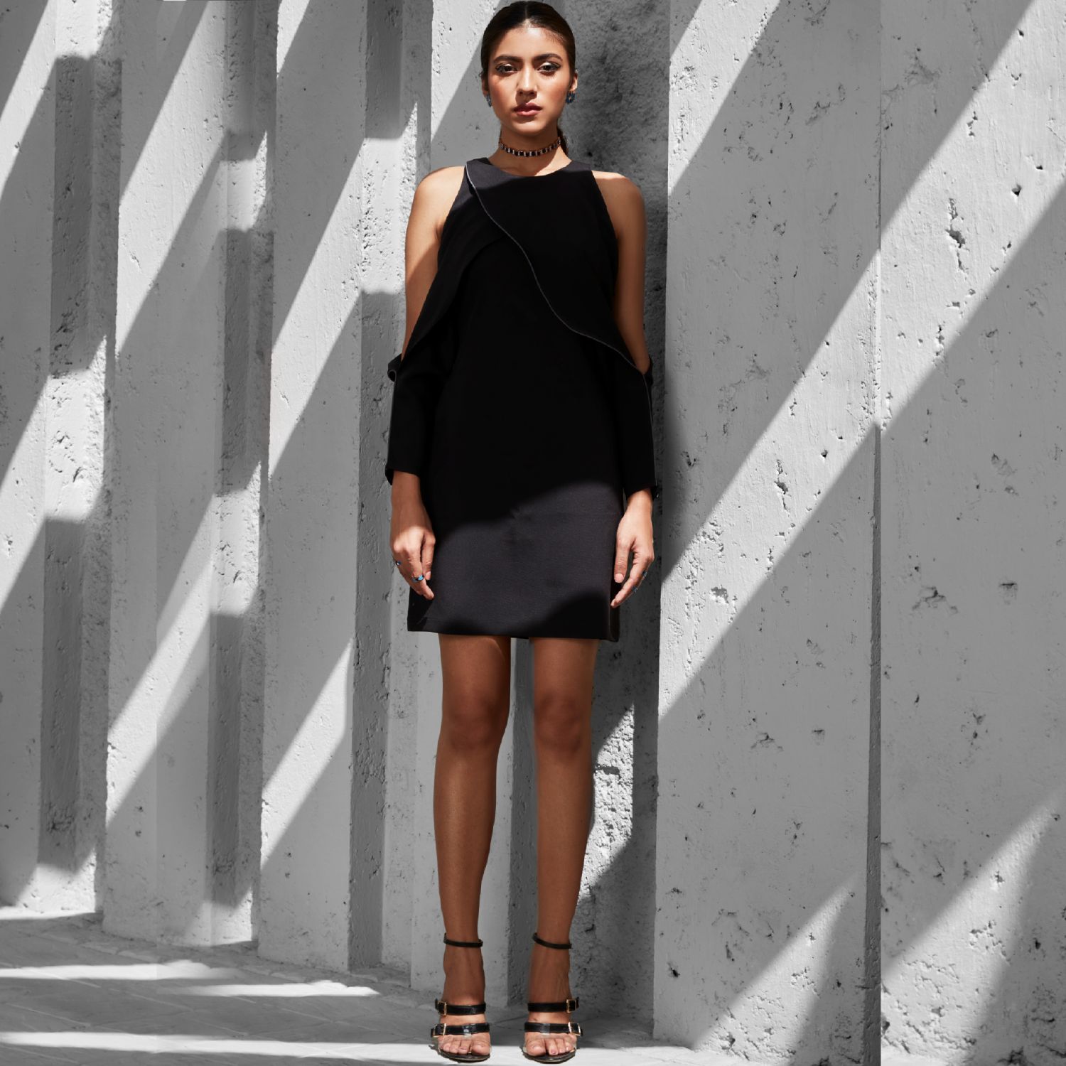 Crafted from rayon fabric, this black dress has a chic black cold shoulder shift style. The dress features a round neckline and is adorned with front and back draped panels with grey edgings. The buttoned long cuffs and a concealed back zip with a hook ensure convenience. Style this dress with gold statement earrings and contrasting heels for a dressy evening soiree.