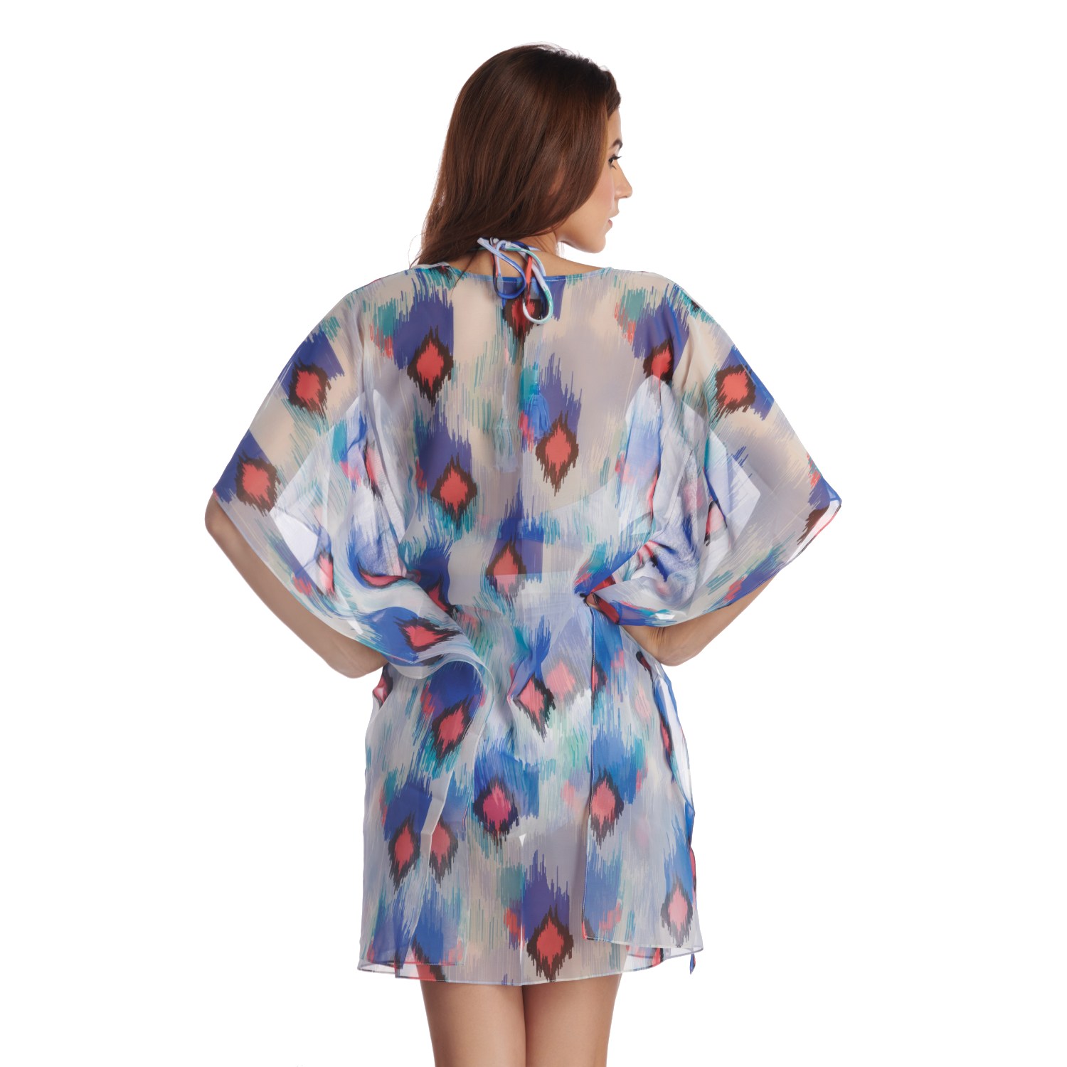 Crafted on a white georgette base, this short-length cape has a mesmerizing ikat print in shades of blue, sea green, and pink. Its lightweight fabric ensures comfort, making it a perfect layering piece for various occasions. Style it with beaded jewellery and a sun hat for a boho look.
