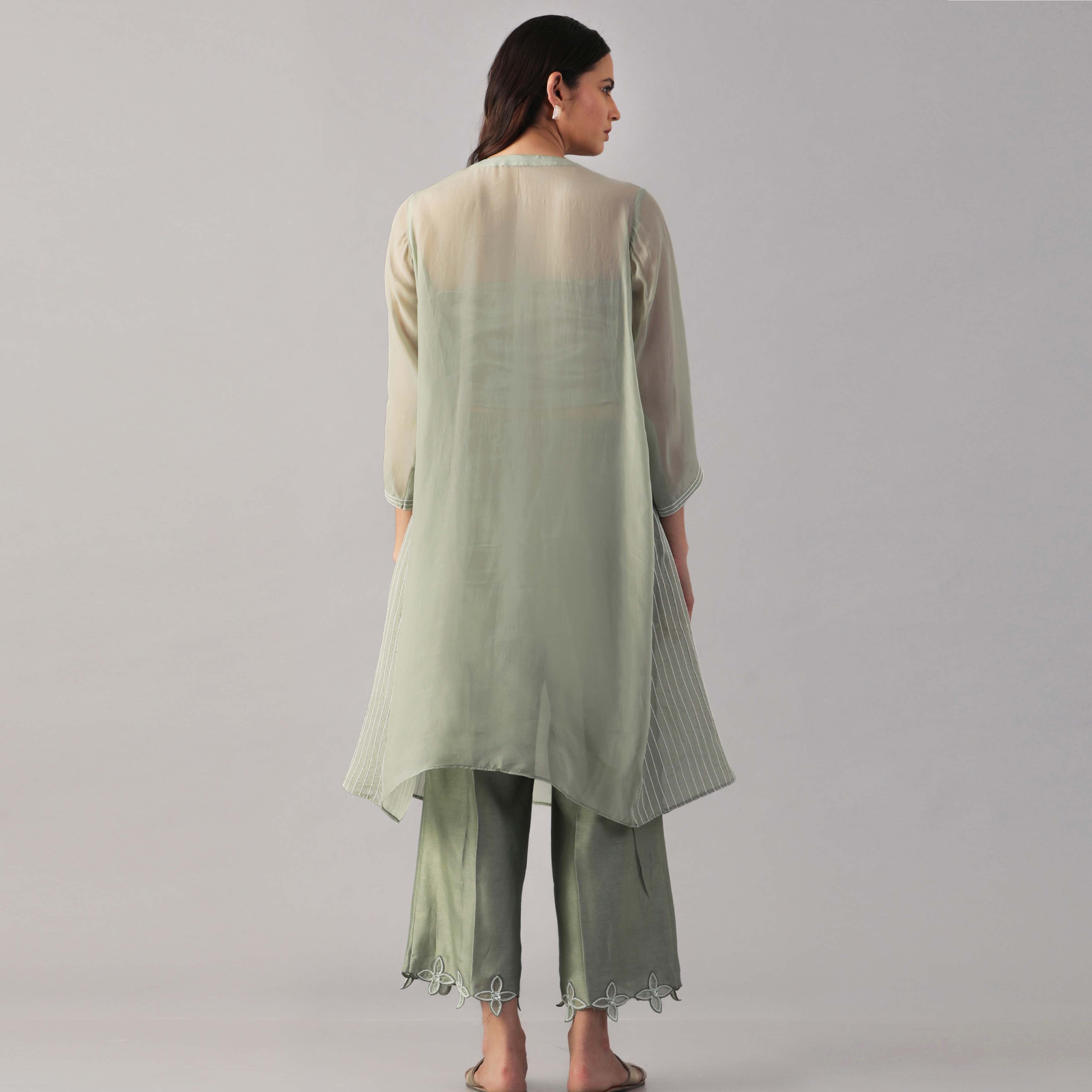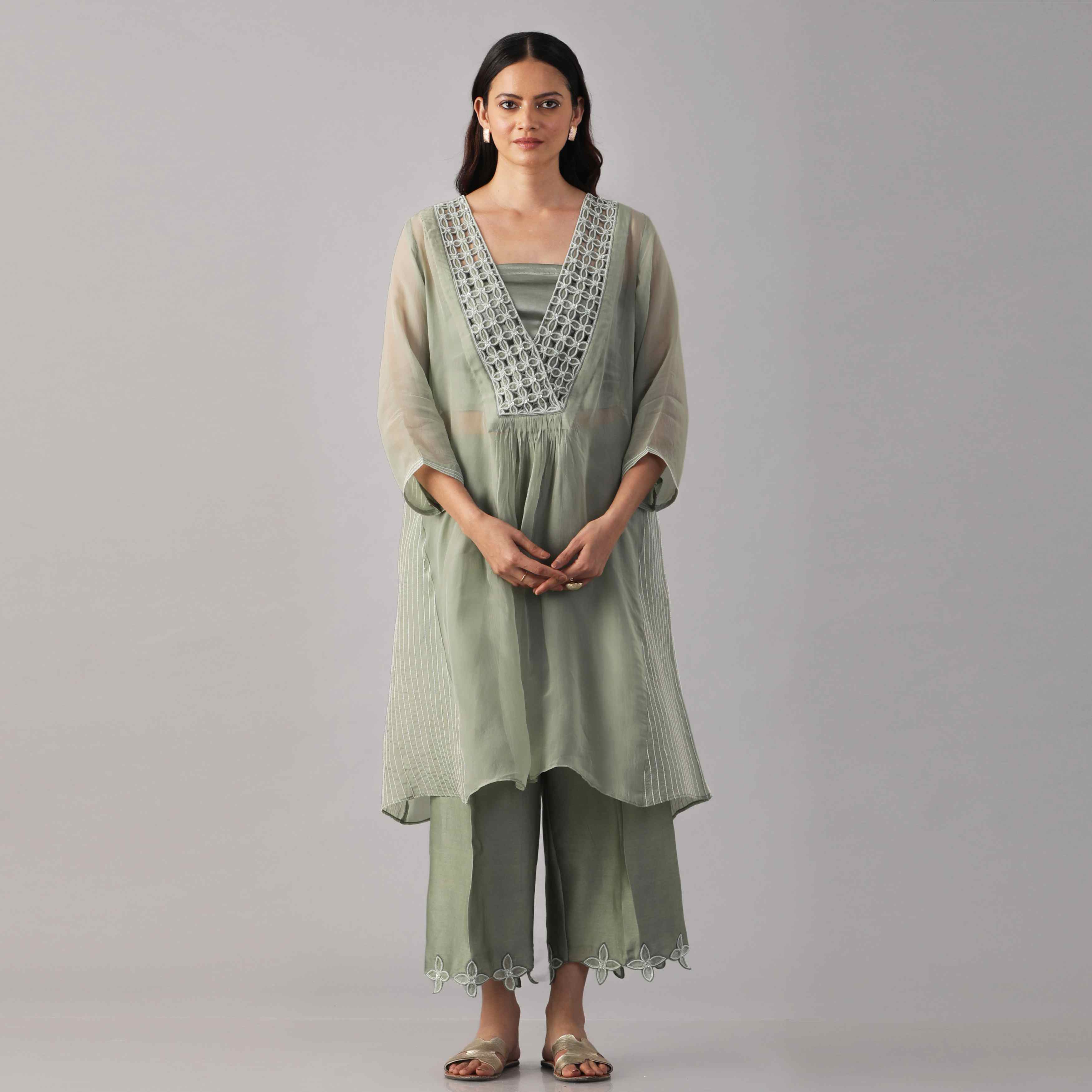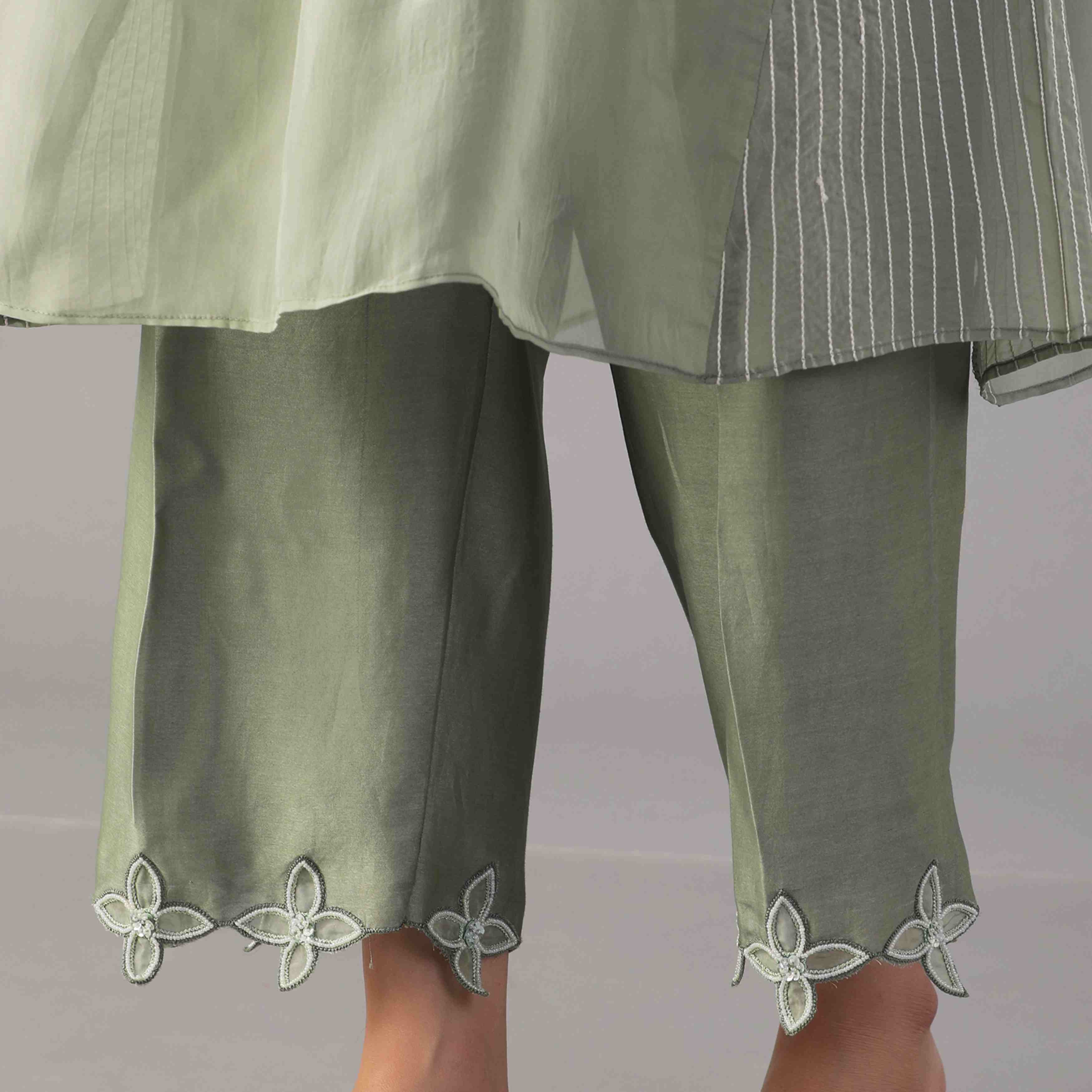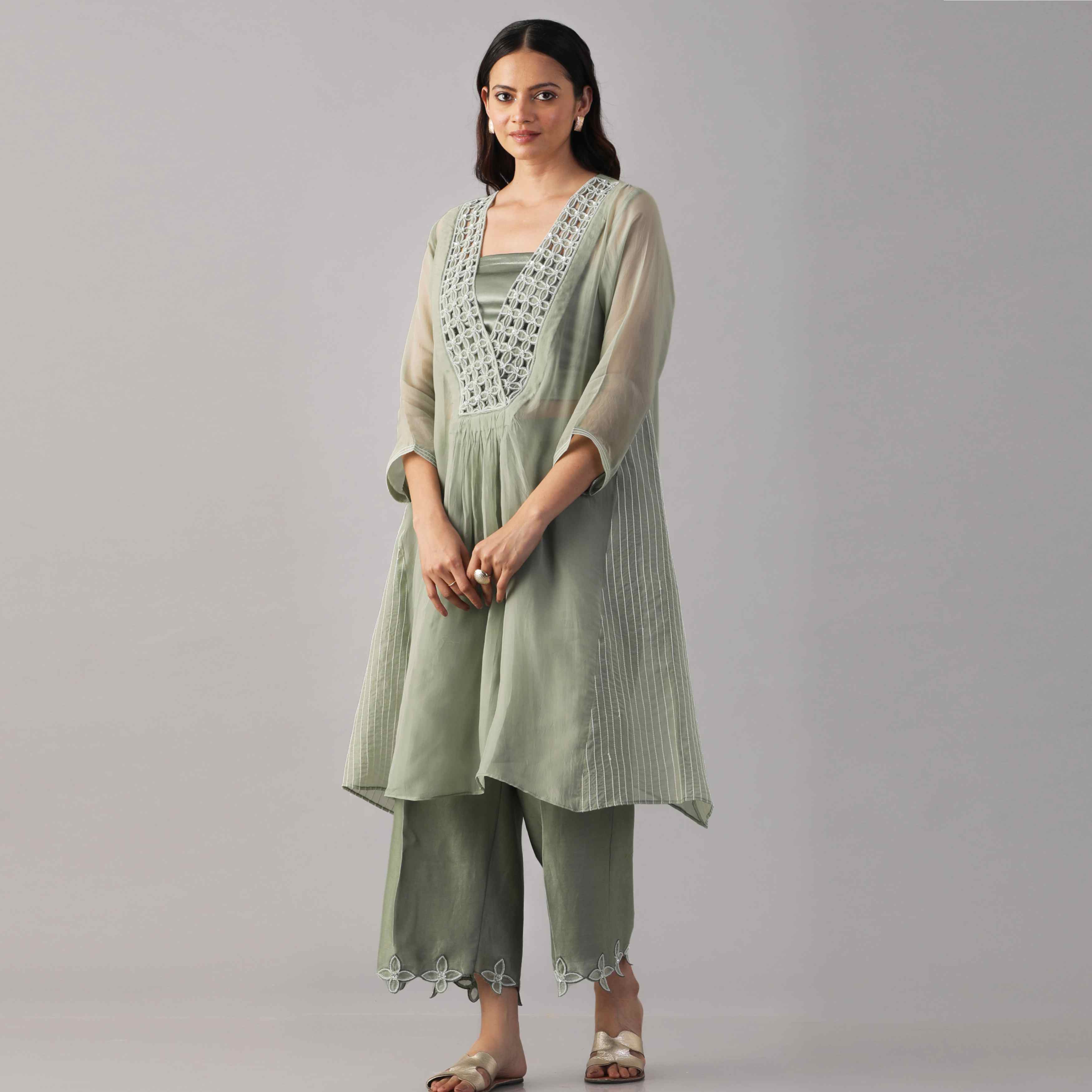 Crafted from sheer organza fabric in a sage green shade, the tunic features a flattering v-neckline, exquisite embroidery and a flowy silhouette. The bustier is crafted from lycra satin, offering comfort and figure-hugging fit. The set is completed with the embroidered pants made from chanderi silk, adding style and finesse to the outfit.