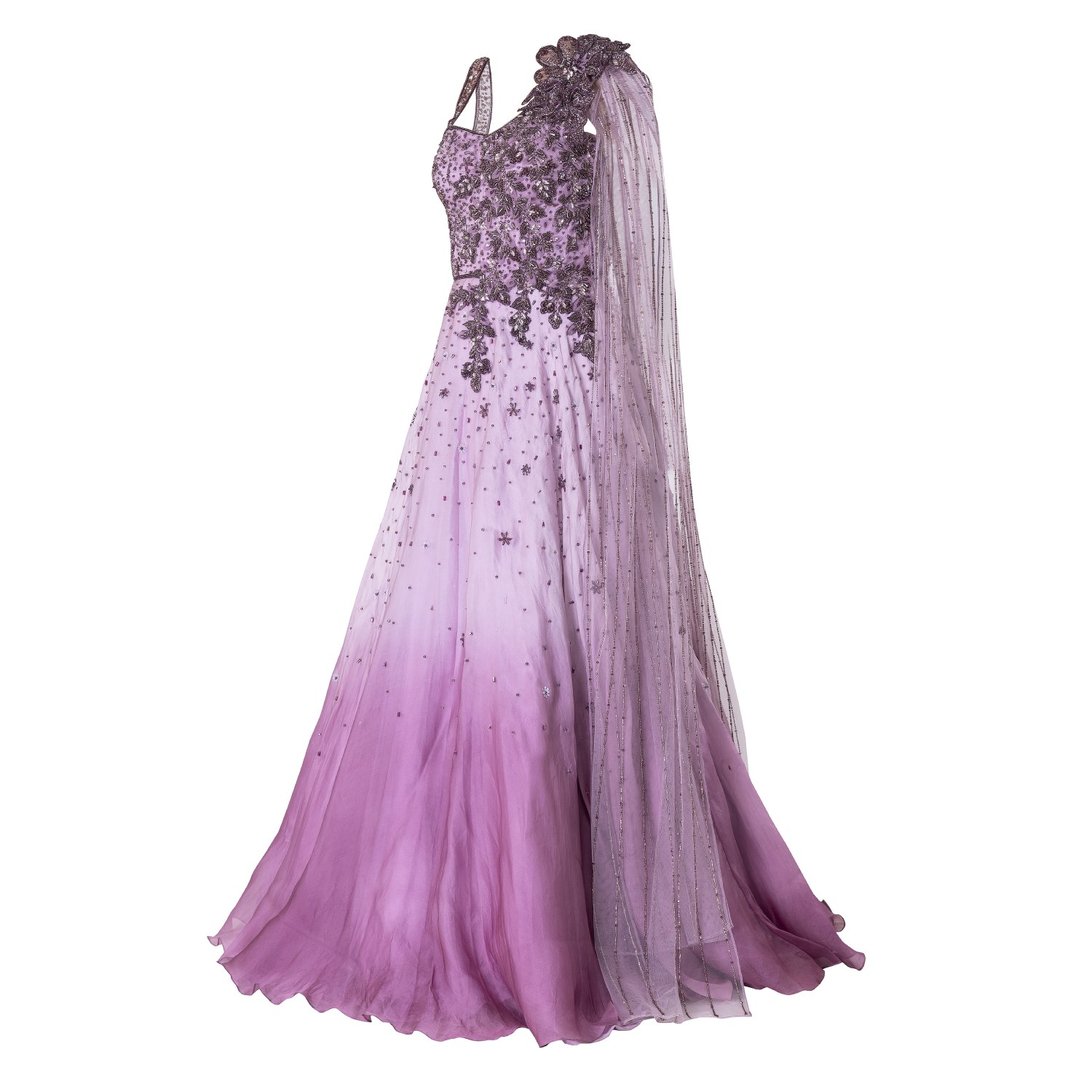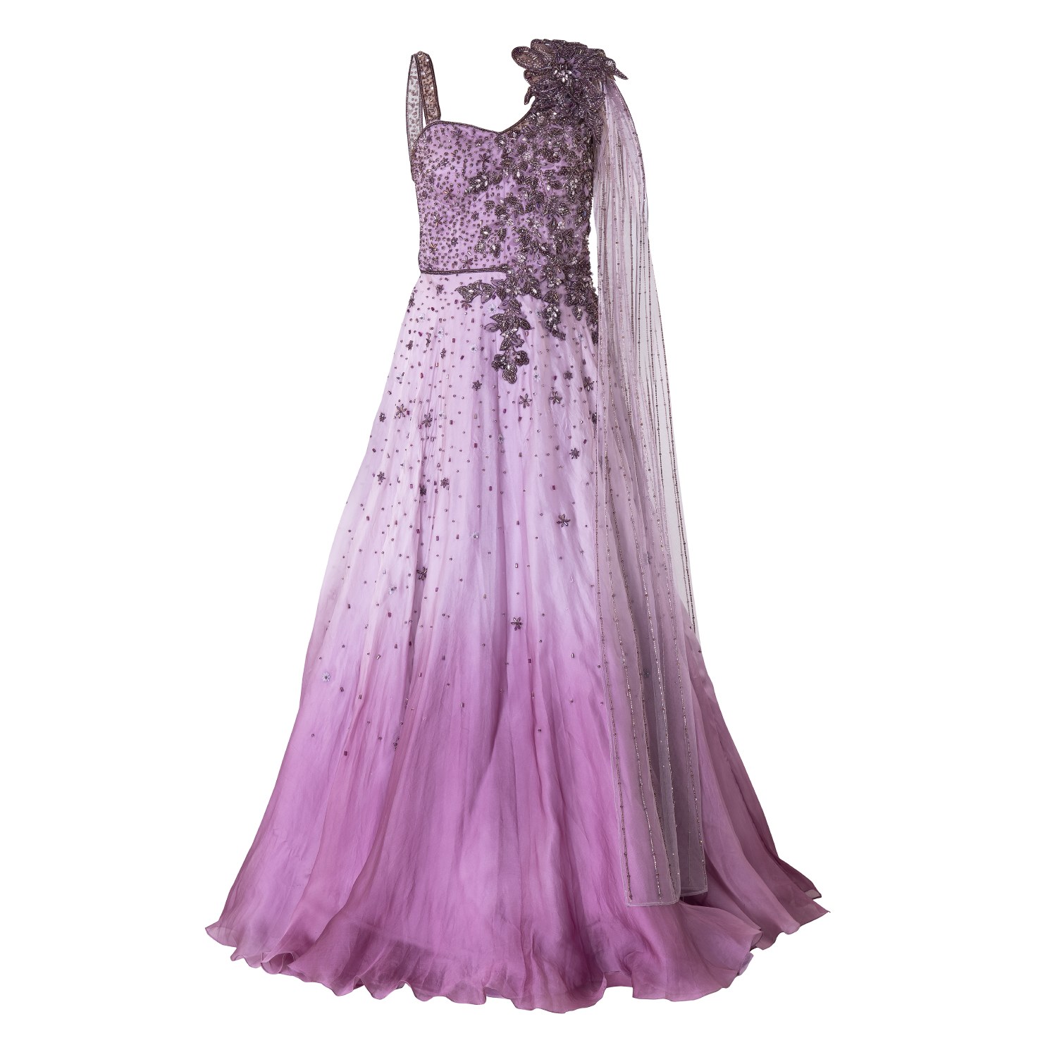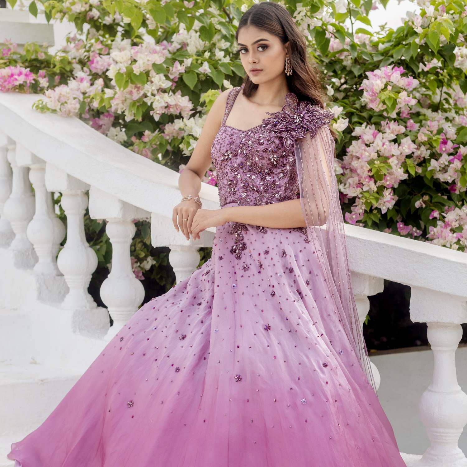 This glamorous gown is a combination of magenta and blush shades and has a soft silhouette. The bodice is adorned with a 3D embroidered motif and a hand-embroidered drape on one side. The skirt is made with a combination of satin organza and net, further enhanced with stones, 3D fabric embroidery, and crystals.