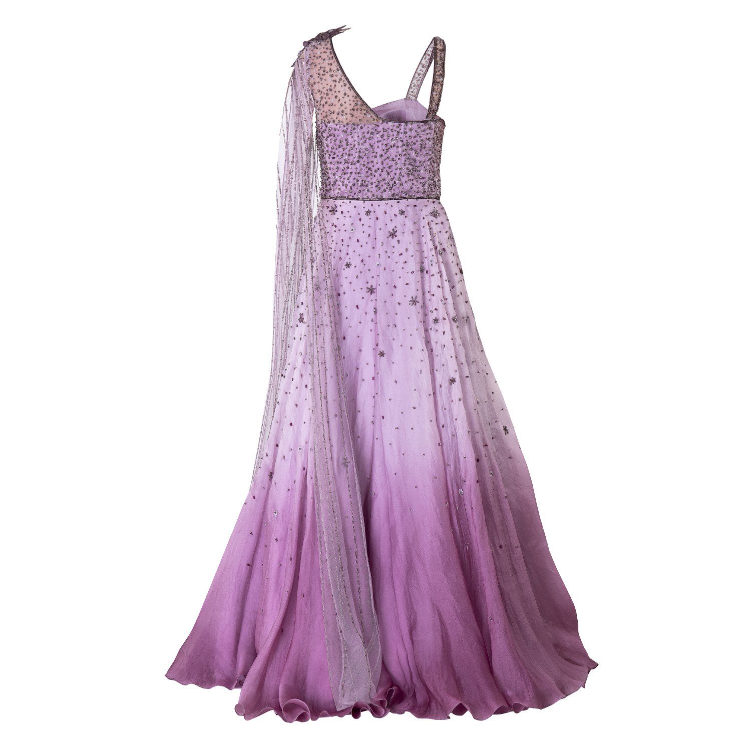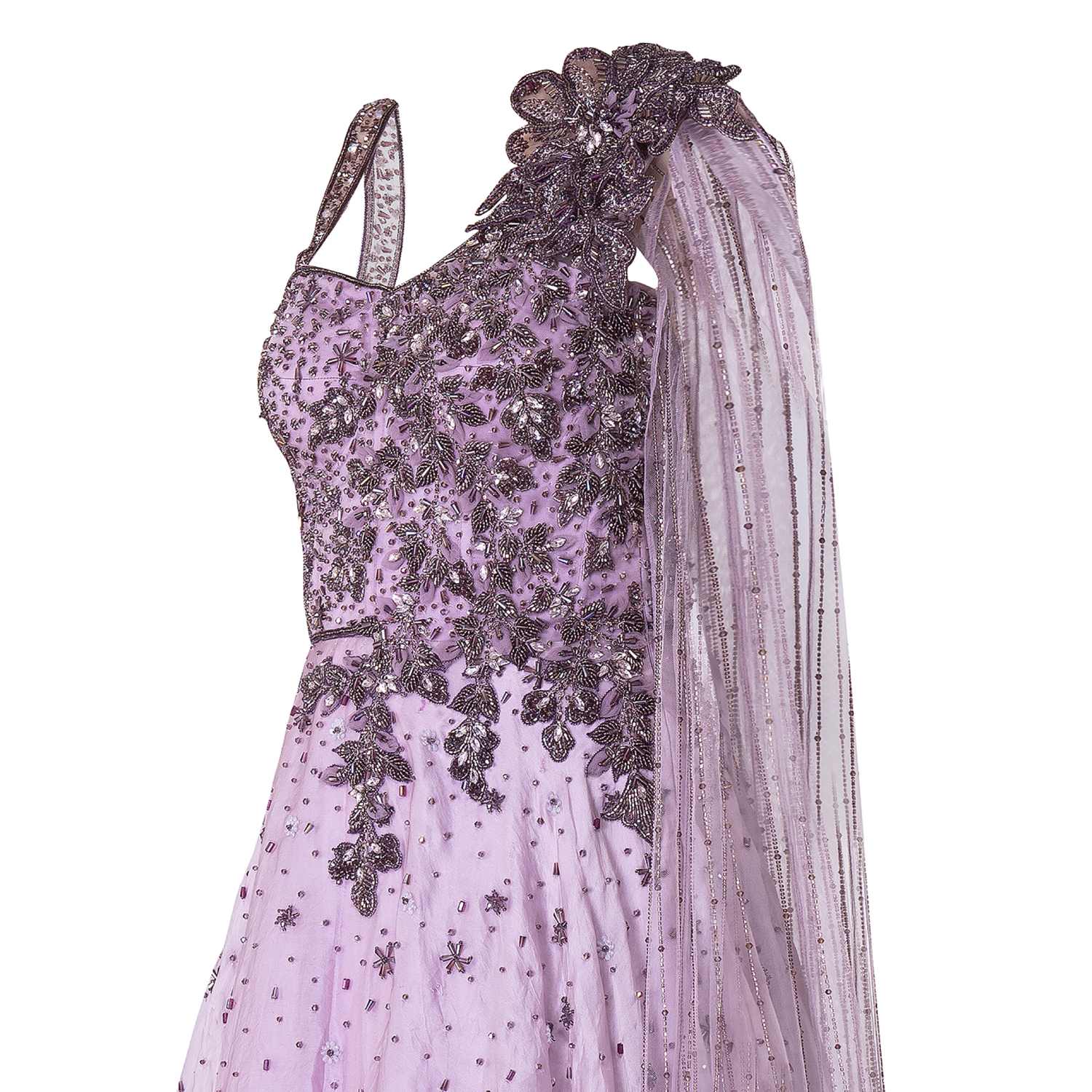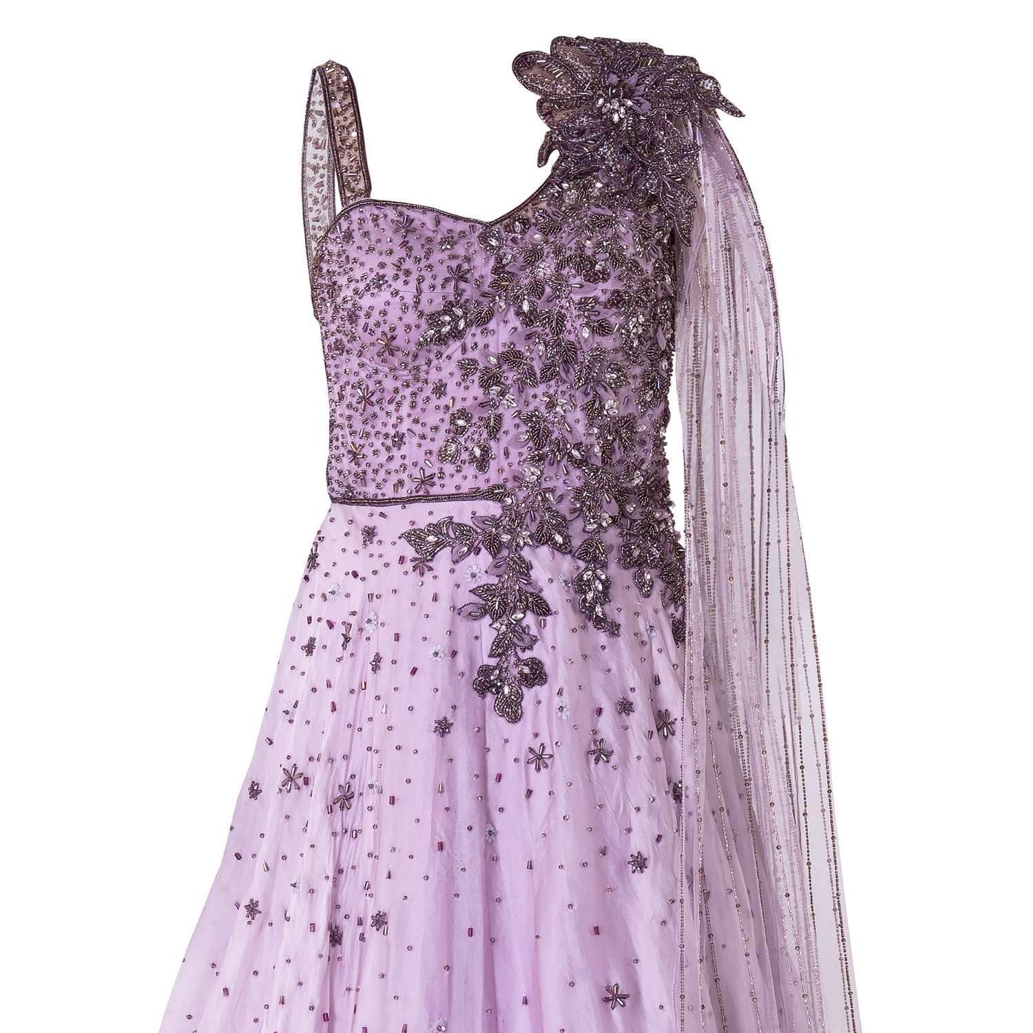 This glamorous gown is a combination of magenta and blush shades and has a soft silhouette. The bodice is adorned with a 3D embroidered motif and a hand-embroidered drape on one side. The skirt is made with a combination of satin organza and net, further enhanced with stones, 3D fabric embroidery, and crystals.