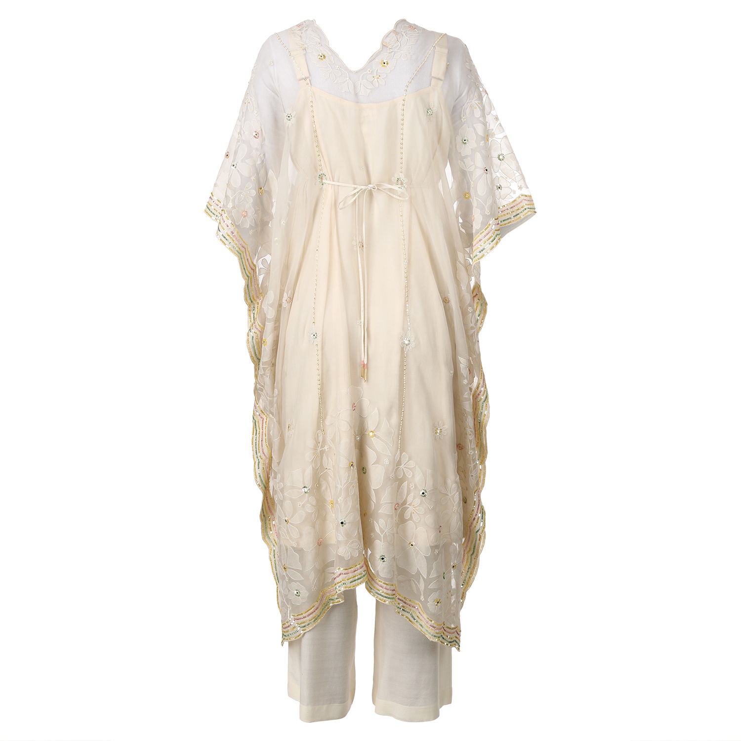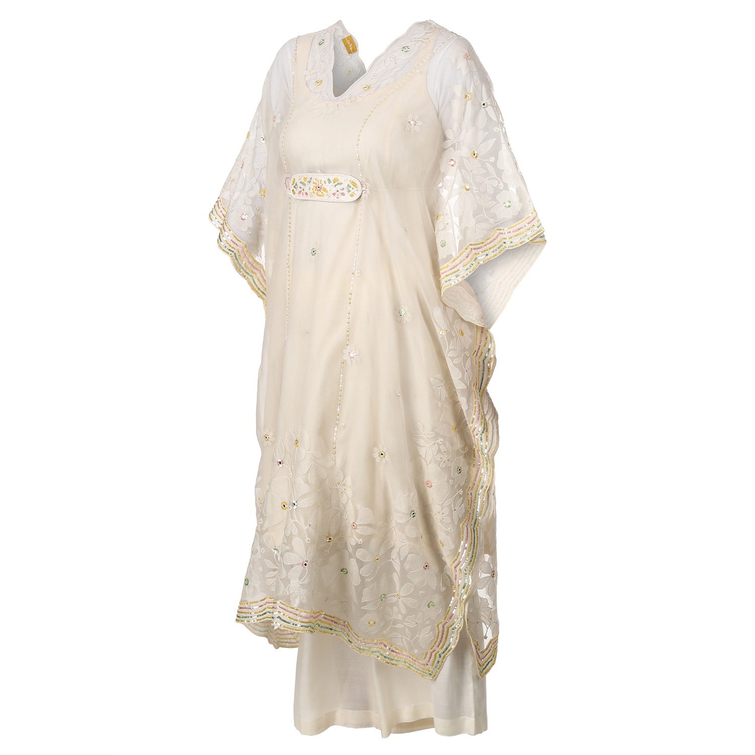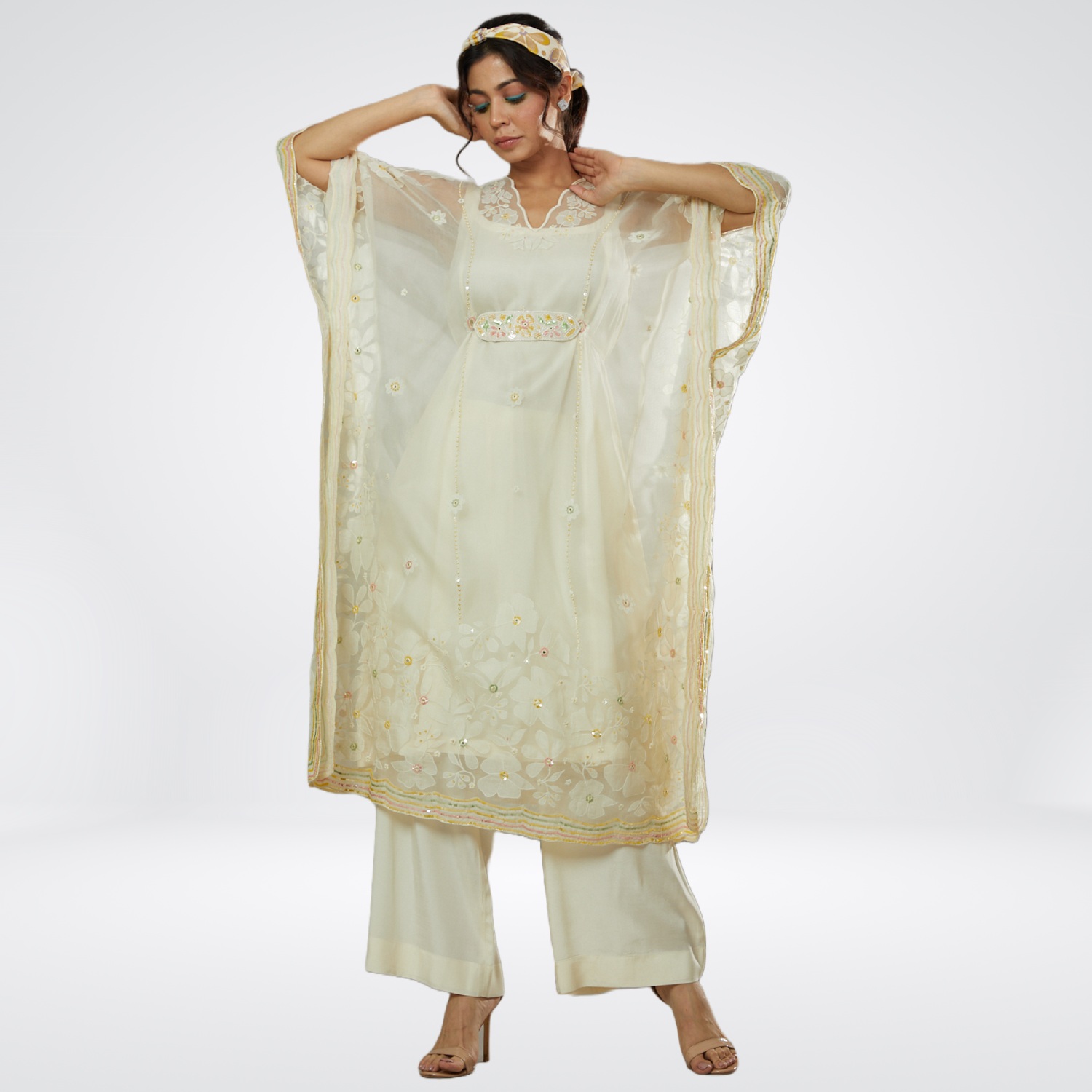 Get ready to elevate your wardrobe with our ivory applique silk organza kaftan set! Hand-embroidered with cutdana and colorful sequins, this stunning outfit comes complete with a slip, parallel pants, and belt.