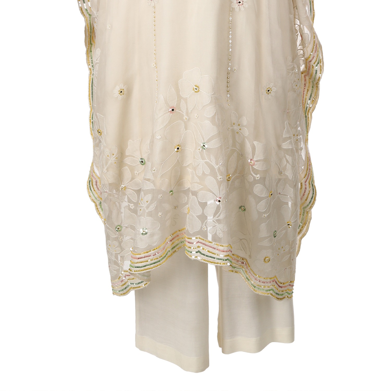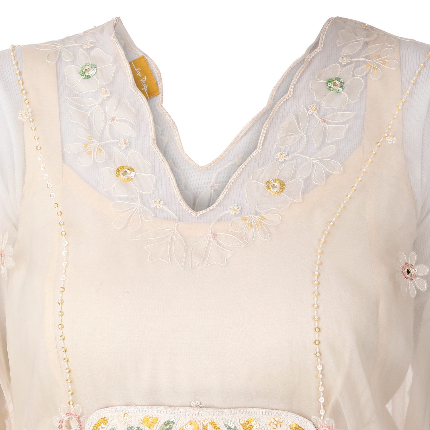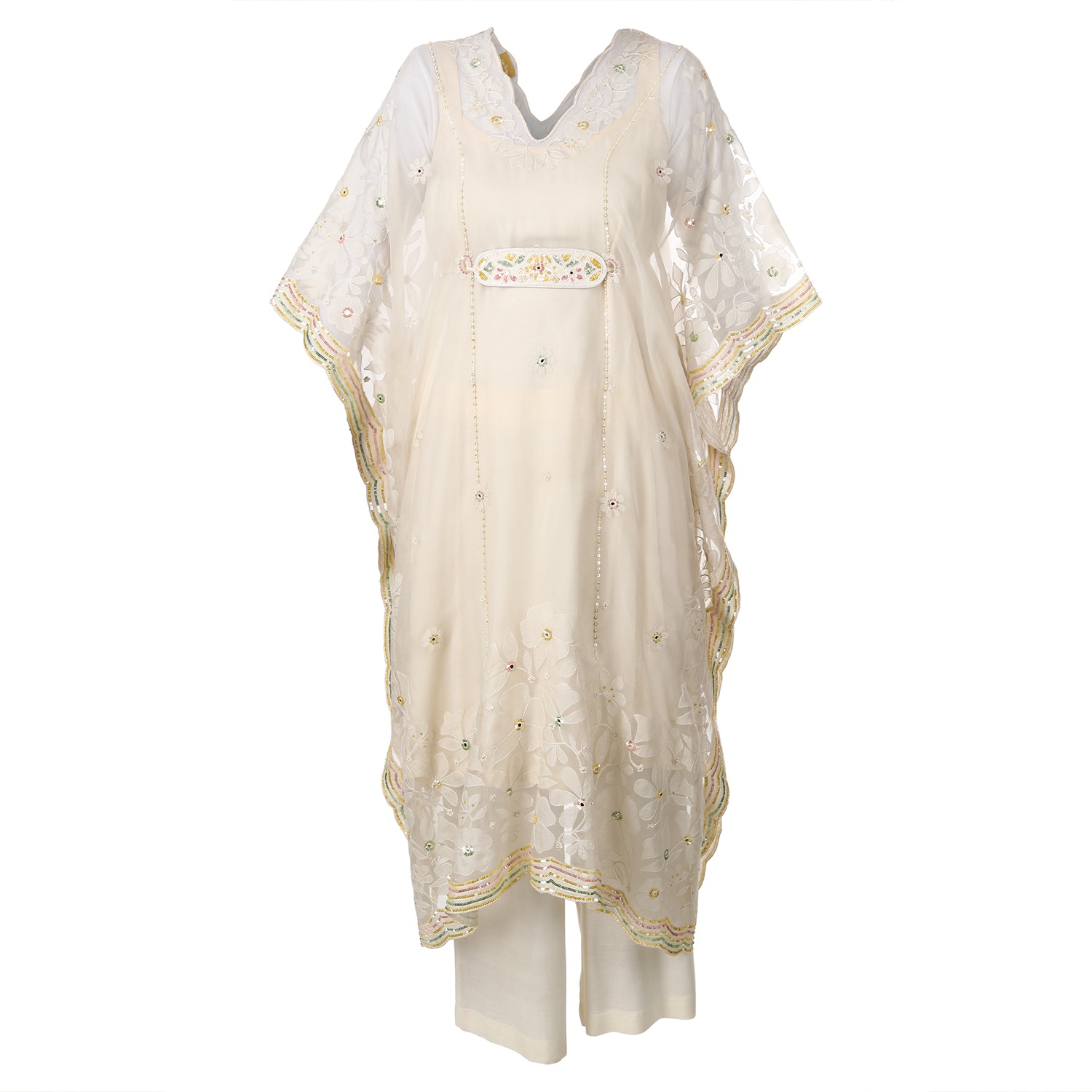 Get ready to elevate your wardrobe with our ivory applique silk organza kaftan set! Hand-embroidered with cutdana and colorful sequins, this stunning outfit comes complete with a slip, parallel pants, and belt.