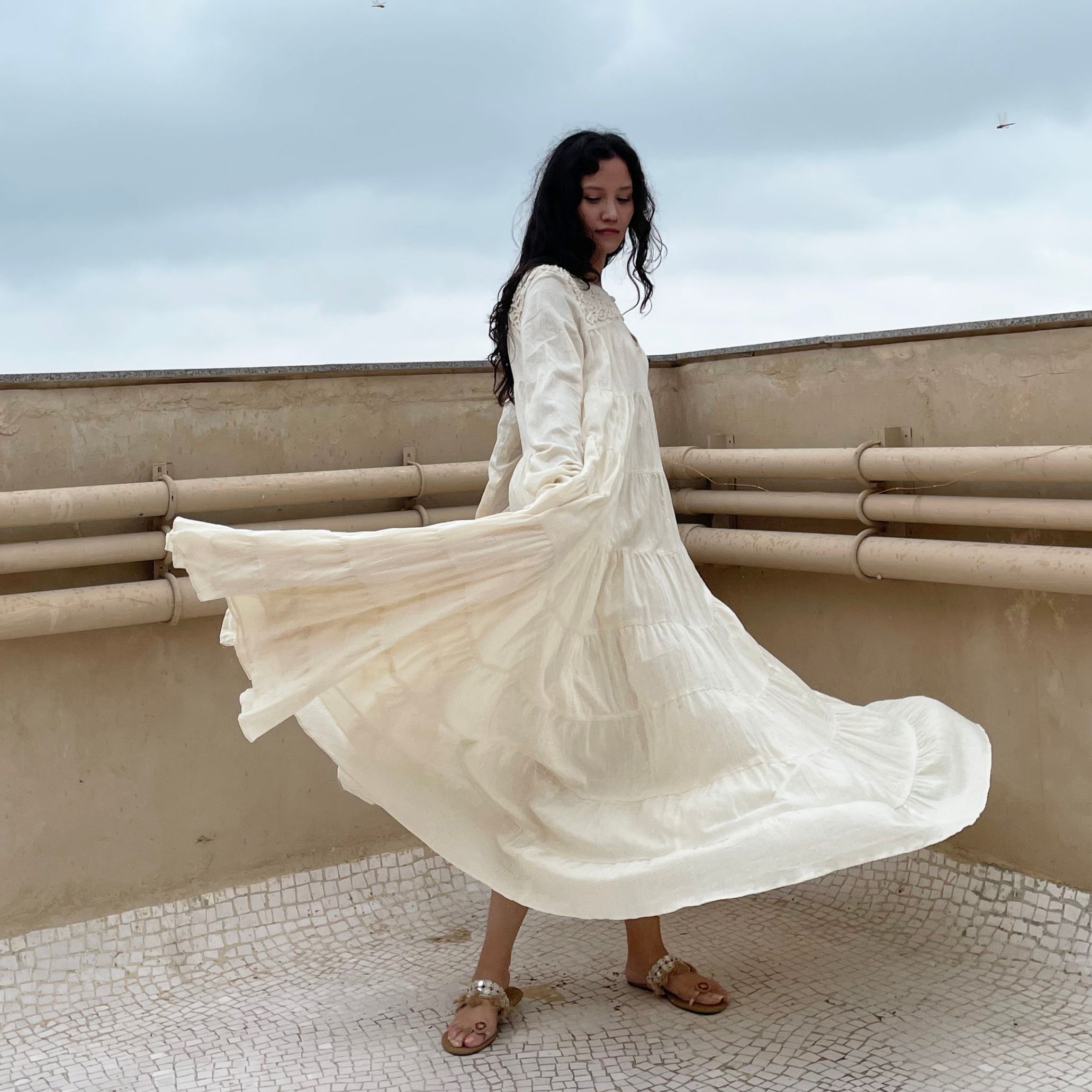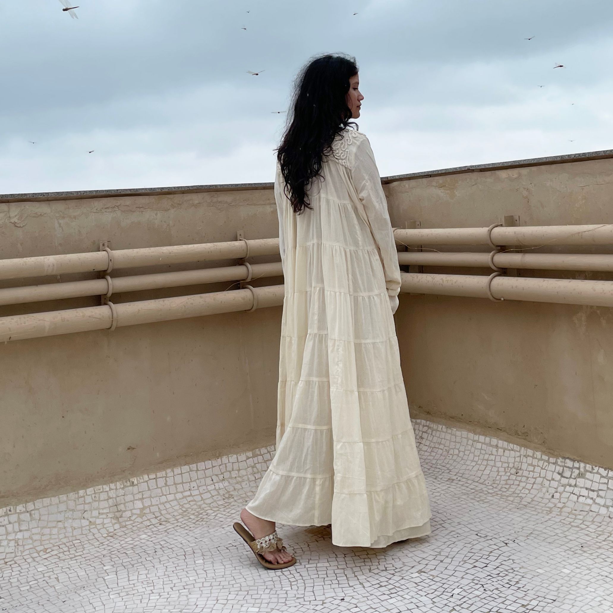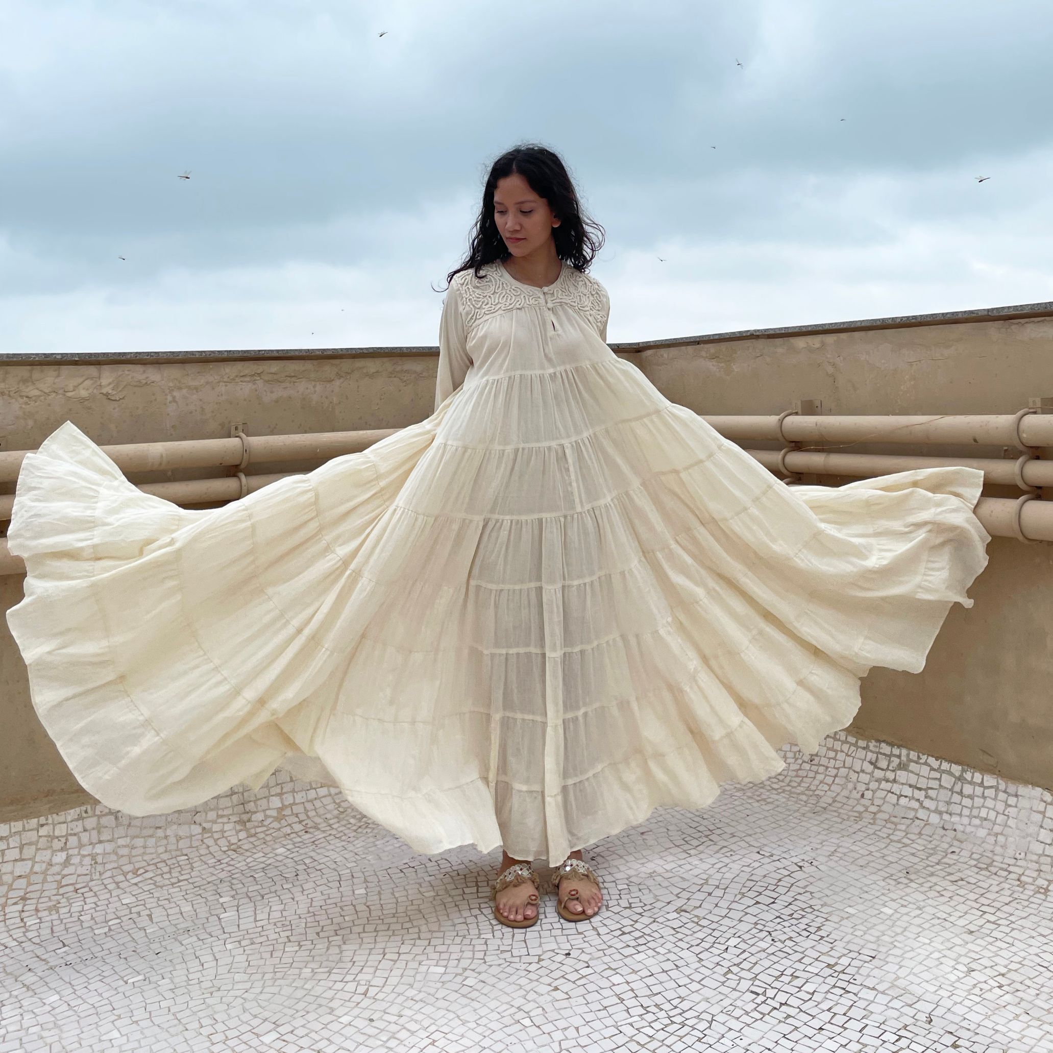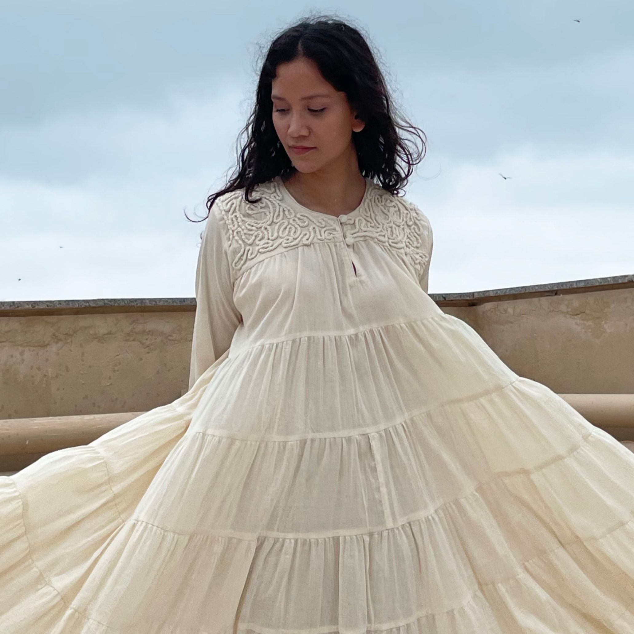 Indulge in opulent charm with our ivory voluminous tiered chudi sleeves dress. Adorned with intricate couching embroidery on the yoke, this dress effortlessly combines elegance and flair. With its voluminous tiered sleeves, it's a timeless piece that exudes grace and sophistication.