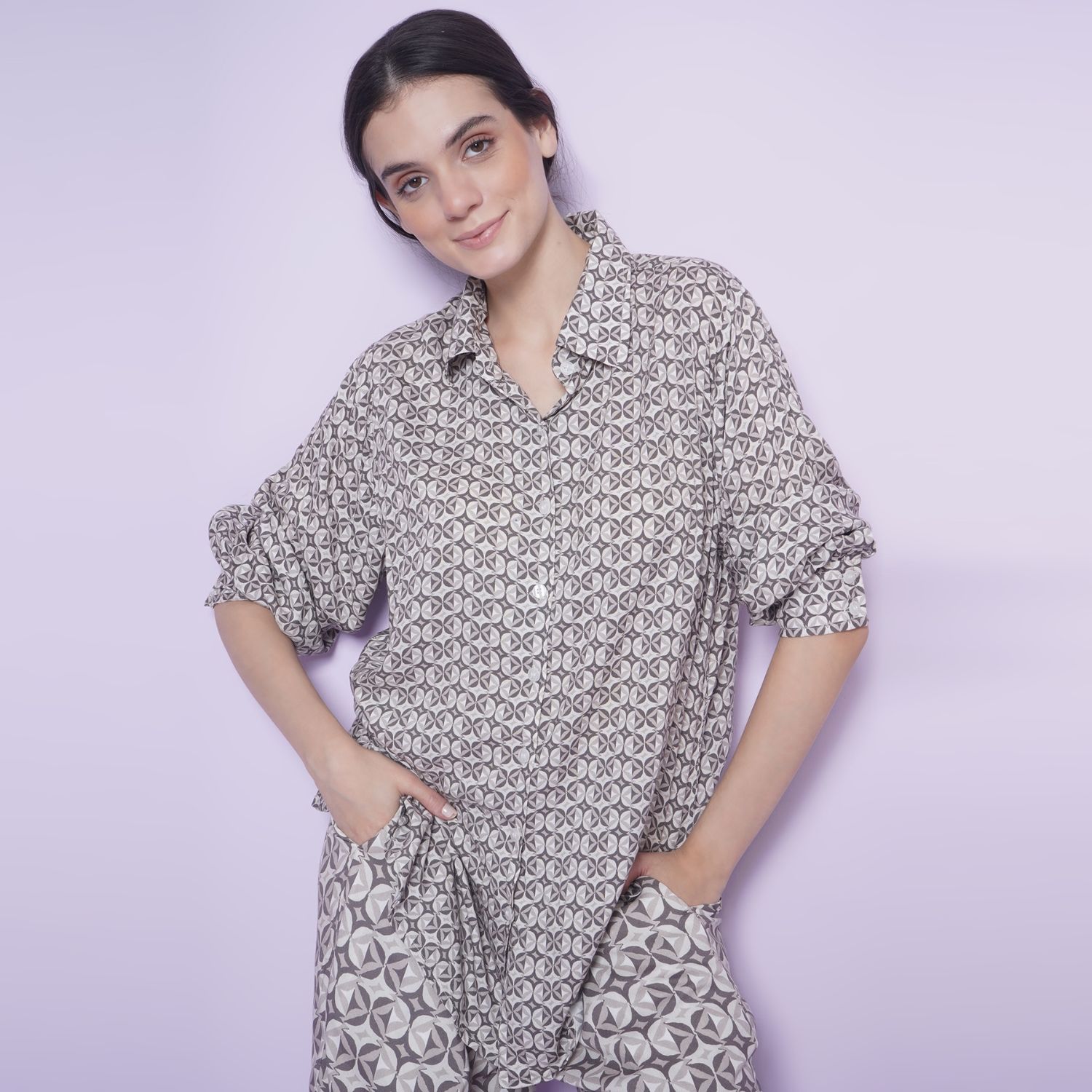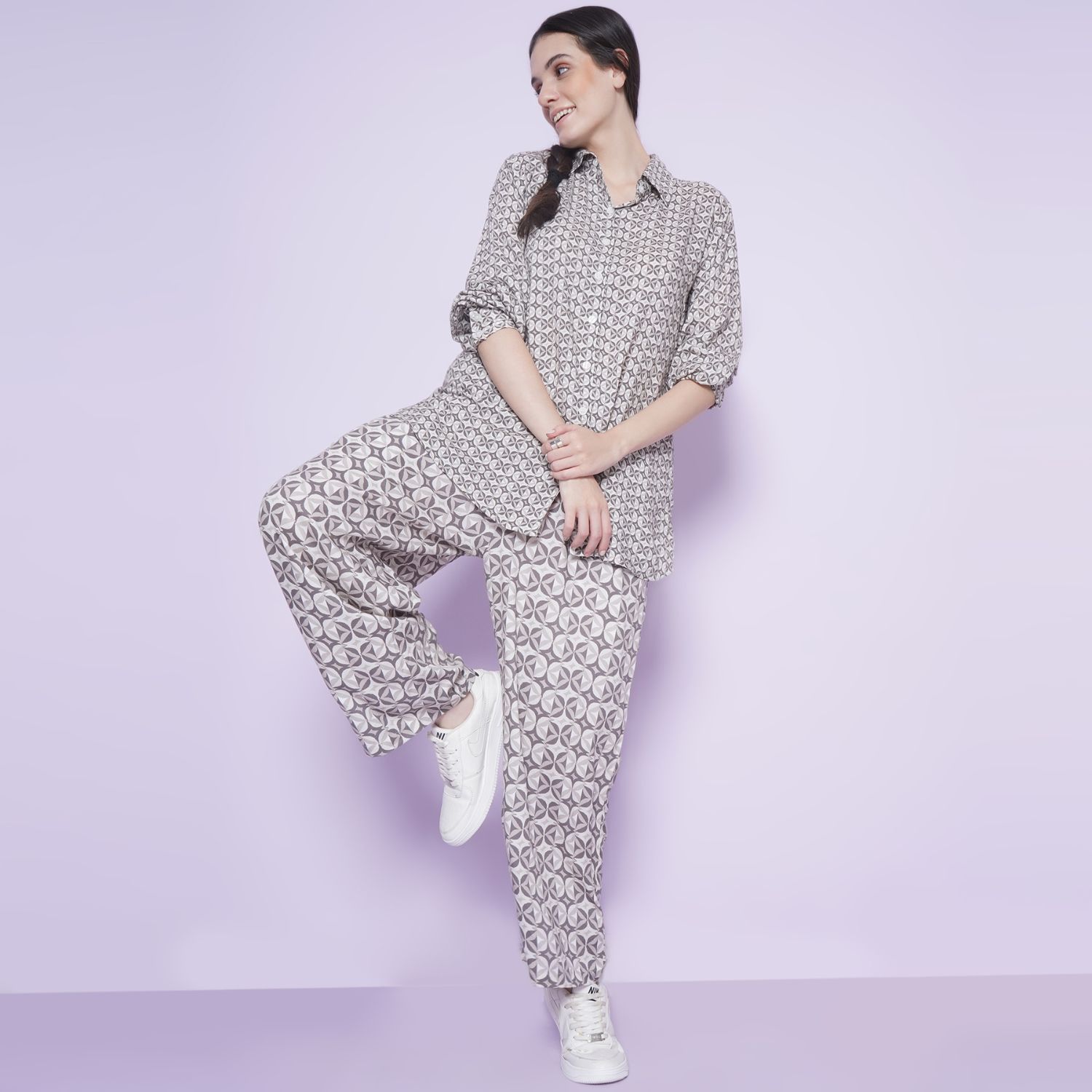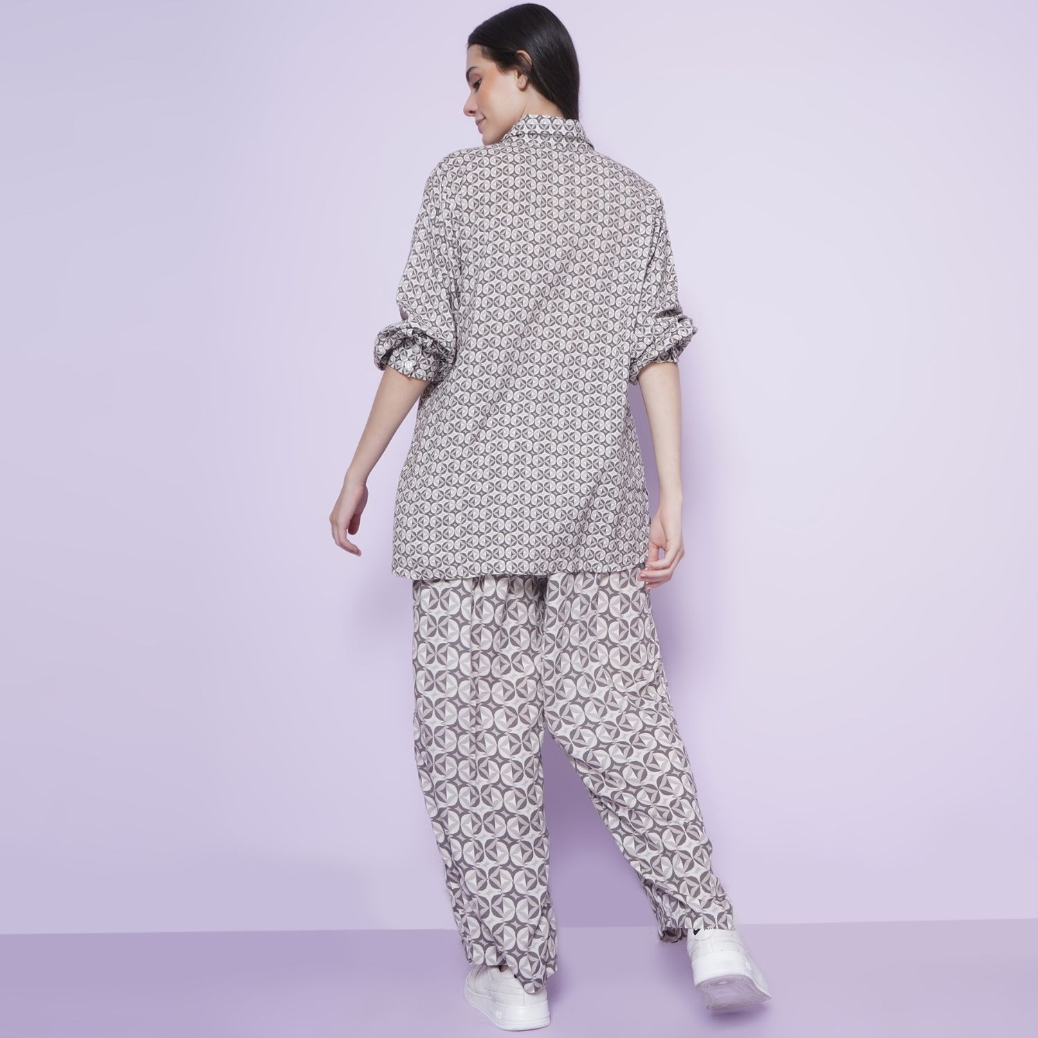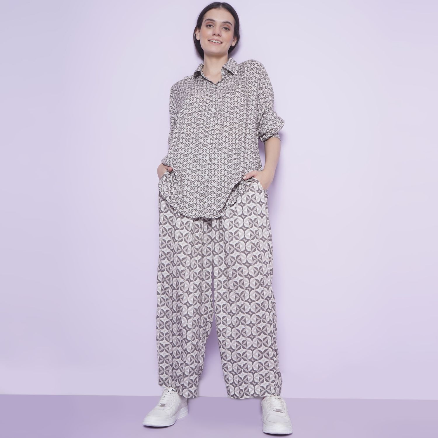 ₹ 4,312 (20% off)Crafted in a viscose blend, this set features a geometric print shirt and wide-leg pants, both in tones of grey. The shirt is designed with cuff sleeves, and the bottoms have an elasticated waist, making this set comfortable and stylish. Pair this set with white sneakers and a sling bag for a casual day with friends.