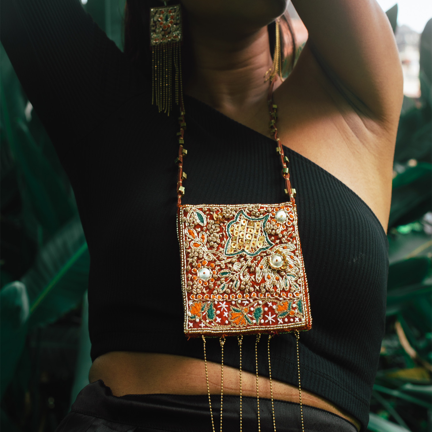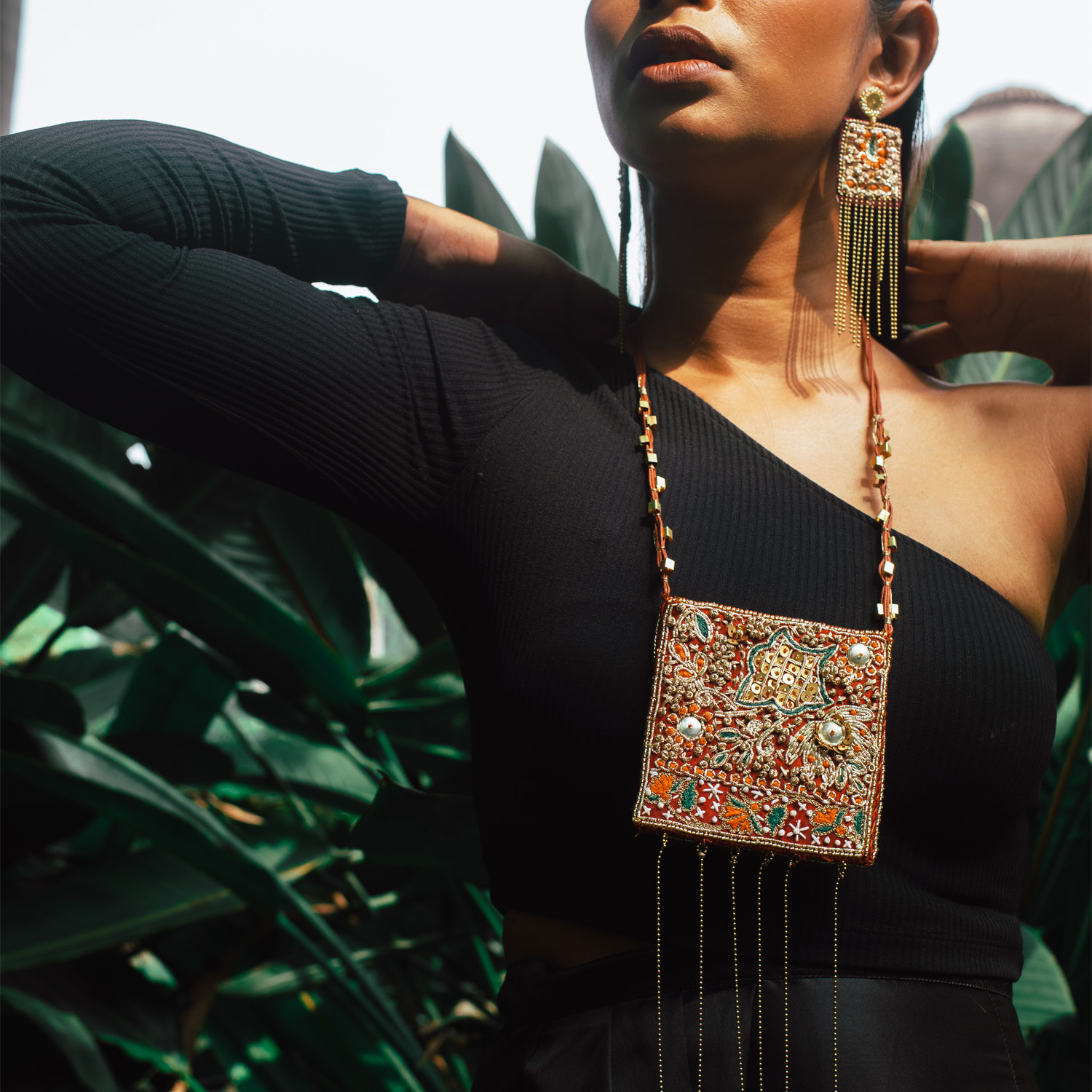 ₹ 4,015 (10% off)This hand-embroidered necklace features intricate detailing with metal wire, creating an elegant design. The necklace has detailed threadwork in bright hues and is secured with a dori closure, allowing for a comfortable fit.