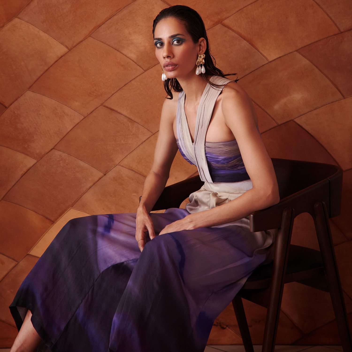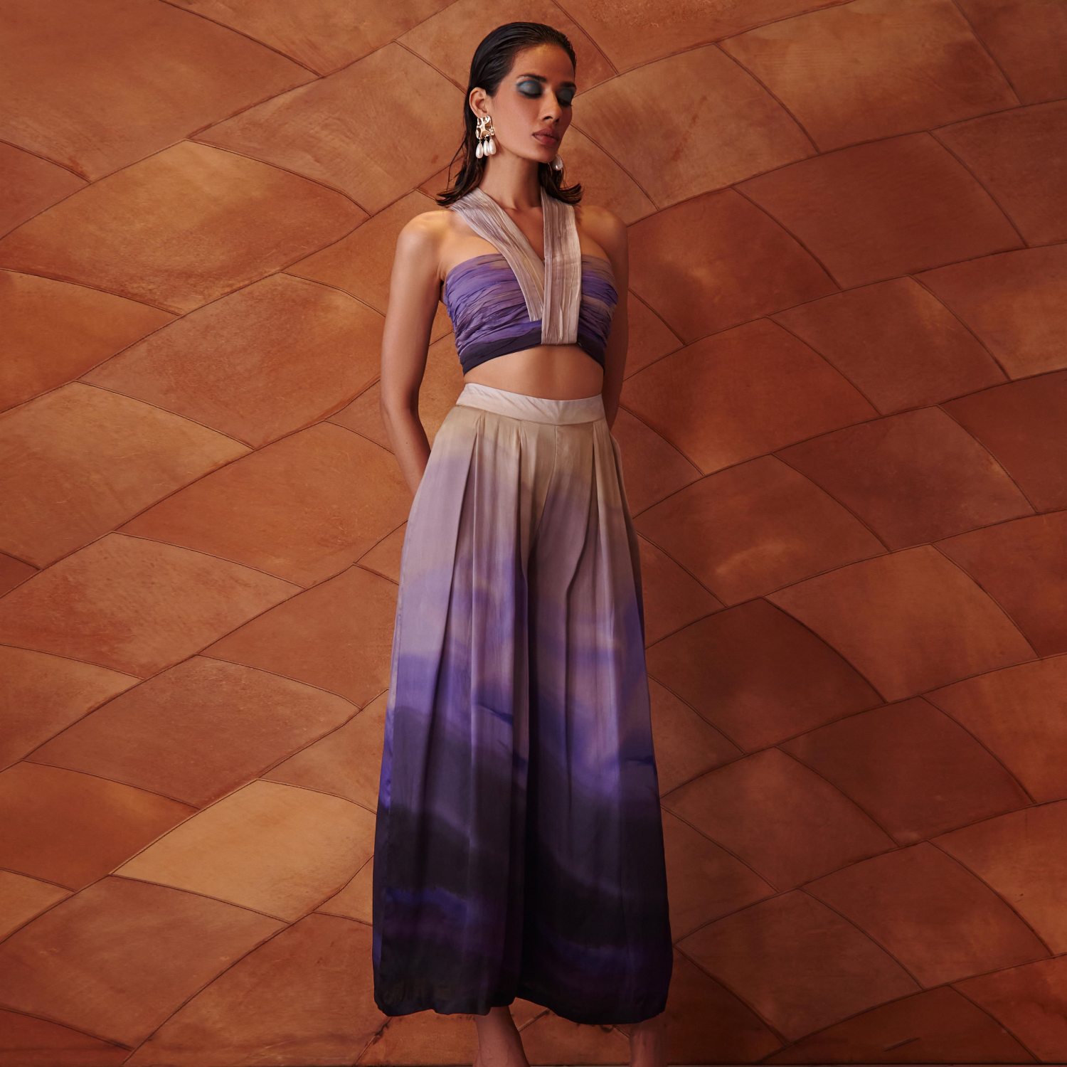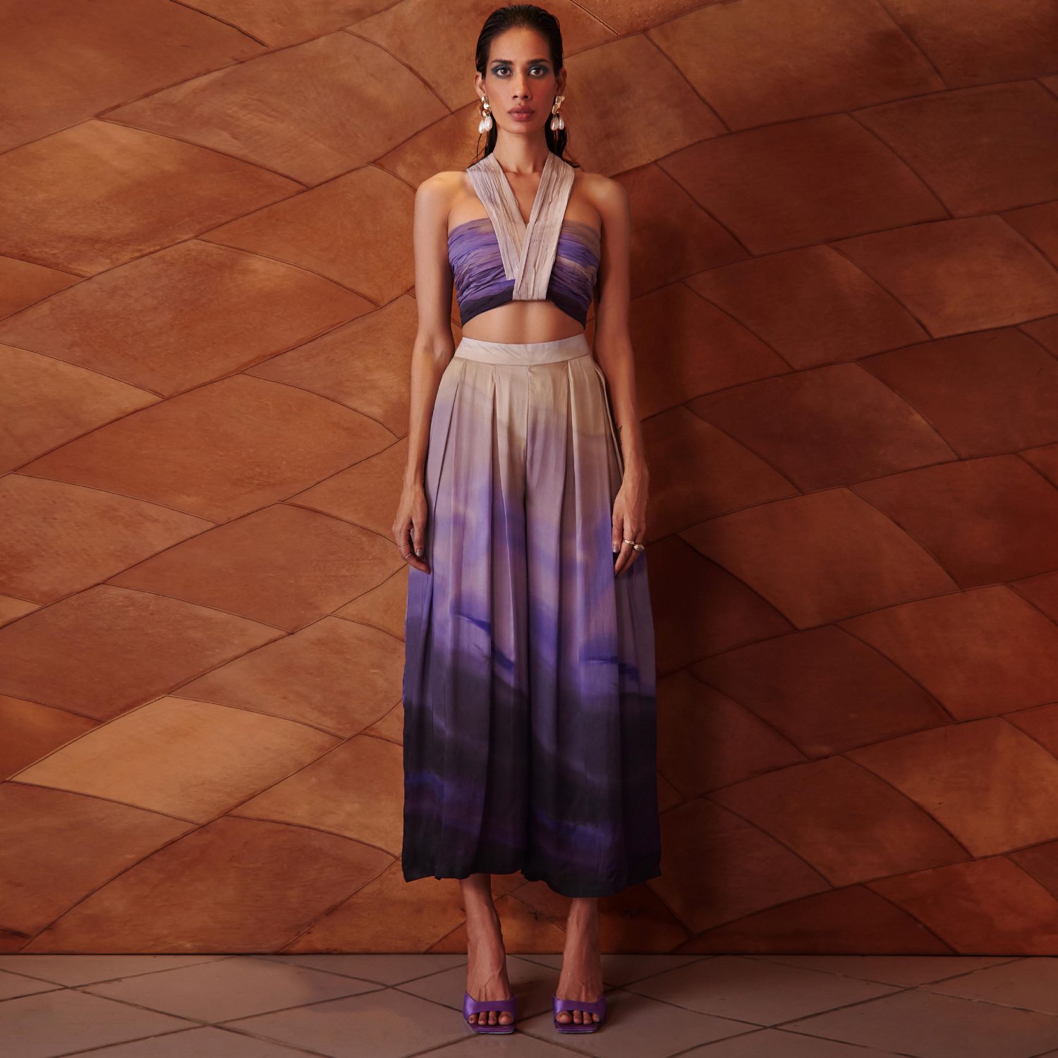 Crafted from high-quality rayon fabric, this printed crop top comes in a stunning violet shade. This top features a pleated grecian v-neck, crisscross back straps and a back metal zip, offering convenience and easy wear. Pair it with statement earrings and strappy heels for a dressy soiree.