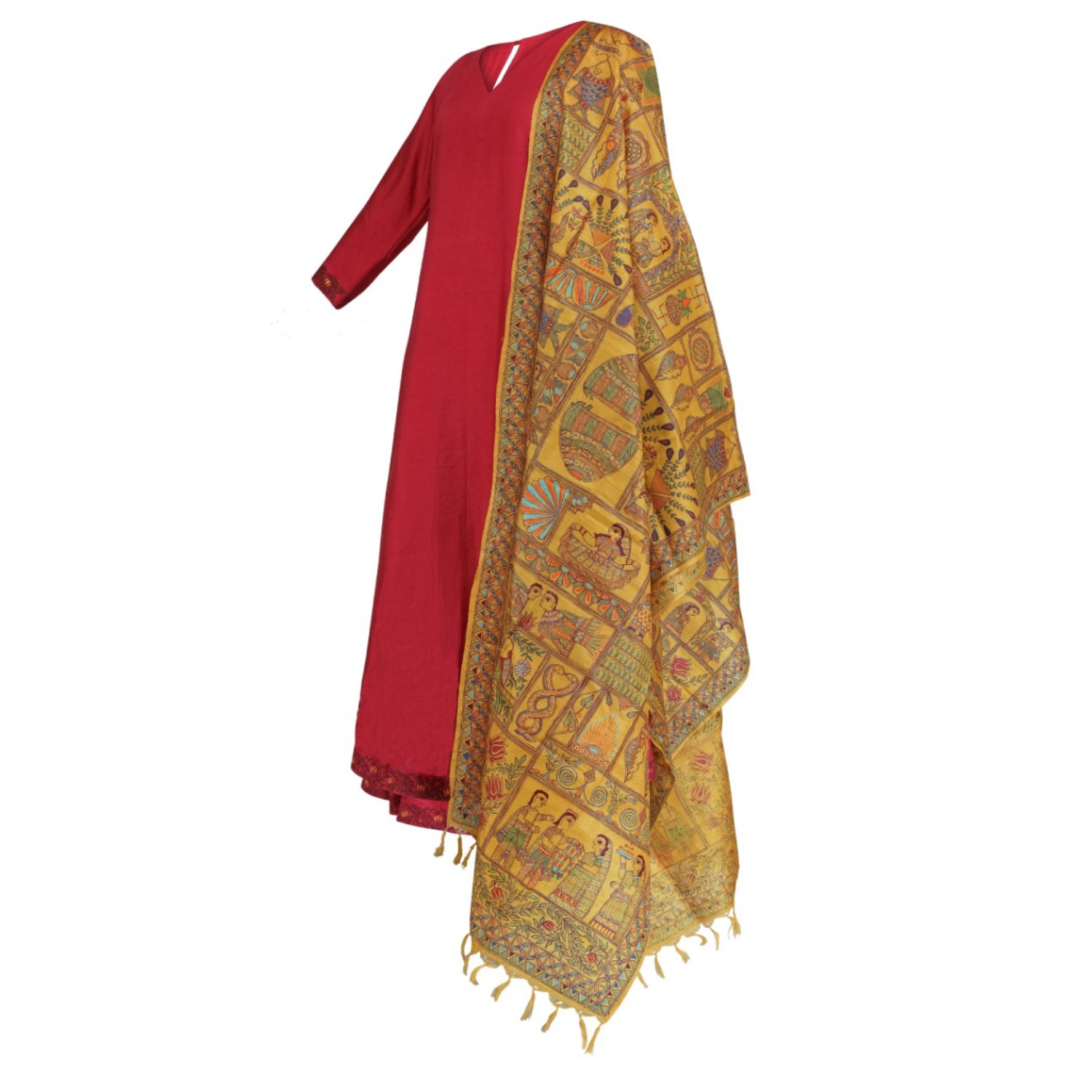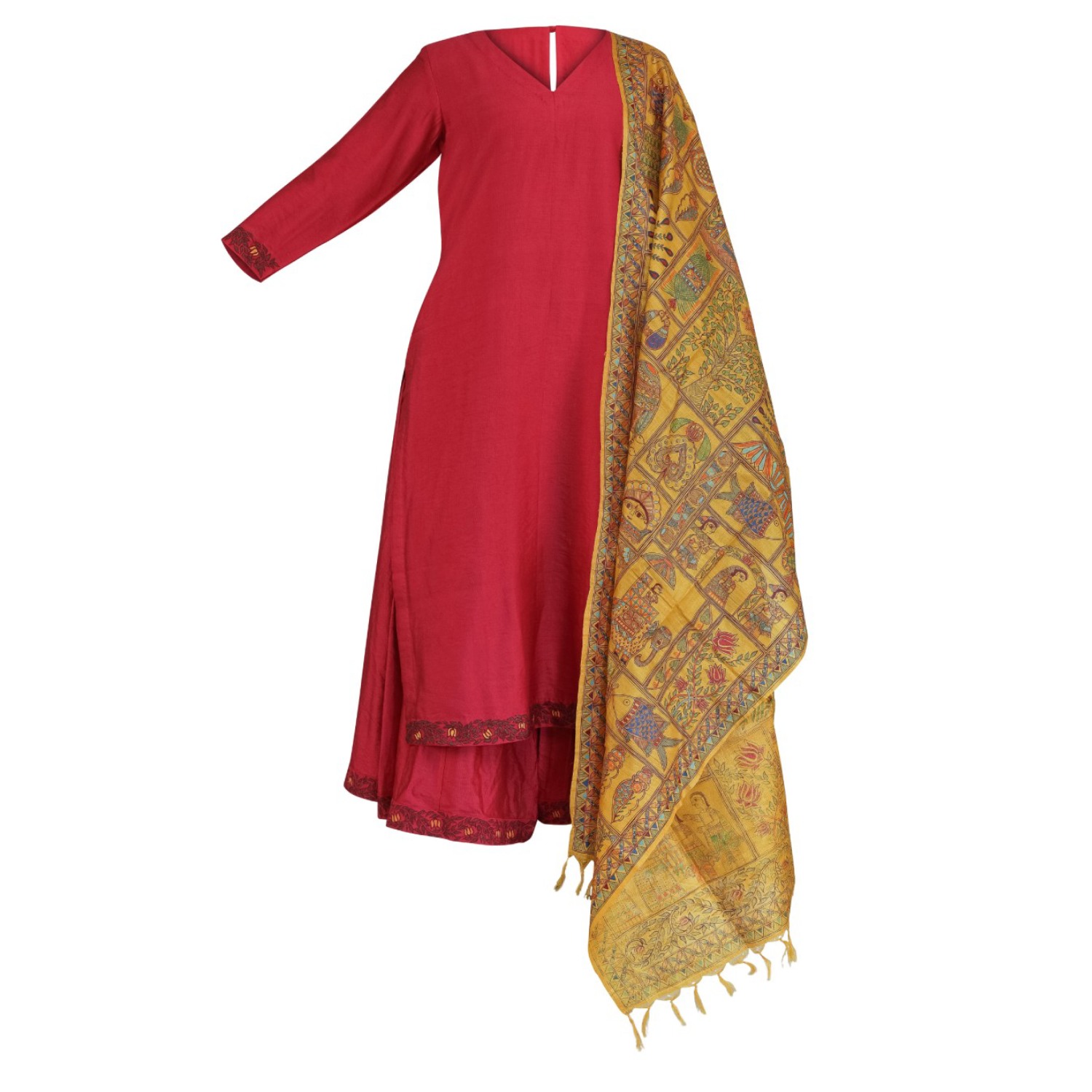 A magenta kurta sharara cut in luscious linen silk fabric is paired with a yellow Madhubani dupatta made out of tussar silk that depicts the beauty of traditional Indian wedding elements and classic Madhubani designs.