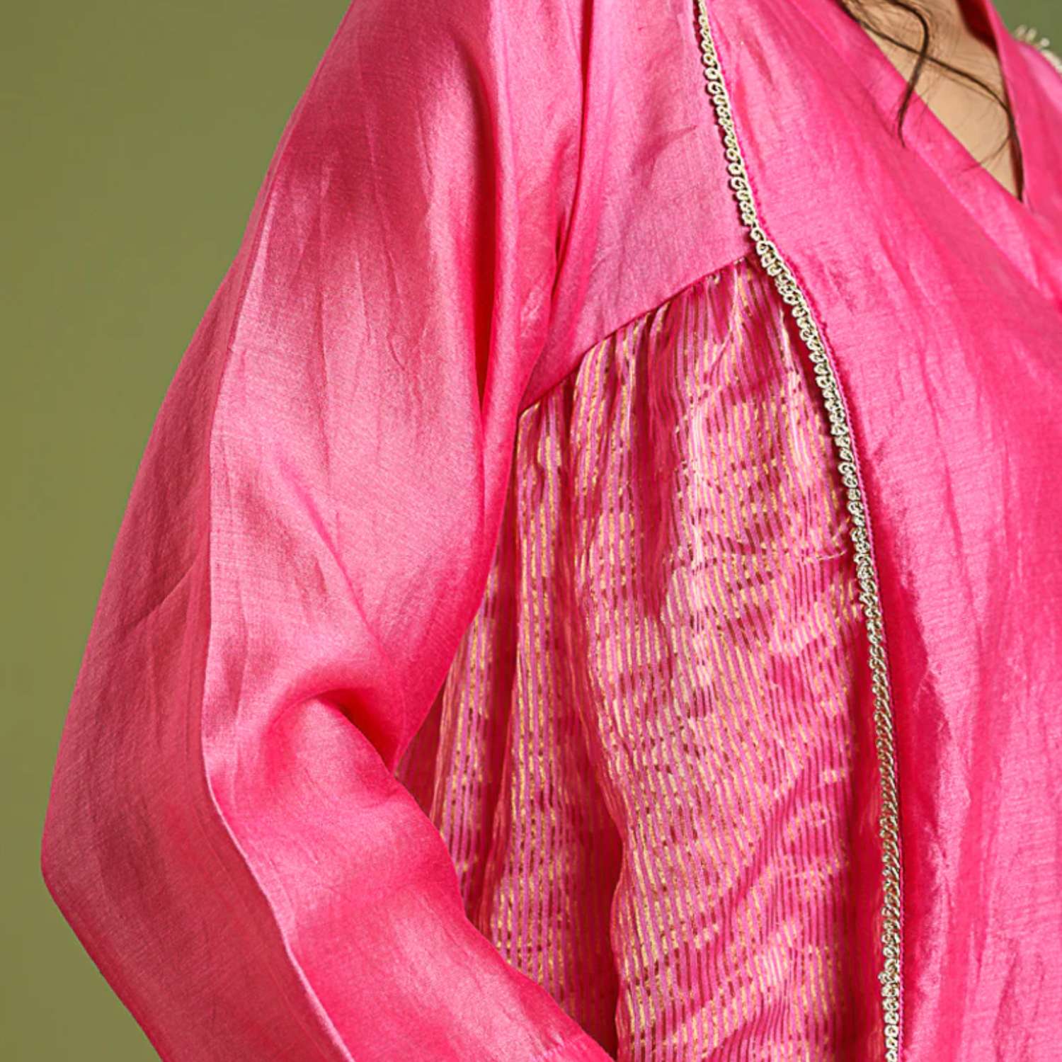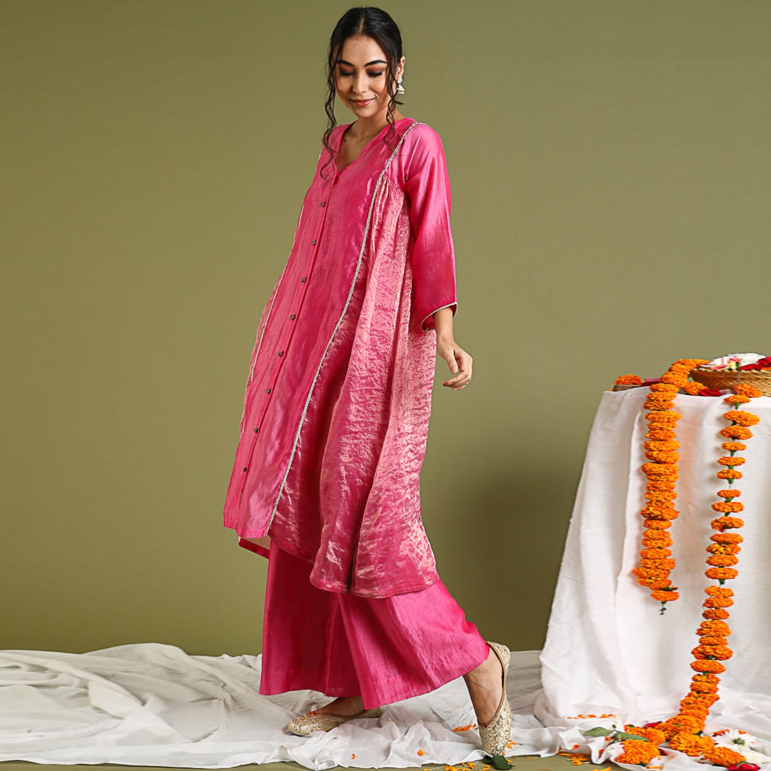 ₹ 8,999 (10% off)Experience the epitome of grace in our kalidar kurta, meticulously handcrafted in pink chanderi with gold stripes and adorned by tobacco brown chanderi fabric-covered buttons. Gold lace detailing on the front and back adds allure, complemented by a pink chanderi pallazo. Made on order, this ensemble embraces pure chanderi, featuring a lined pallazo and a kurta with a cotton slip for comfort.
