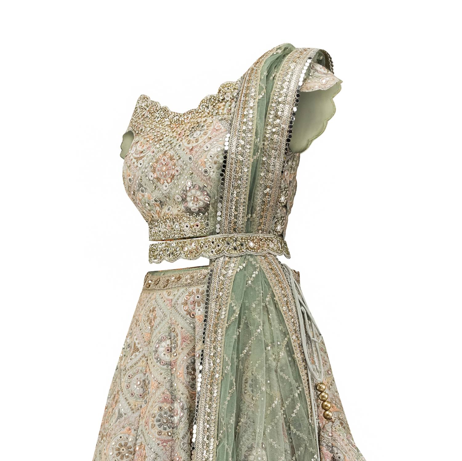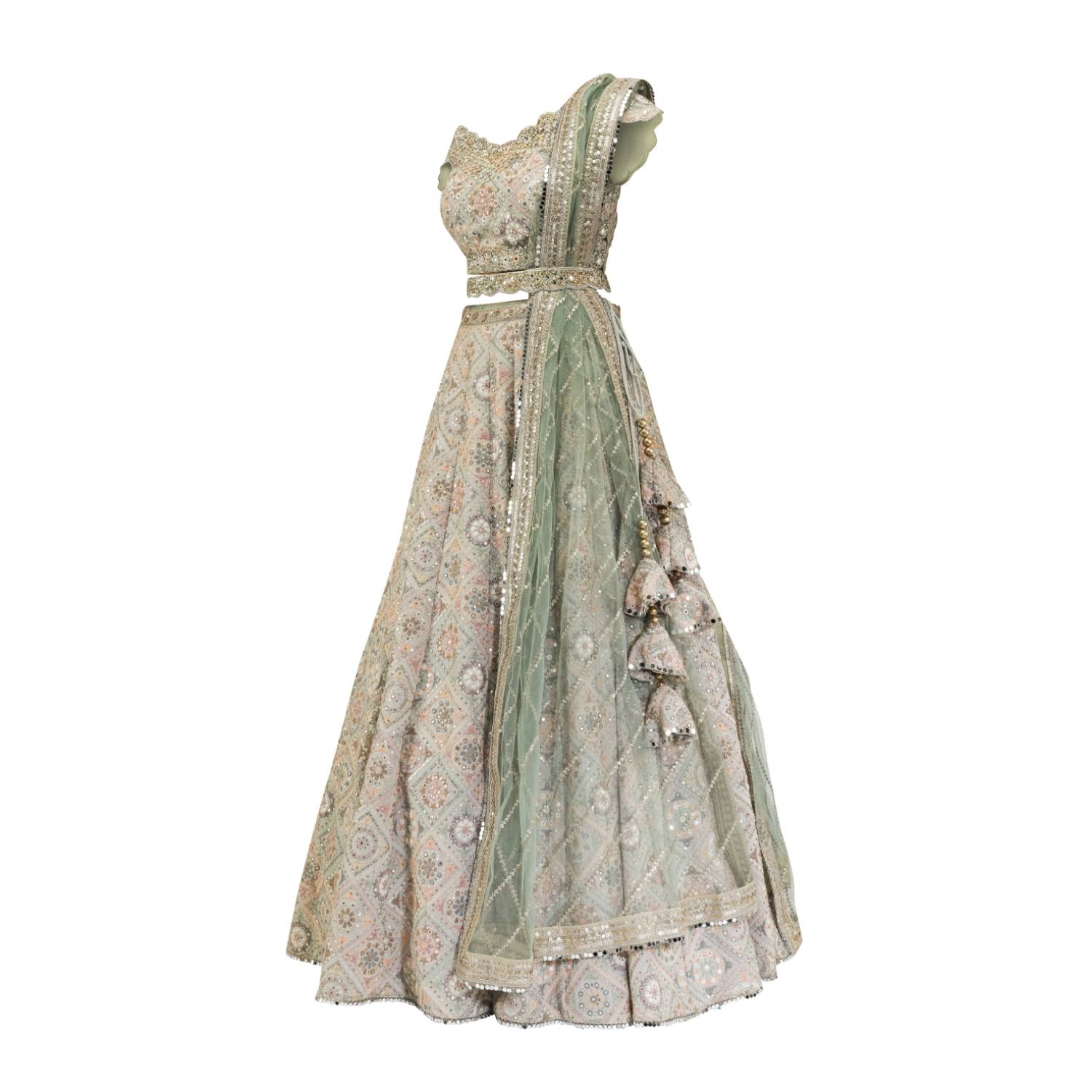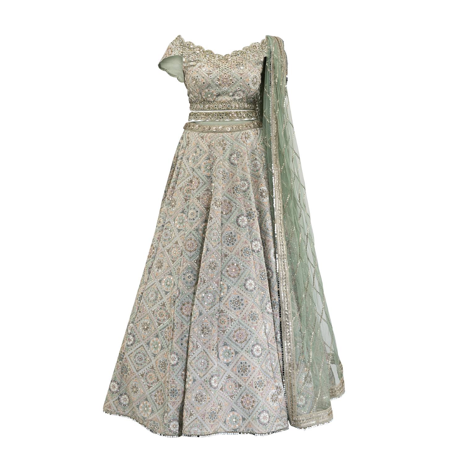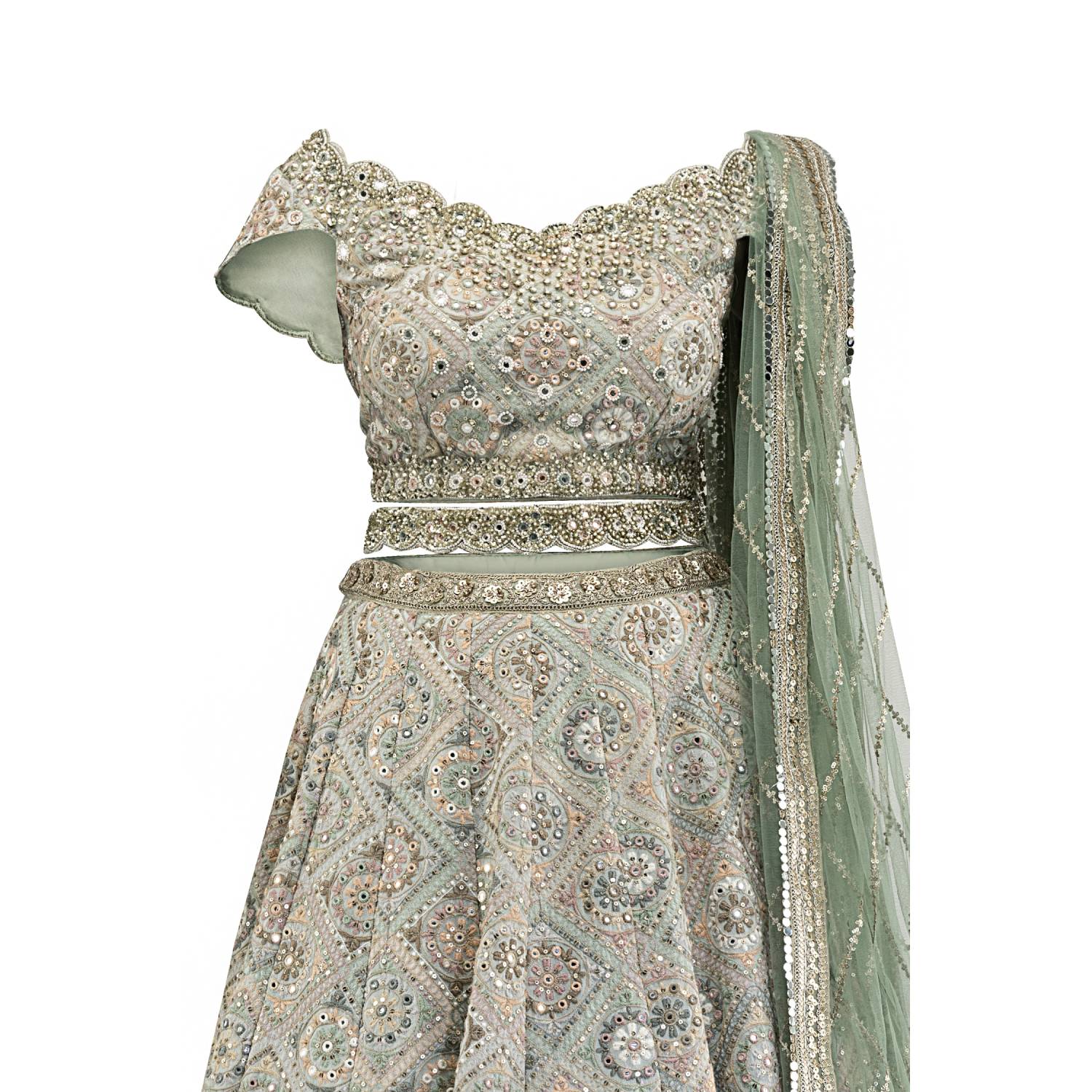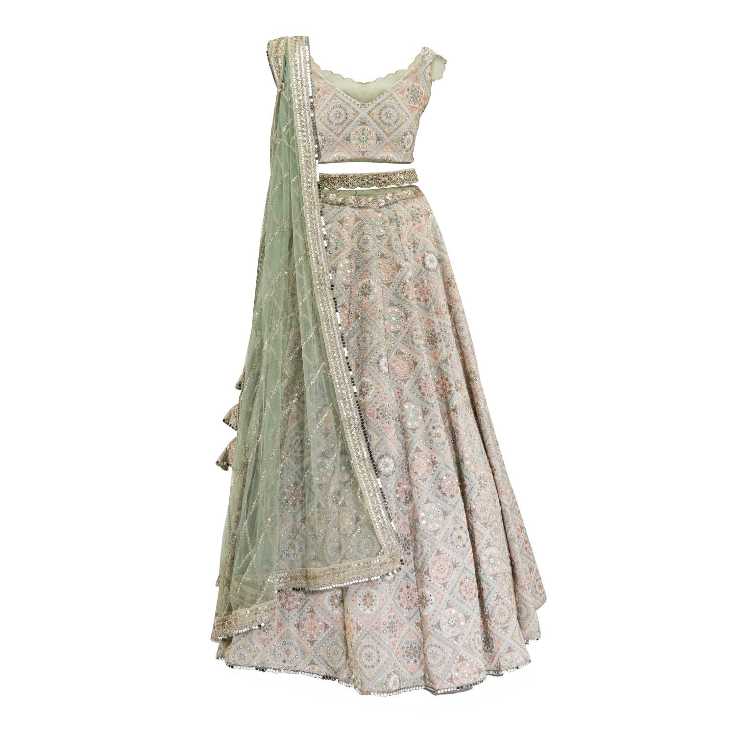 A timeless green lehenga set in georgette fabric featuring polished Kashmiri embroidery work that is highlighted with sequins, pearls, and heavy tassels. It is paired with a matching choli and net dupatta.