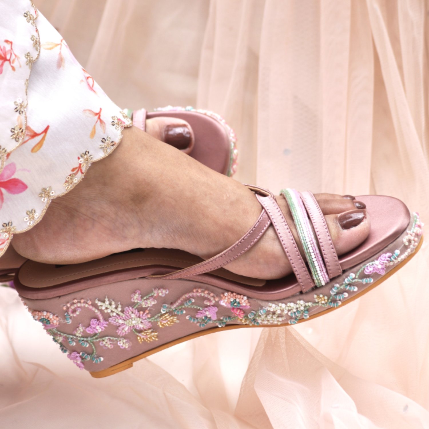 Kashvi, a festive season essential, captivates with its intricate embroidery adorning the wedge, striking a harmonious balance with simple yet elegant straps. Perfect for celebrations, these wedges embody the essence of refined style, ensuring you step into festivities with a touch of sophistication and an aura of understated elegance.