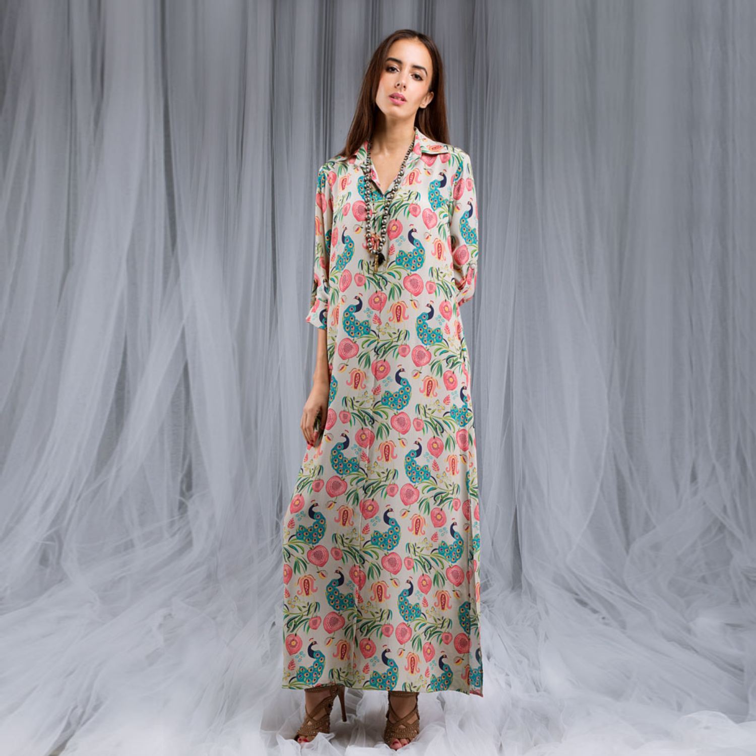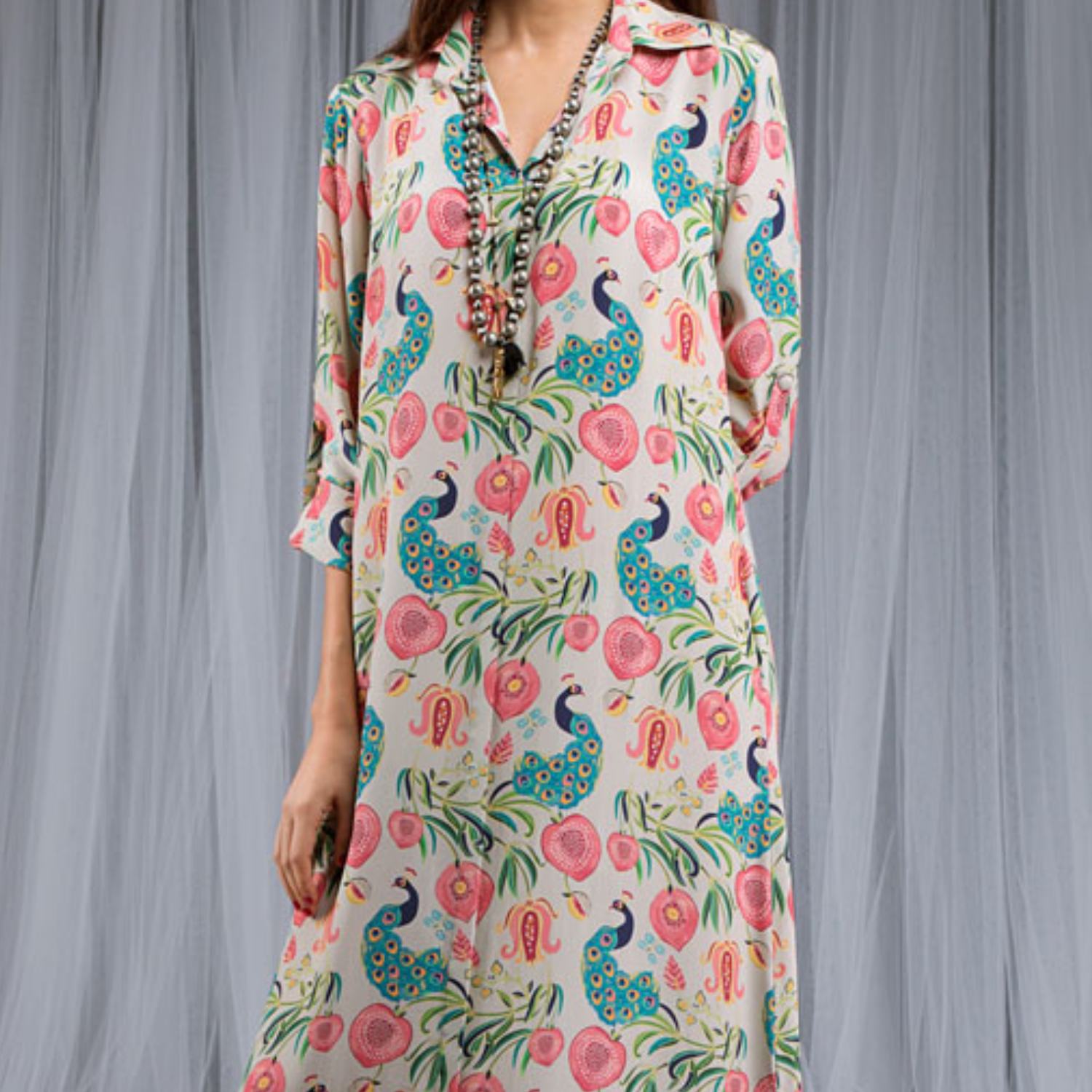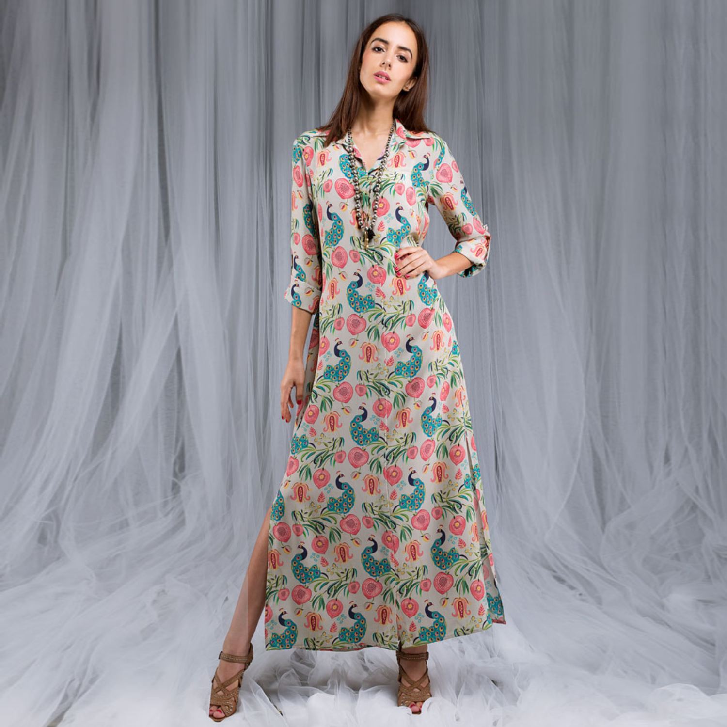 Crafted from high-quality crepe fabric, this strappy tunic features an ankle length and a relaxed fit. It has a khaki base with a multicolor print and roll-up sleeves, making it a stylish and unique piece. Style it with statement earrings and heels for a dressy day event.