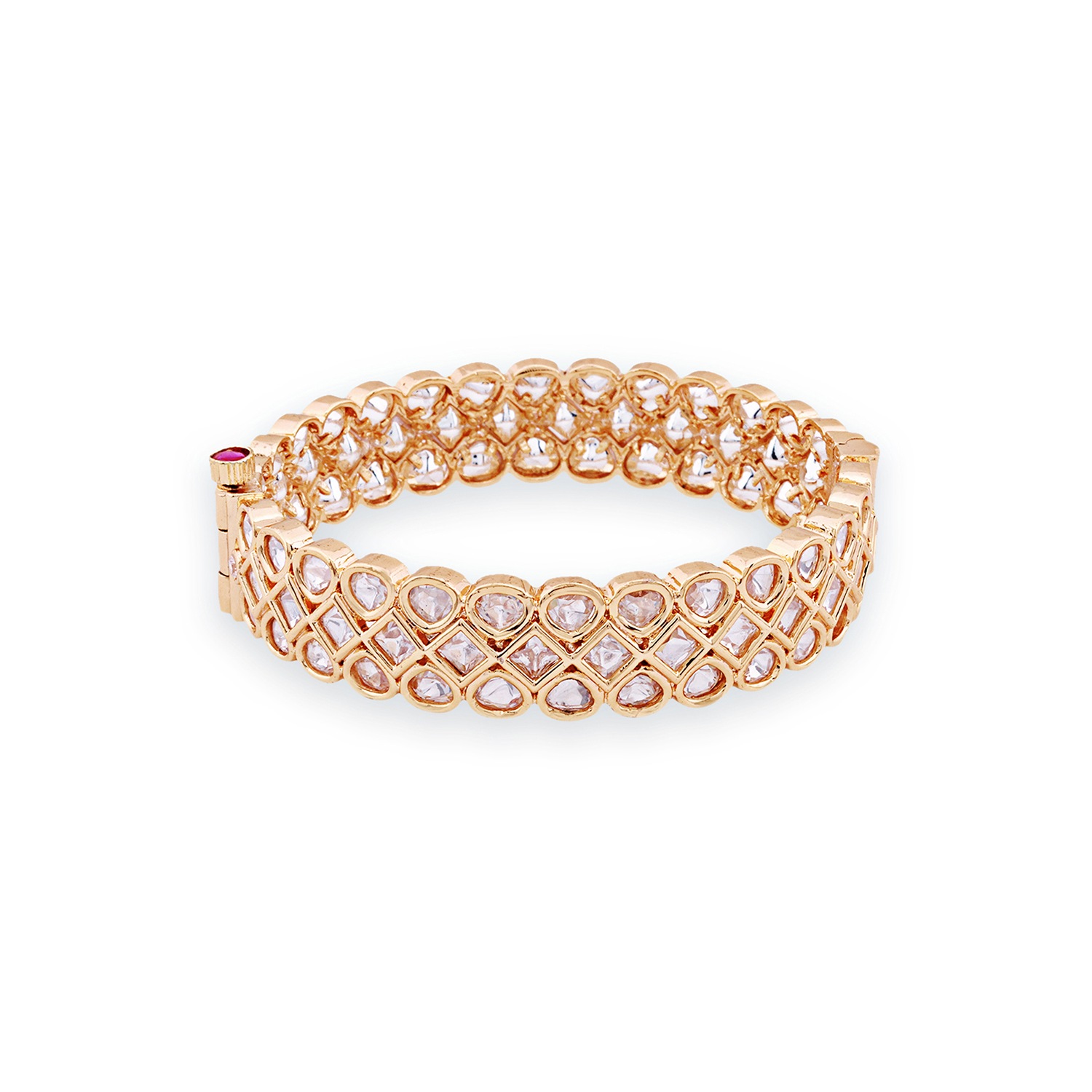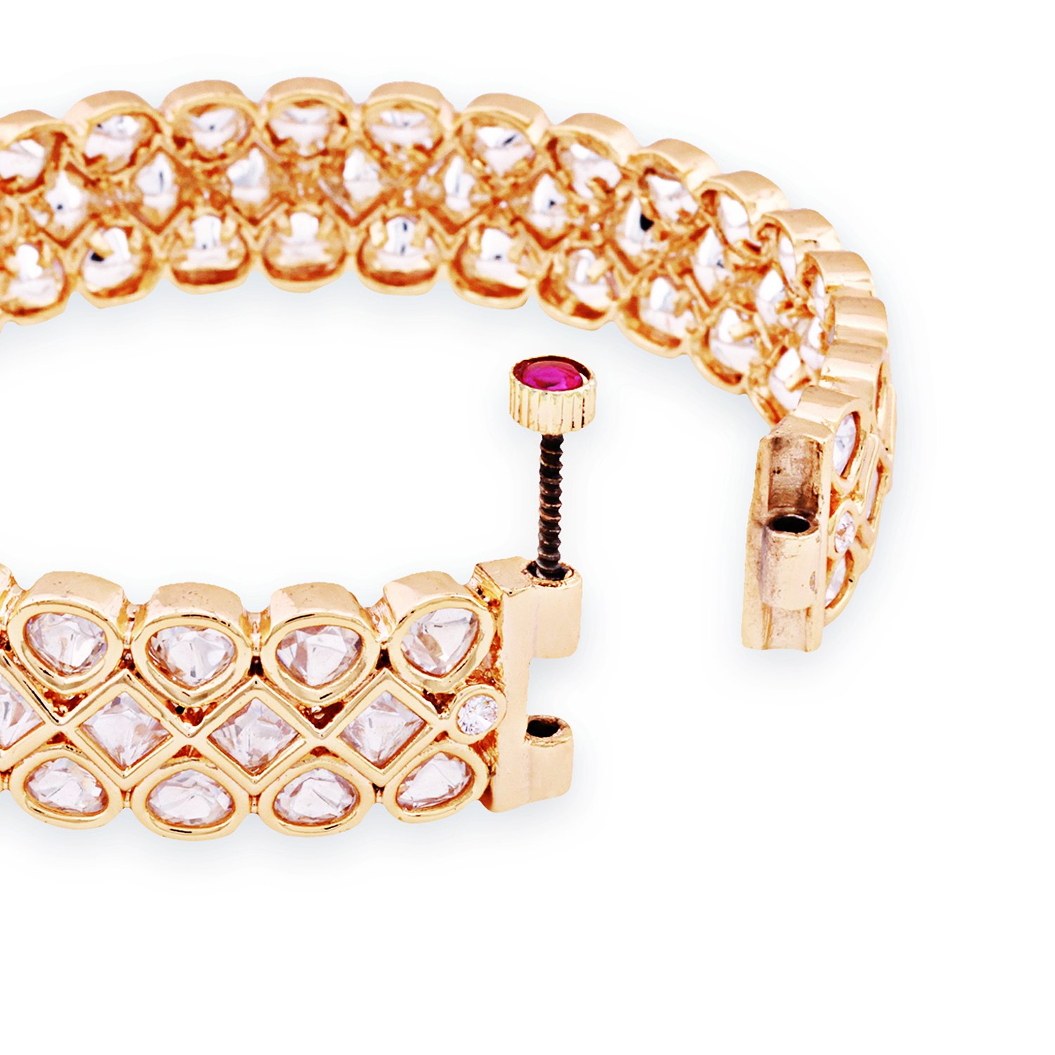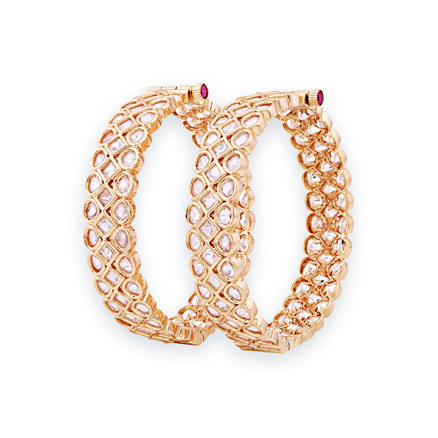 ₹ 12,360 (10% off)Elevate your accessory game with ZevarbyGeeta's unmatched craftsmanship. Featuring a pair of 22-karat gold-plated kadas embellished with kundan polki and set in mixed metals, this regal design is perfect for any occasion.