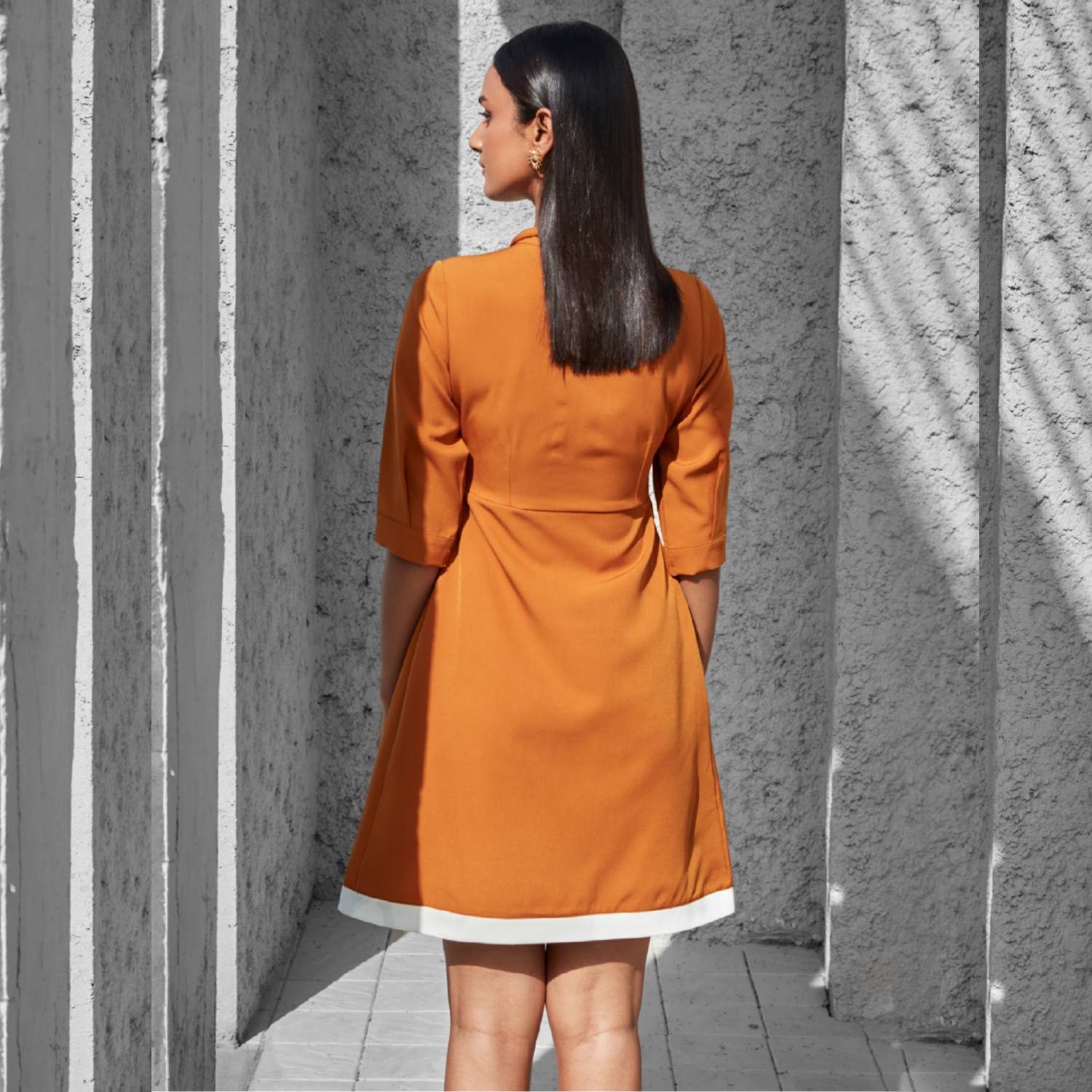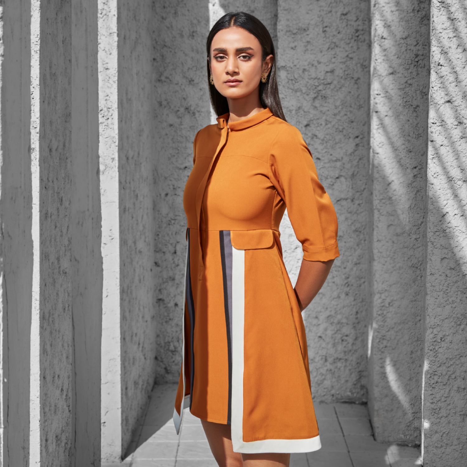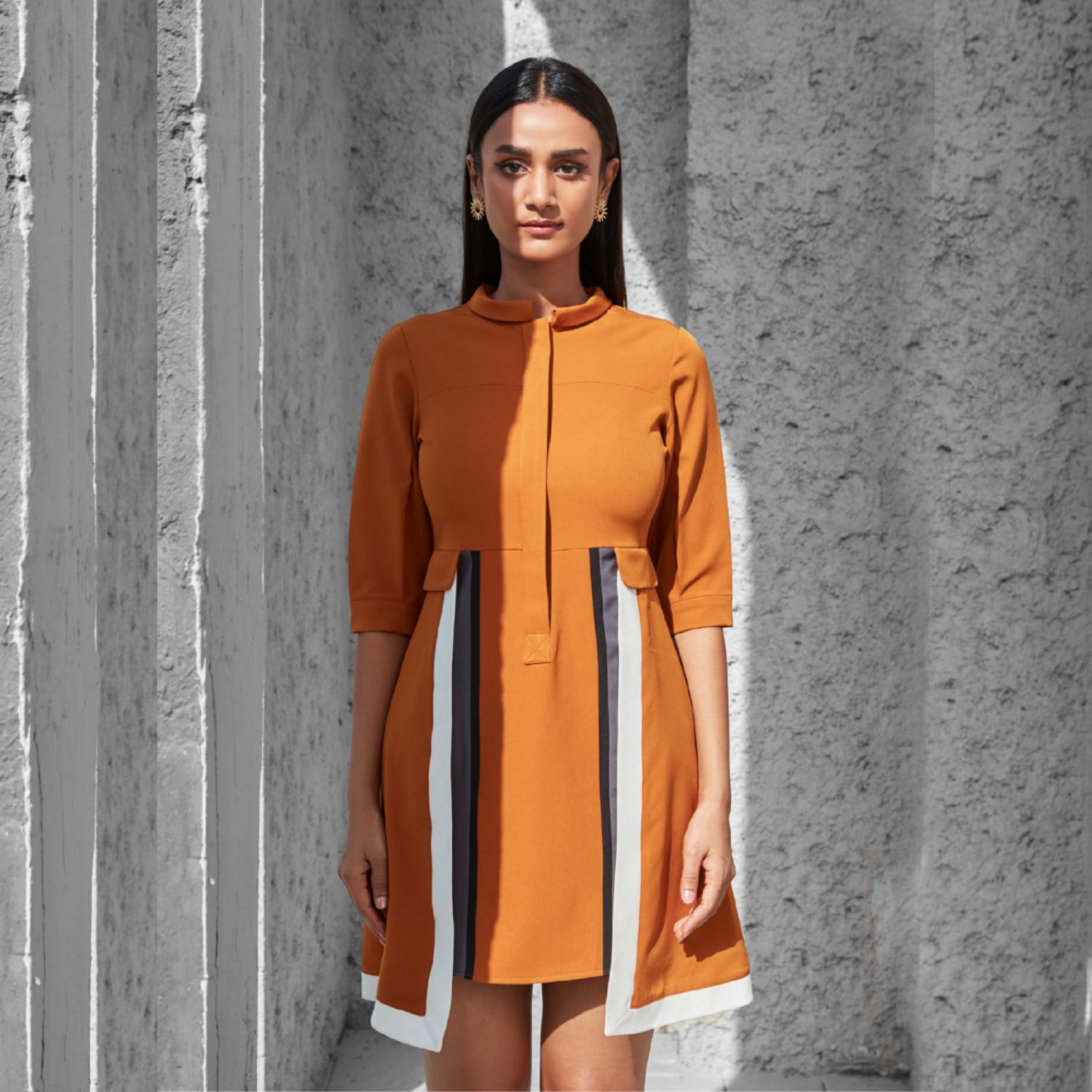 This A-line honey mustard dress features a rolled mandarin collar and elbow-length sleeves. The front zipper with placket and color-blocked side panels add interesting details to the design. Style this dress with statement earrings and contrasting heels for a summery day out.