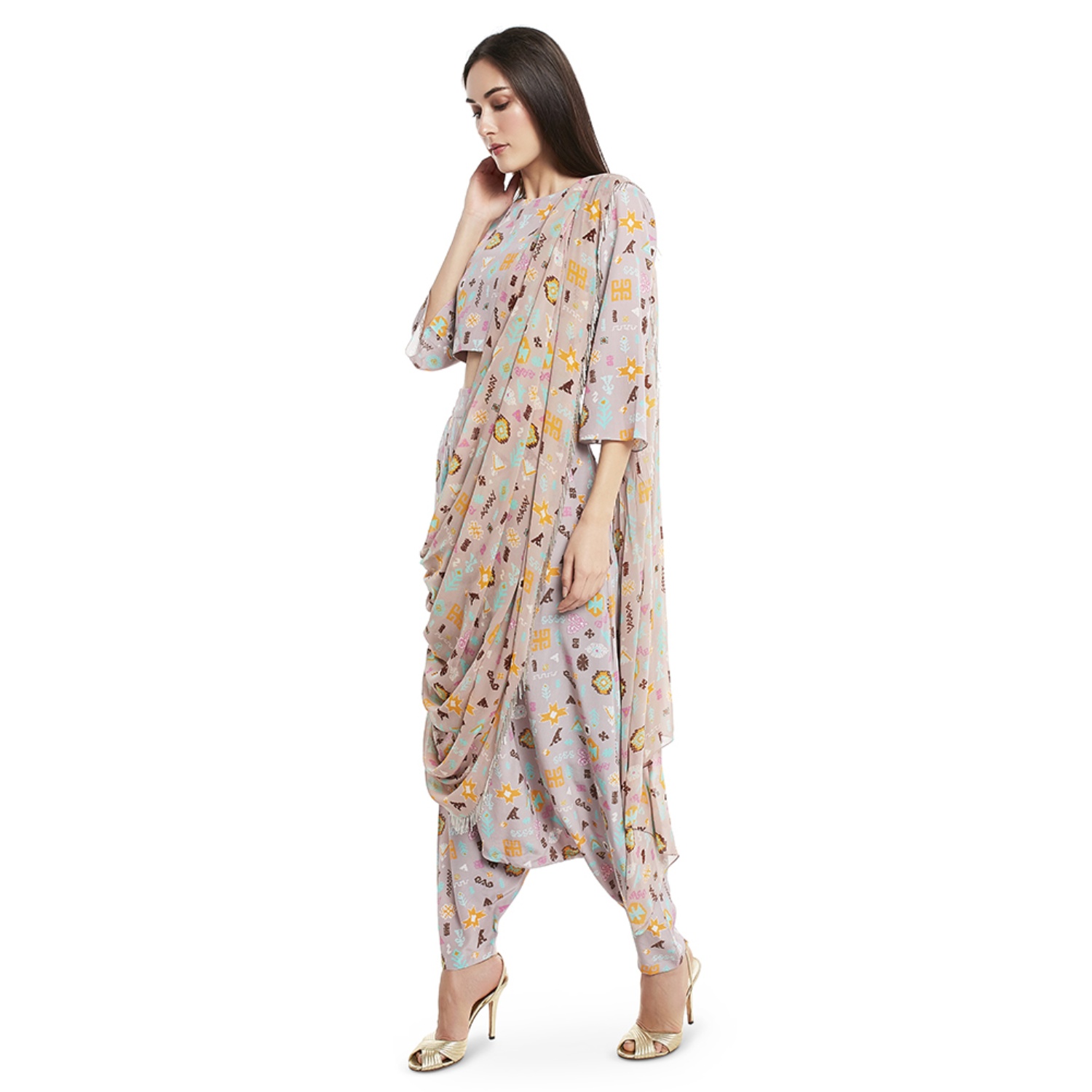 This stunning set features a lavender orange bandhani kilim print crepe top, which offers a modern and eye-catching design. The set comes with low-crotch pants with an attached drape dupatta in georgette, adding elegance to the look. Pair it with dangling earrings and a sling bag for a dressy event.