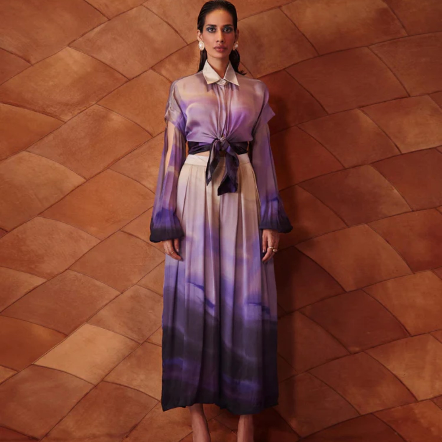 This beautiful top is crafted from high-quality rayon fabric. This ombre-printed top has a point collar, concealed front buttons and bouffant sleeves with cutouts. Style it with drop earrings and strappy heels for a dressy event.