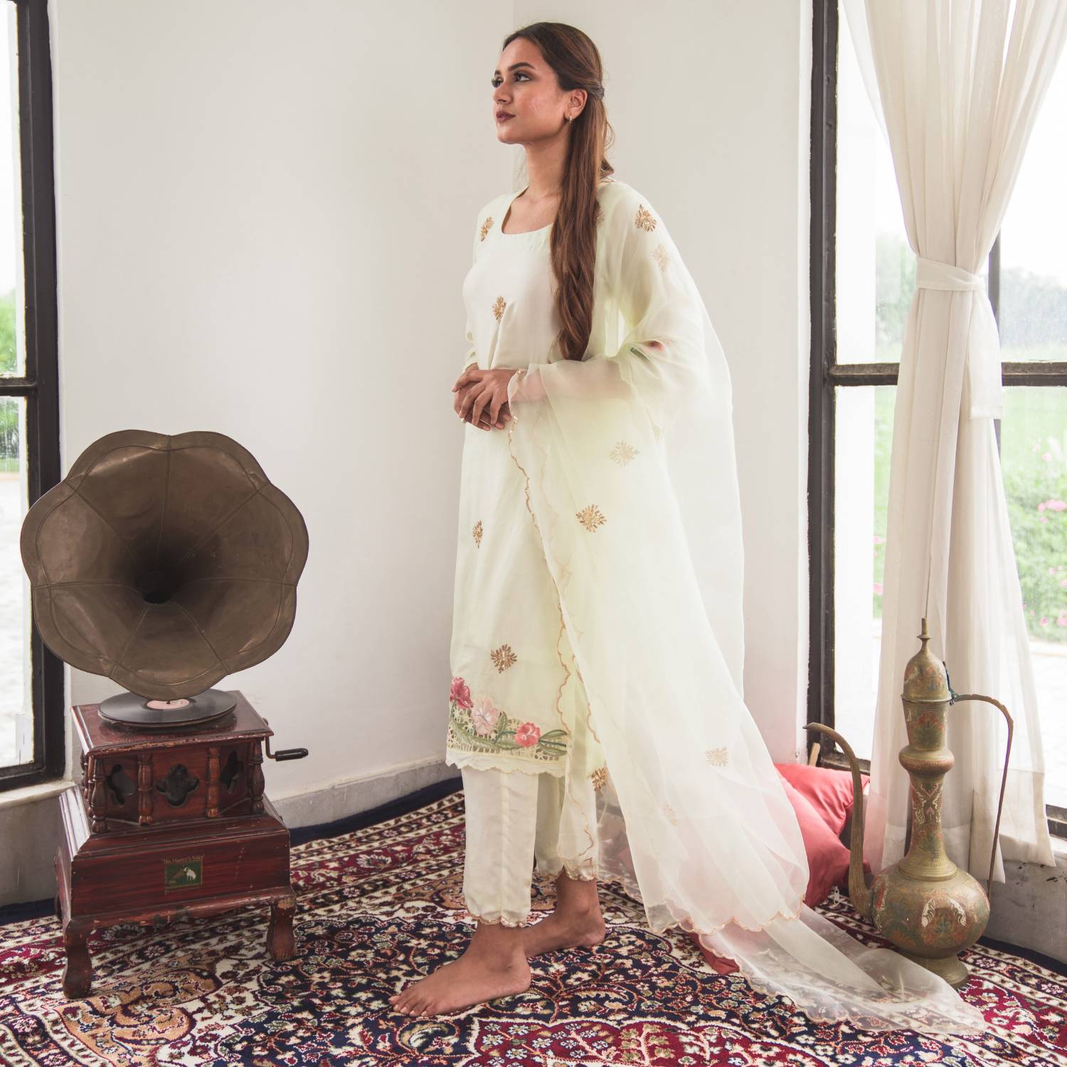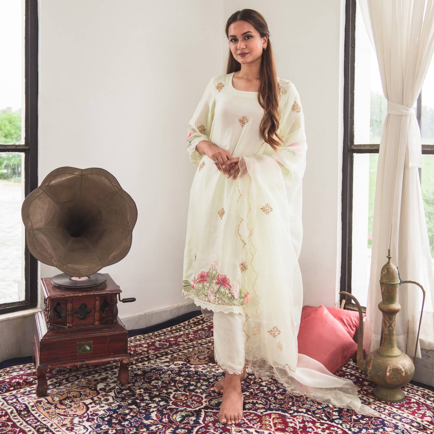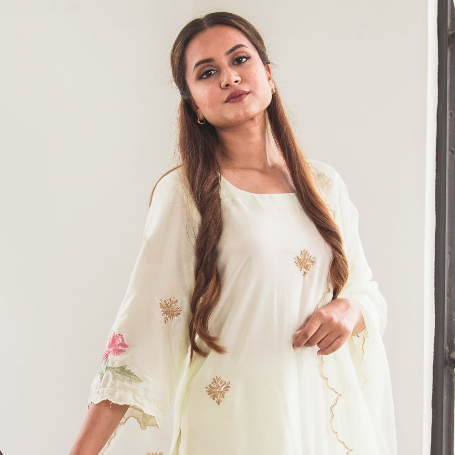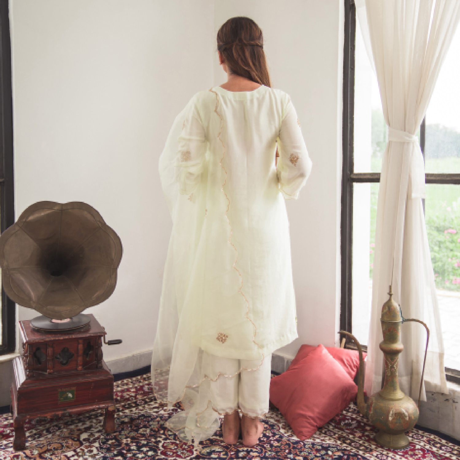₹ 22,400 (10% off)This set is crafted from pure silk and features a lemon kurta with intricate cutwork embroidery at the ghera. Small motifs in gold sequins, scattered throughout the kurta and the matching dupatta, accentuate the outfit's timeless elegance. The set is completed with silk pants finished with subtle sequin handwork. Pair it with statement earrings and an embellished clutch for weddings or festivities.