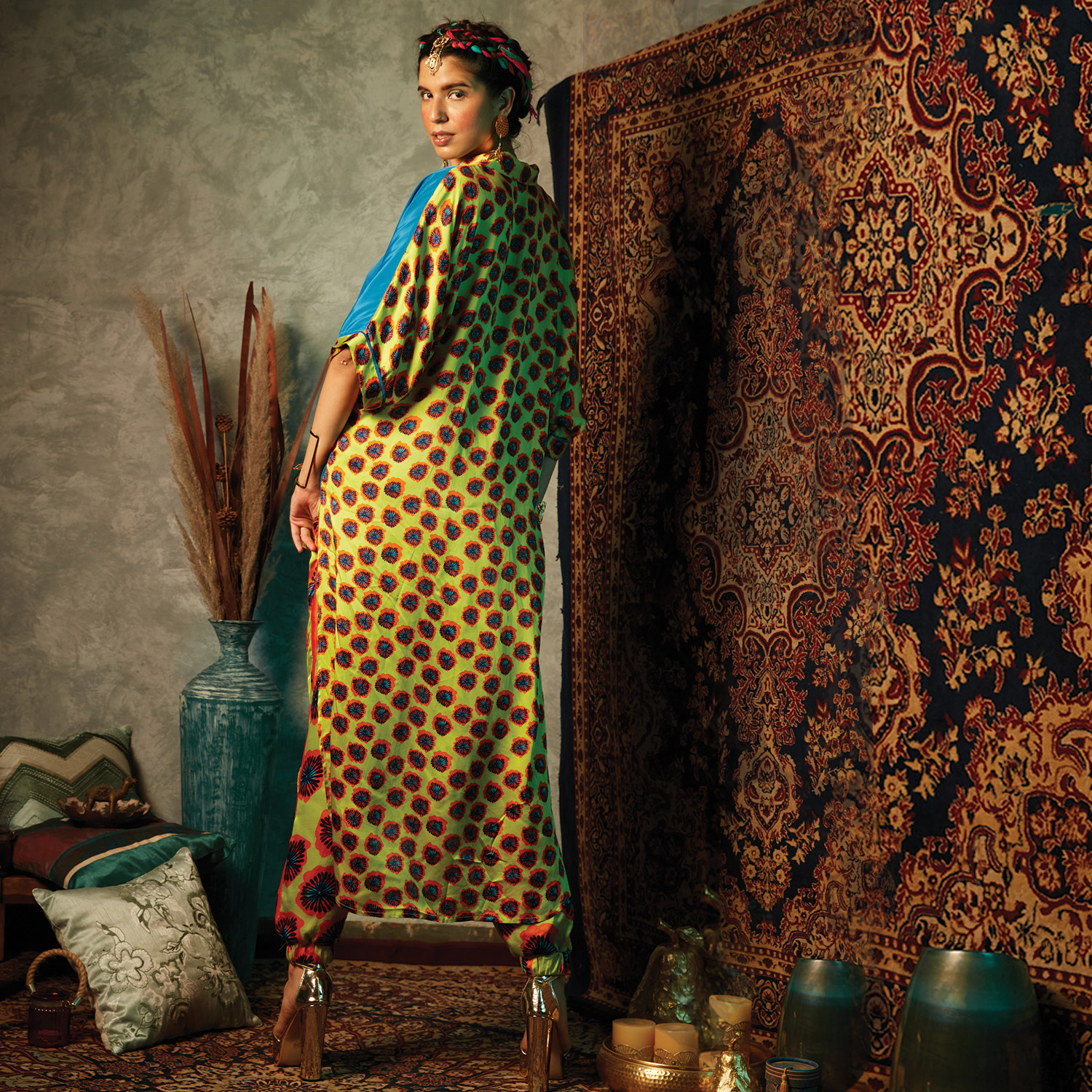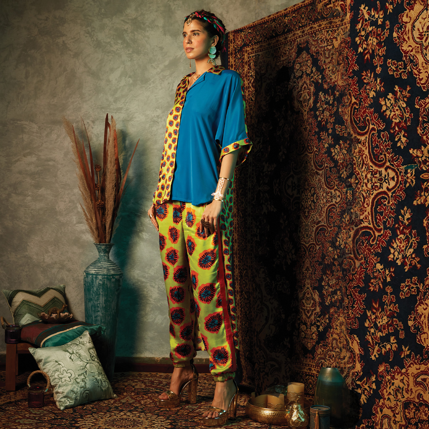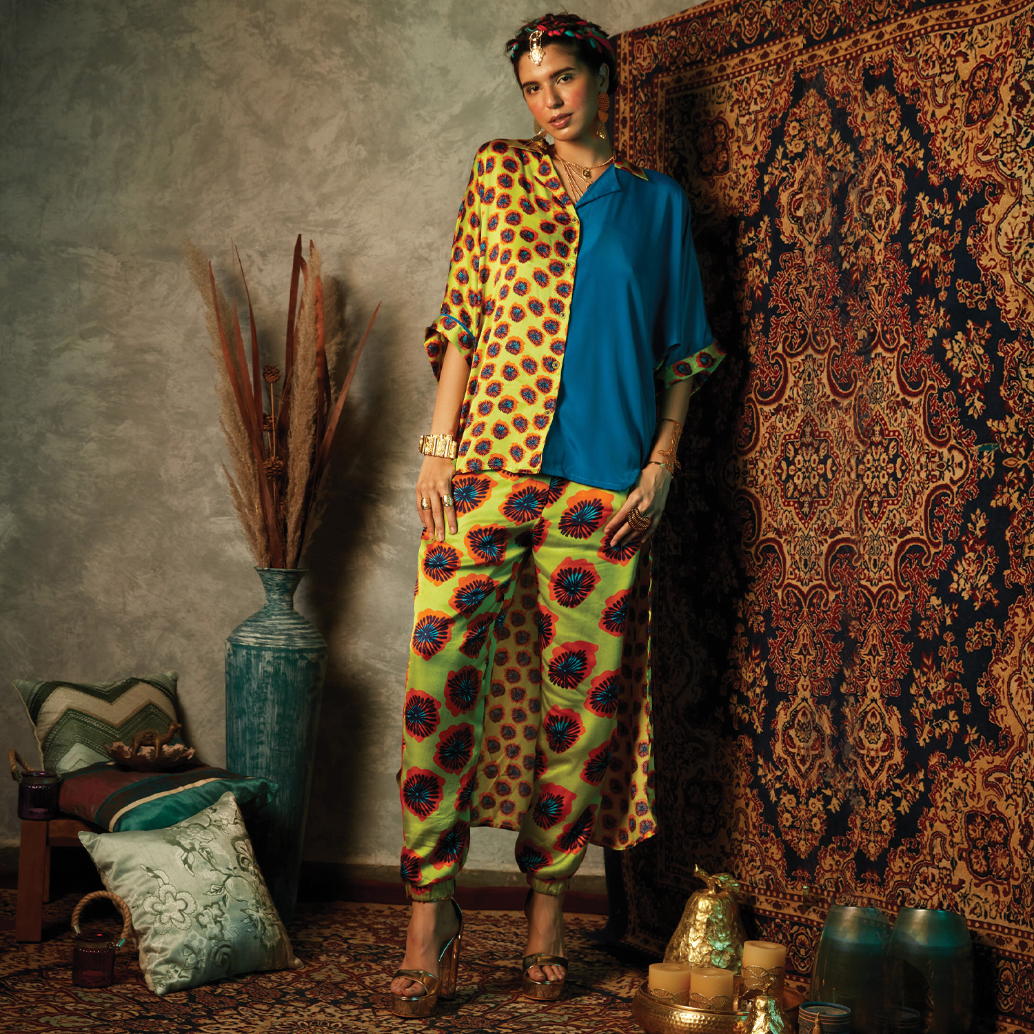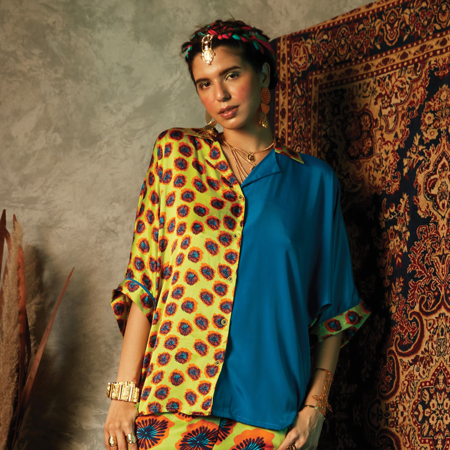 This shirt is crafted from luxurious modal satin and features a unique design. One half of the shirt is solid blue, and the other has a vibrant lime shade adorned with a beautiful print. Style it with a pendant necklace and strappy heels for an evening party.