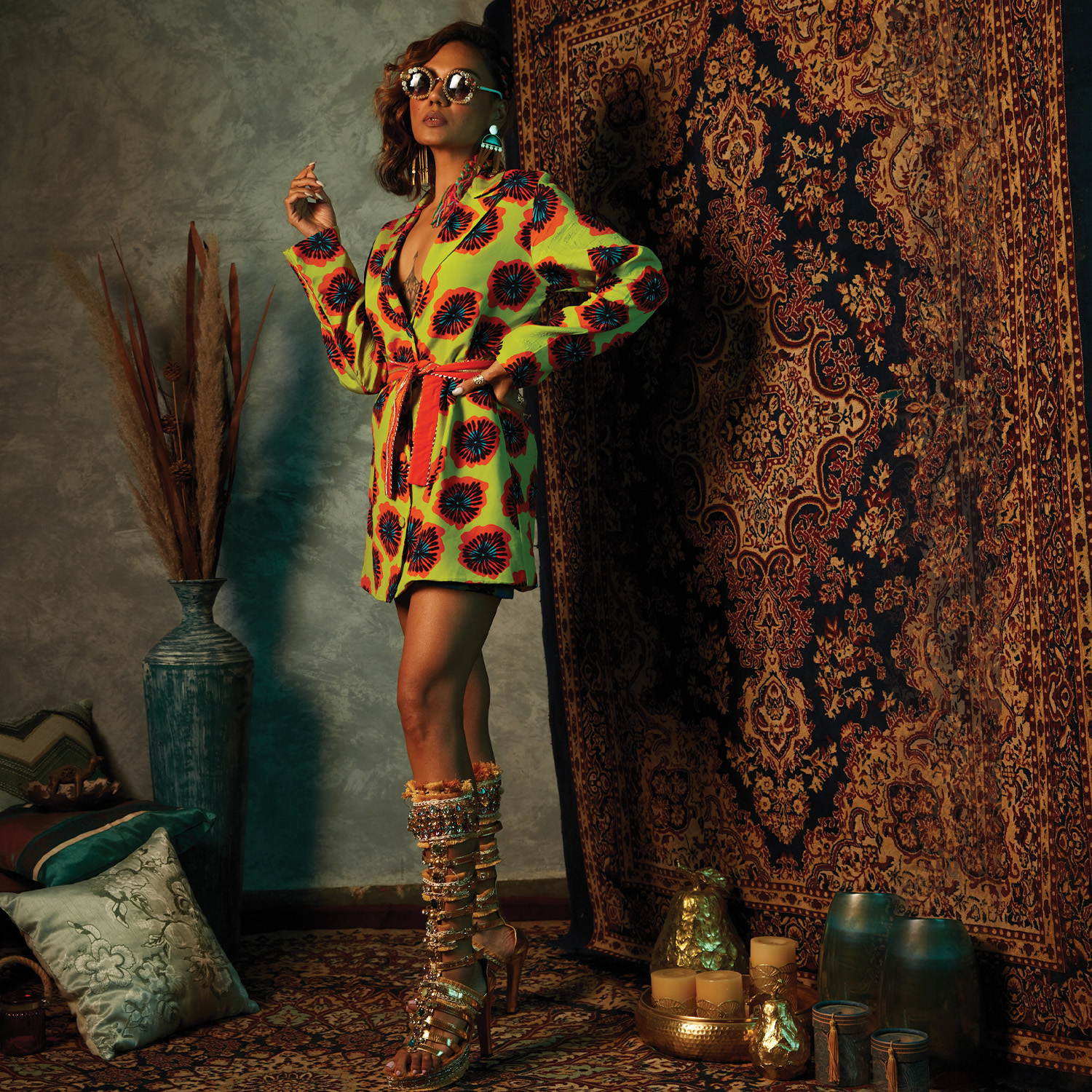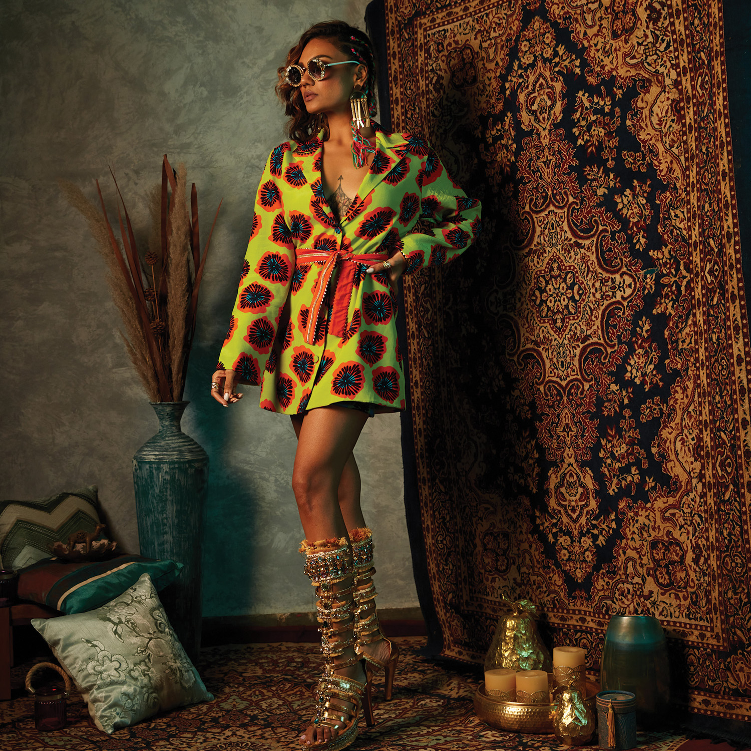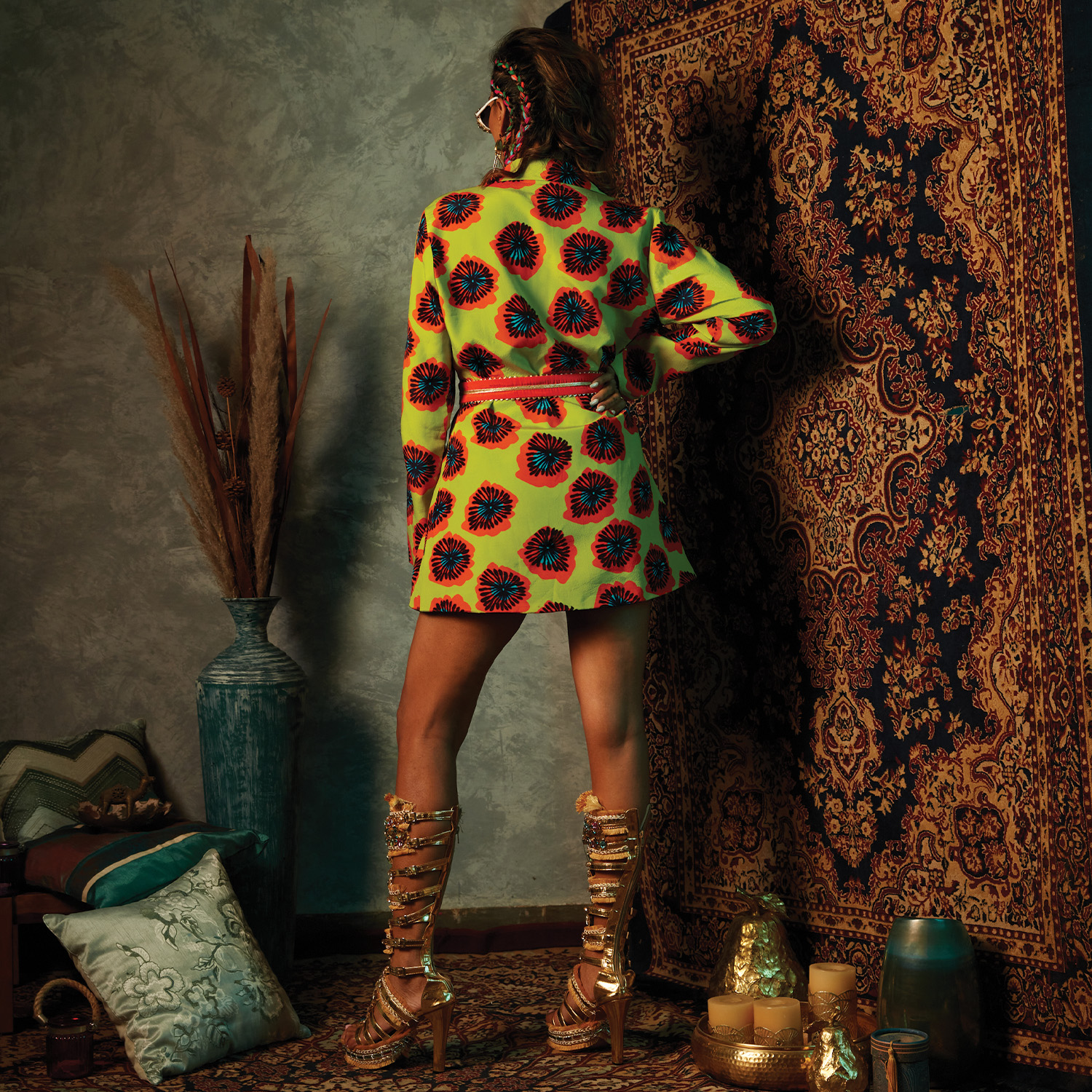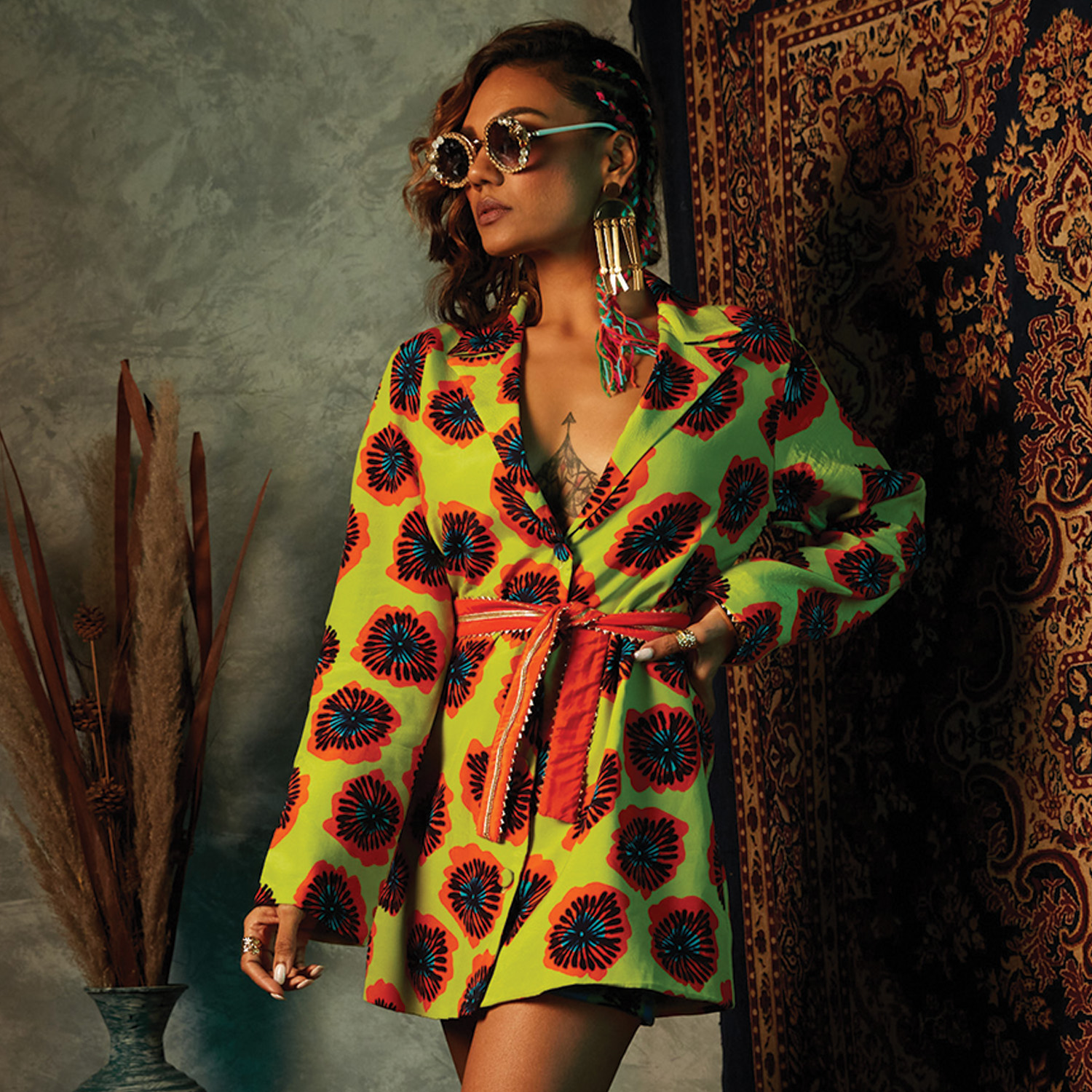 This lime blazer is crafted from luxurious modal satin and features an all-over blotch print. It comes with a notched lapel collar, full sleeves, and a front button closure for a polished look. Style it with minimal accessories and strappy heels for a dressy evening soiree.
