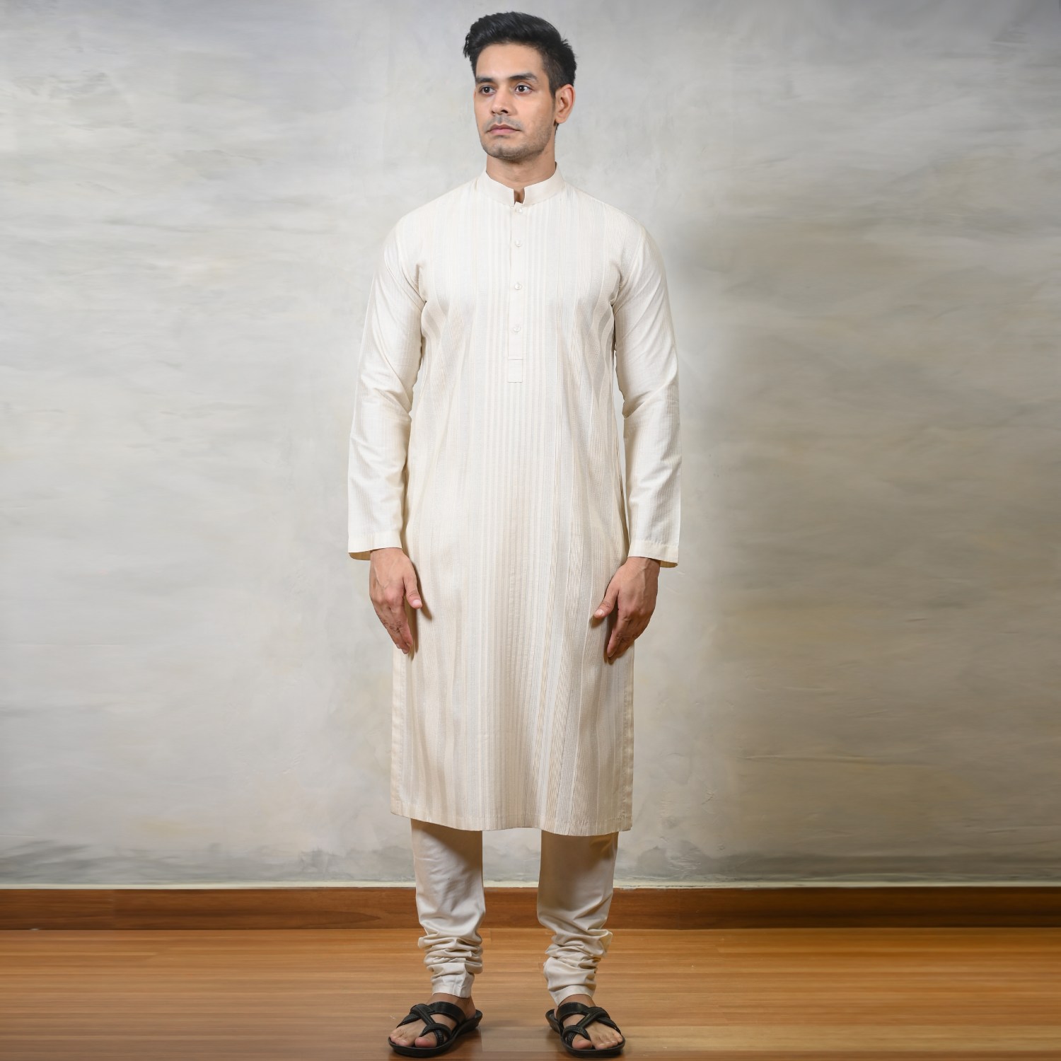 ₹ 18,450 (10% off)Crafted from high-quality cotton chanderi fabric, this soft ivory set includes a kurta and churidar pants. The kurta features edgy pintuck and stitch line details, adding elegance to the outfit. Style it with minimal accessories and formal shoes for weddings and festivities.