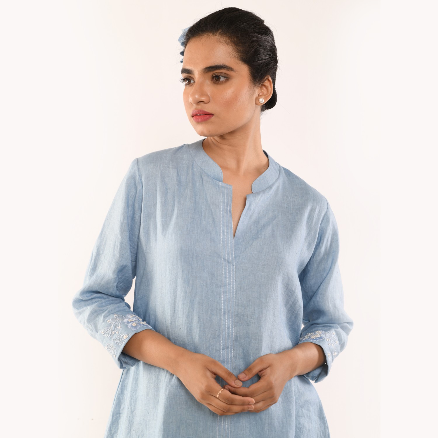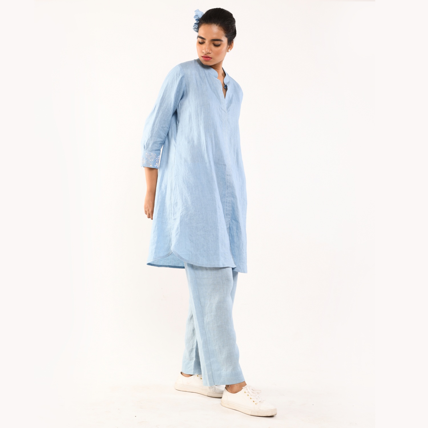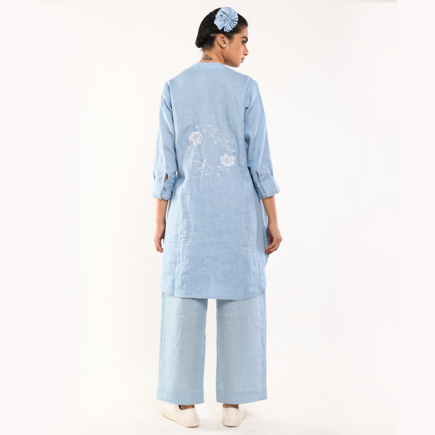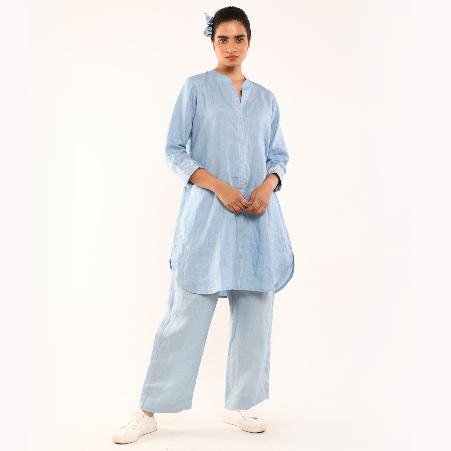 ₹ 8,699 (20% off)This set features a long-shirt straight-cut kurta accentuated by delicate floral embroidery on the sleeves and curved hemline. The accompanying relaxed-fit pants ensure style and comfort. Crafted in soft linen fabric, this denim blue set is perfect for summery days.