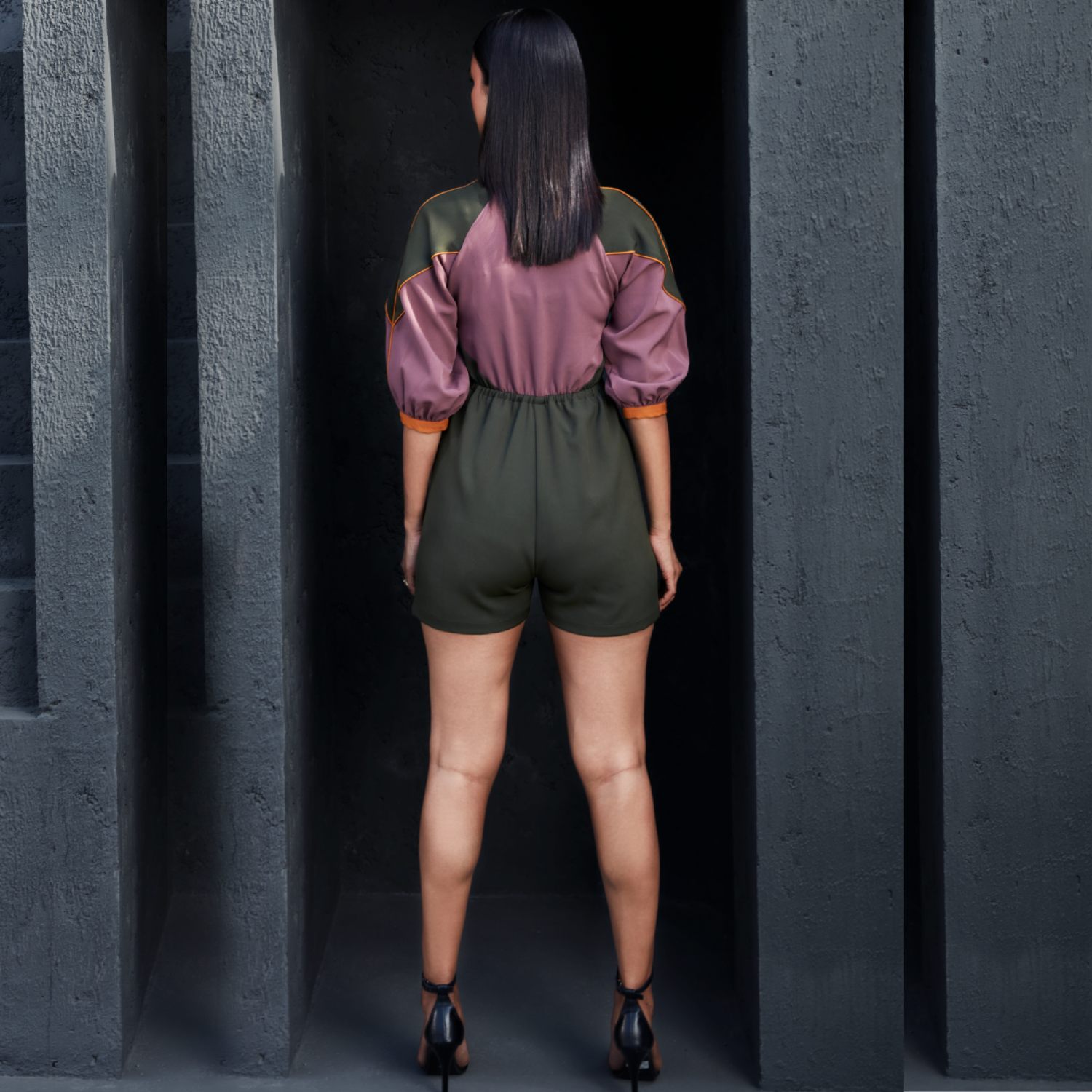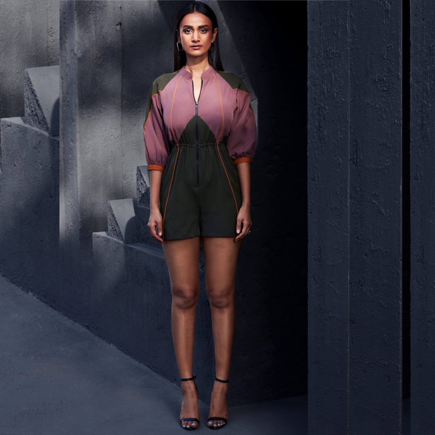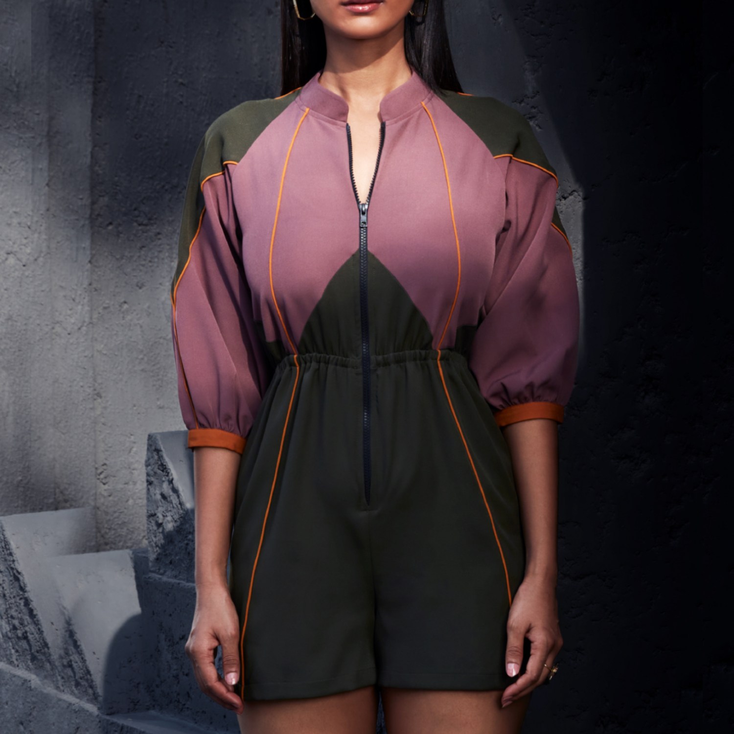 Crafted from rayon fabric, this stylish playsuit features a mauve and olive color blocking, raglan three-quarter sleeves, a band collar, and pockets. It has honey mustard edgings and cuffs, adding uniqueness. Pair this playsuit with sneakers and a sling bag for a casual day with friends.