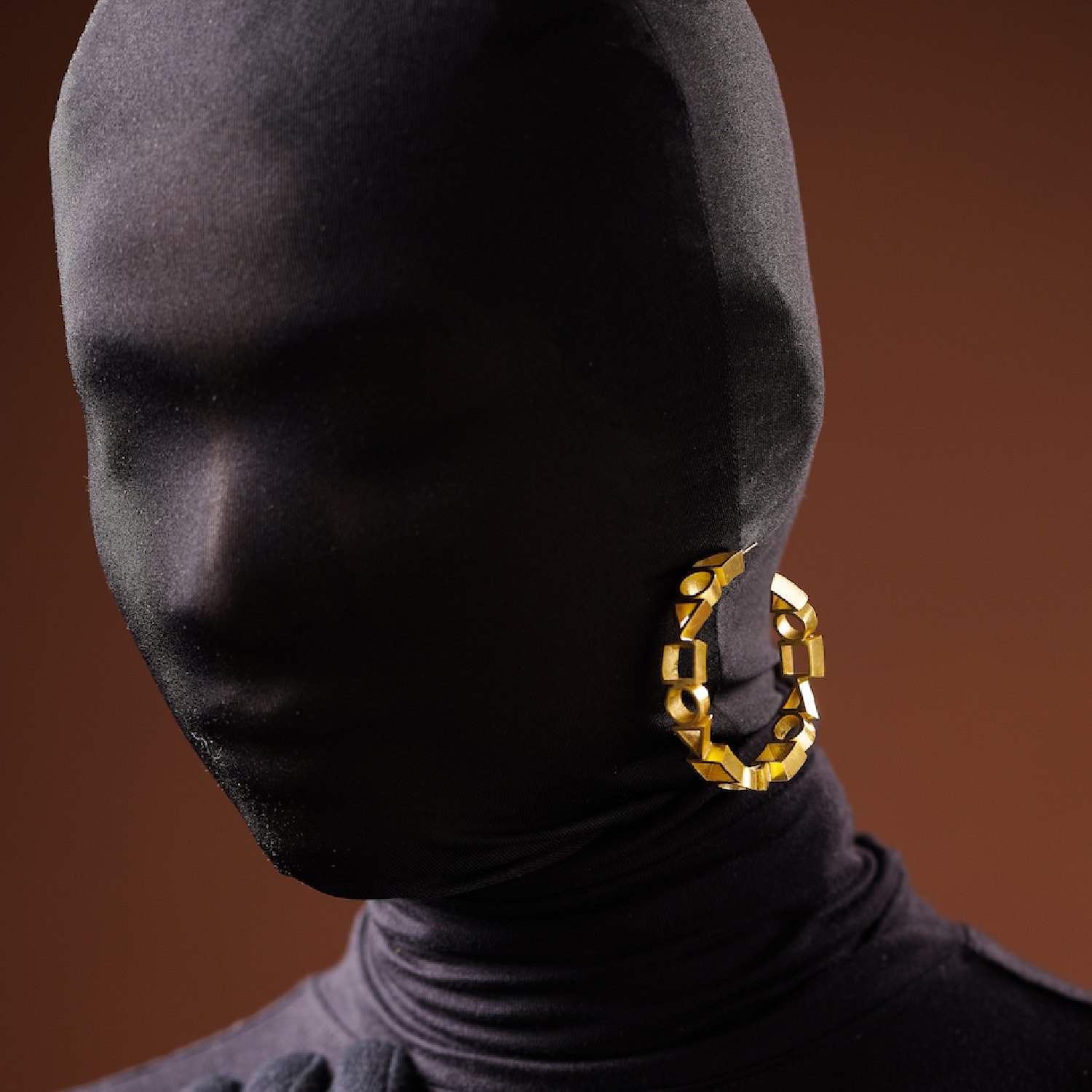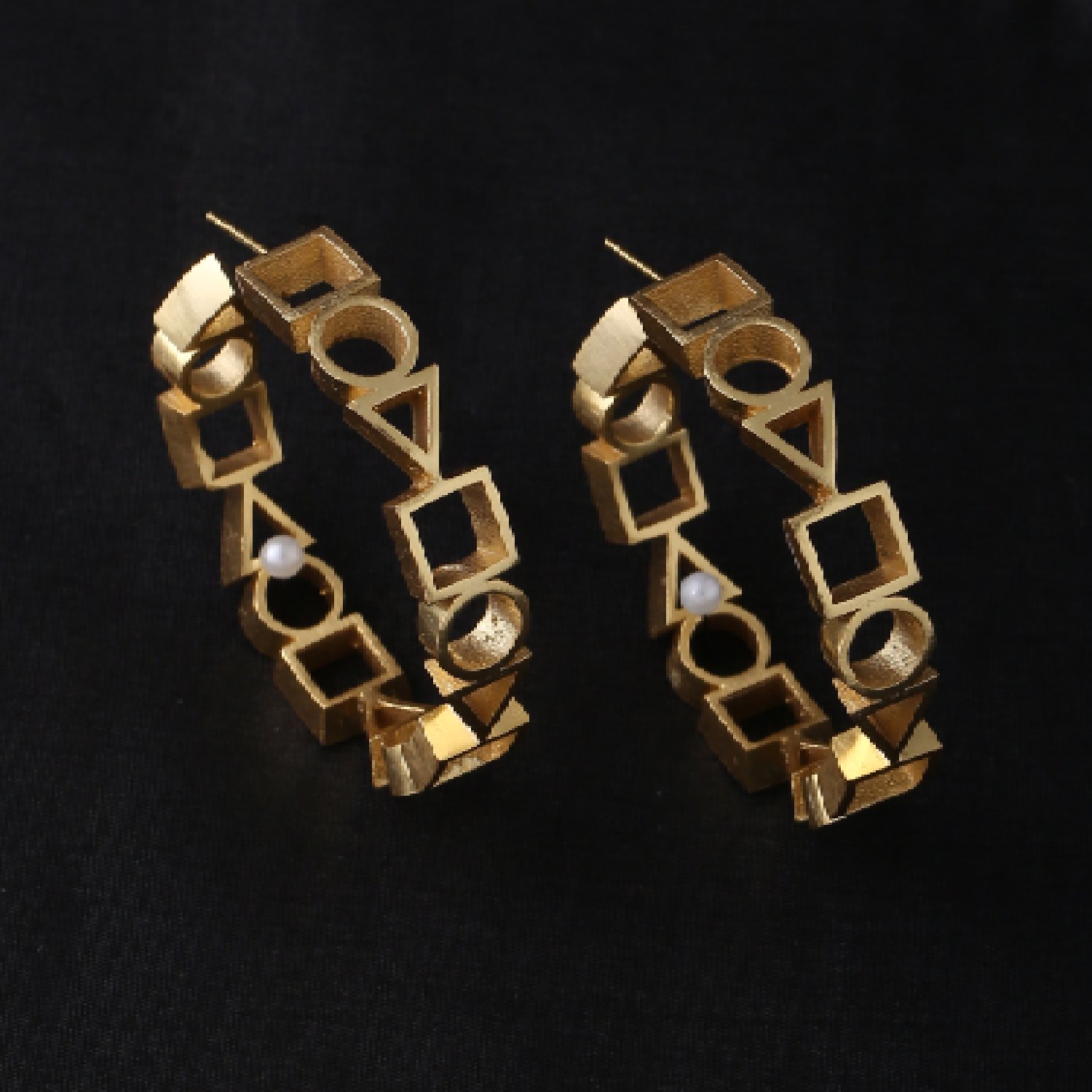 These medium-sized geometric hoops plated with 18k gold are meticulously handcrafted from brass, ensuring their quality and uniqueness. They have a matte finish and are equipped with a push-button closure for secure and easy wear. Pair it with a tailored blazer and trousers for a sophisticated office look.