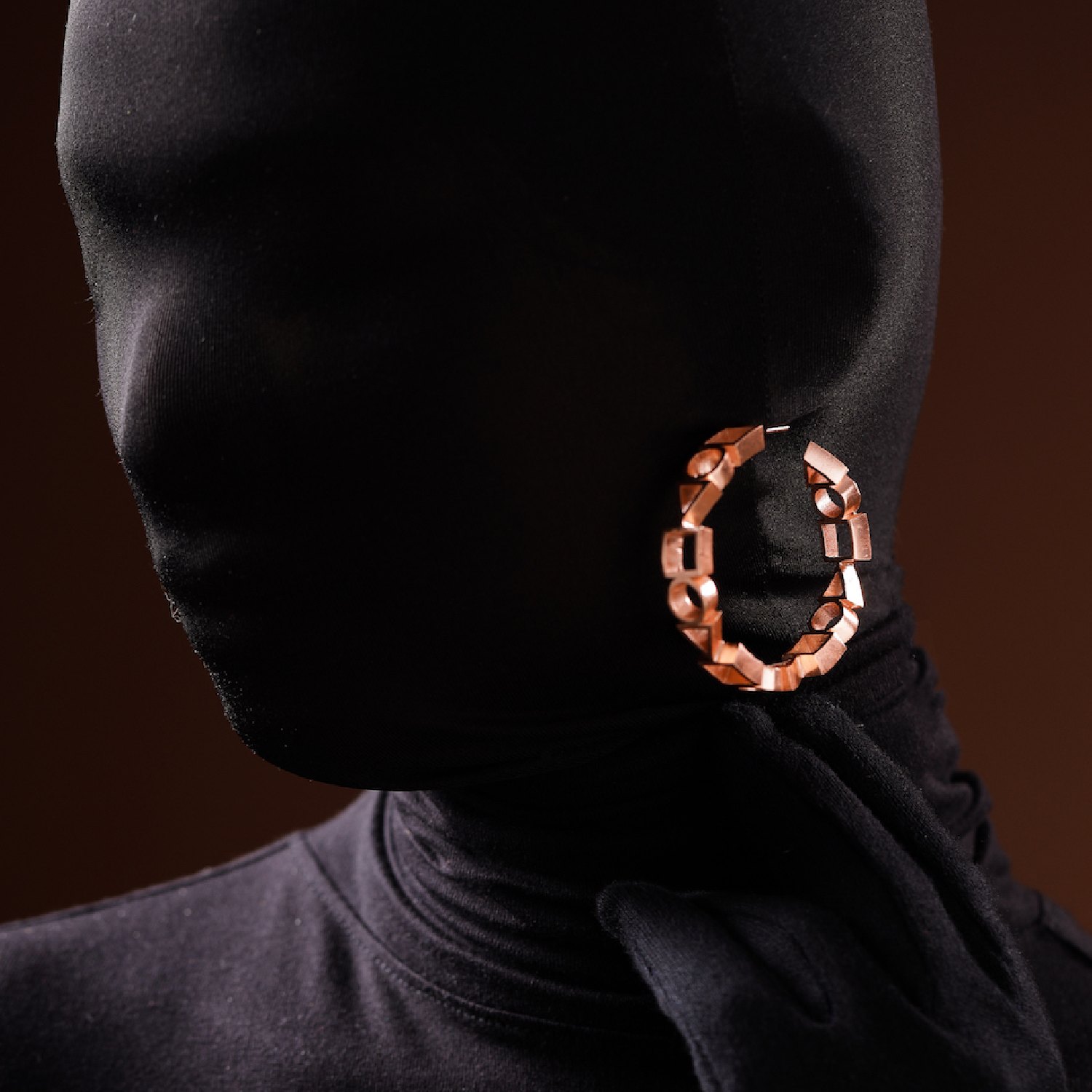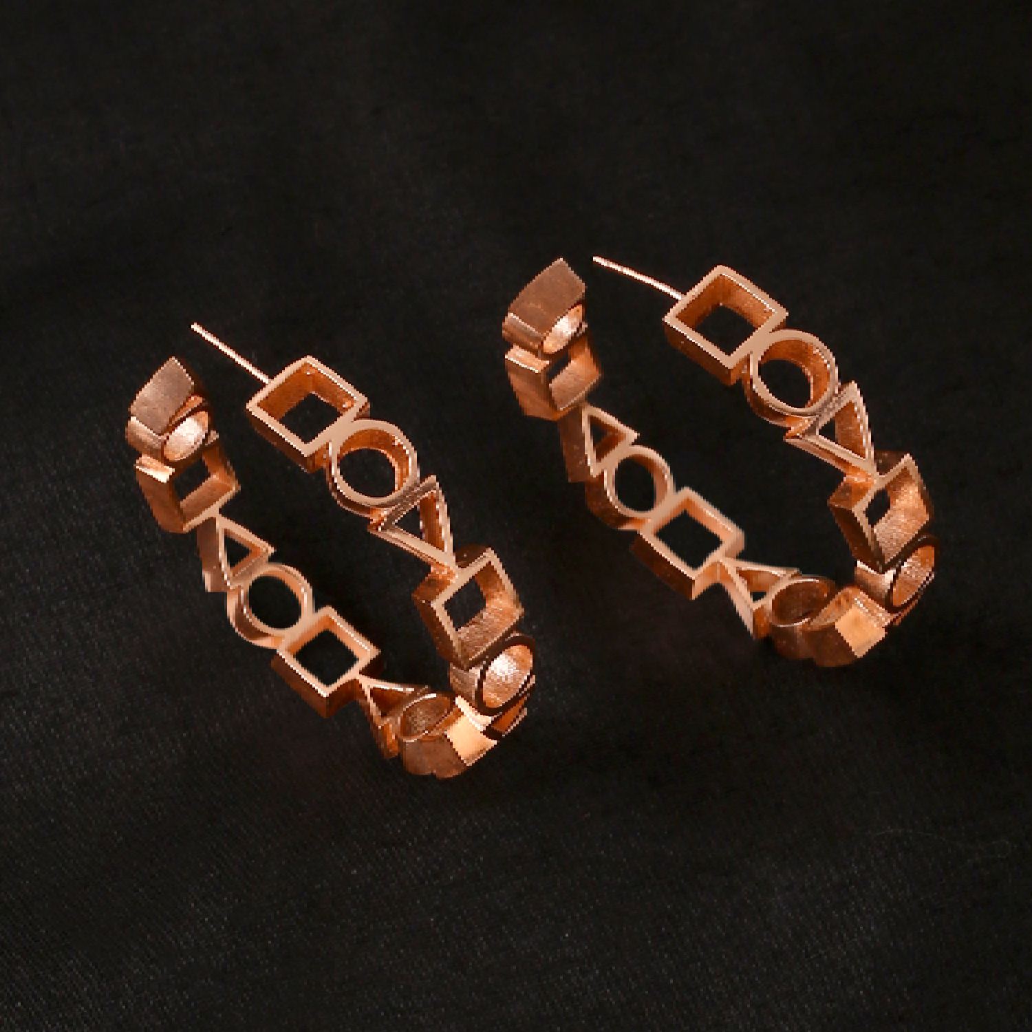 These medium-sized geometric hoops plated with 18k rosegold are meticulously handcrafted from brass, ensuring their quality and uniqueness. They have a matte finish and are equipped with a push-button closure for secure and easy wear. Pair it with a tailored blazer and trousers for a sophisticated office look.