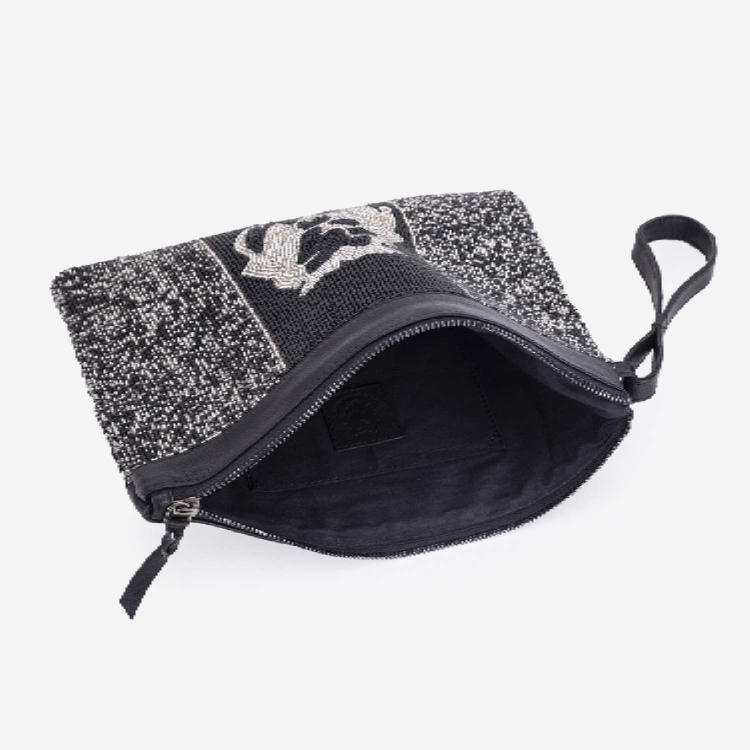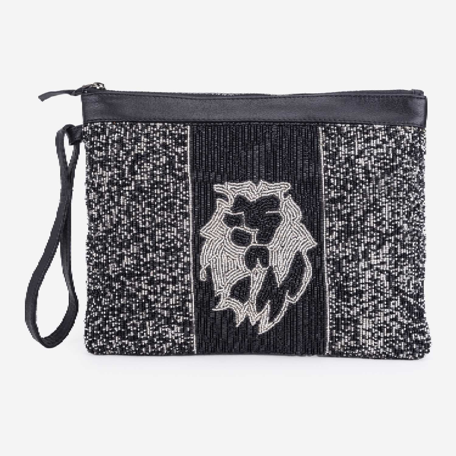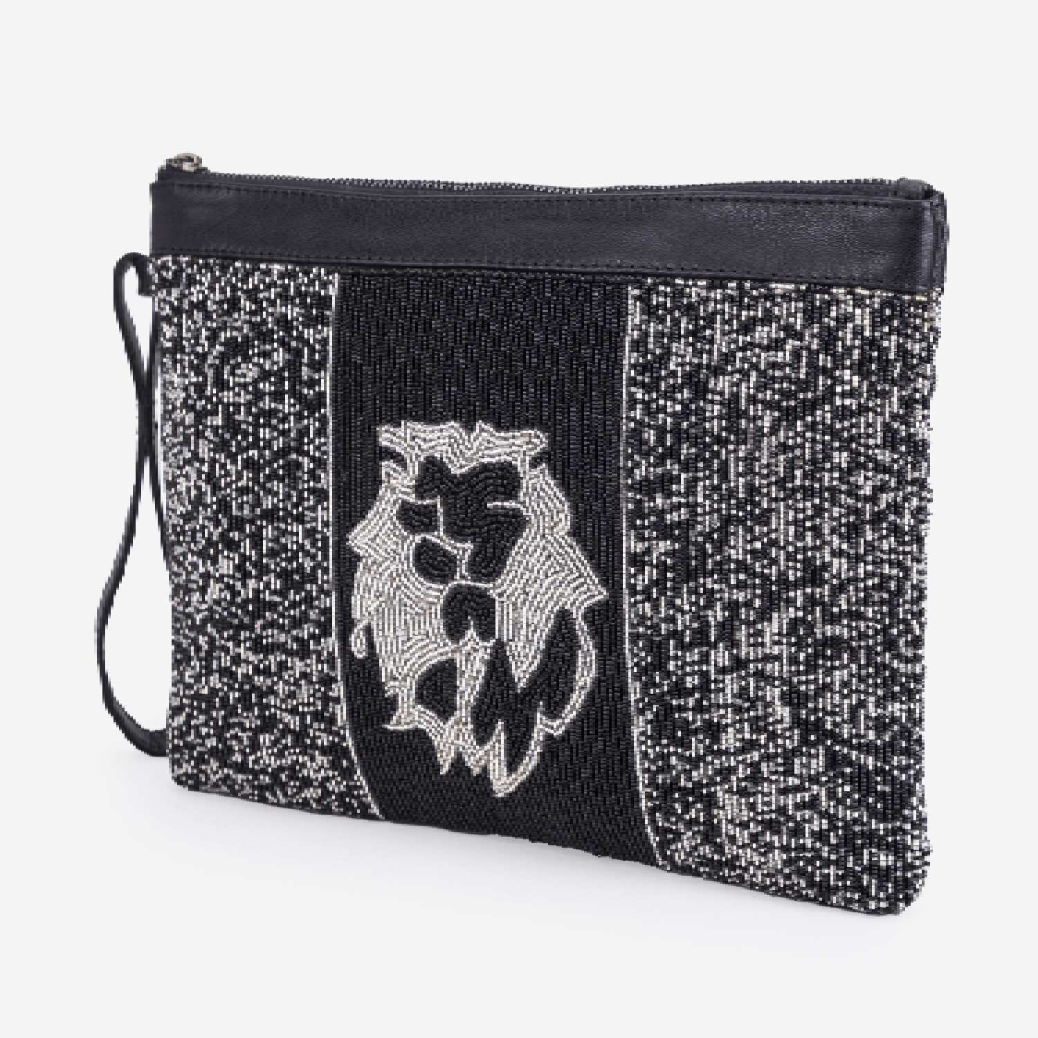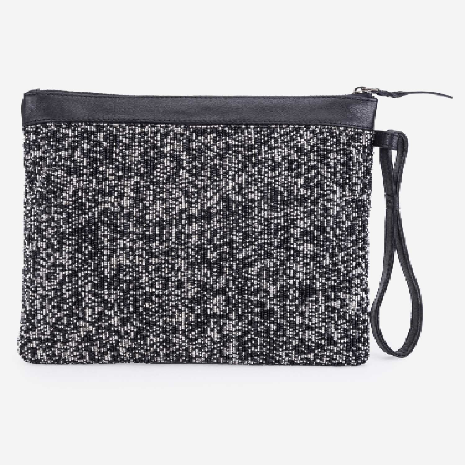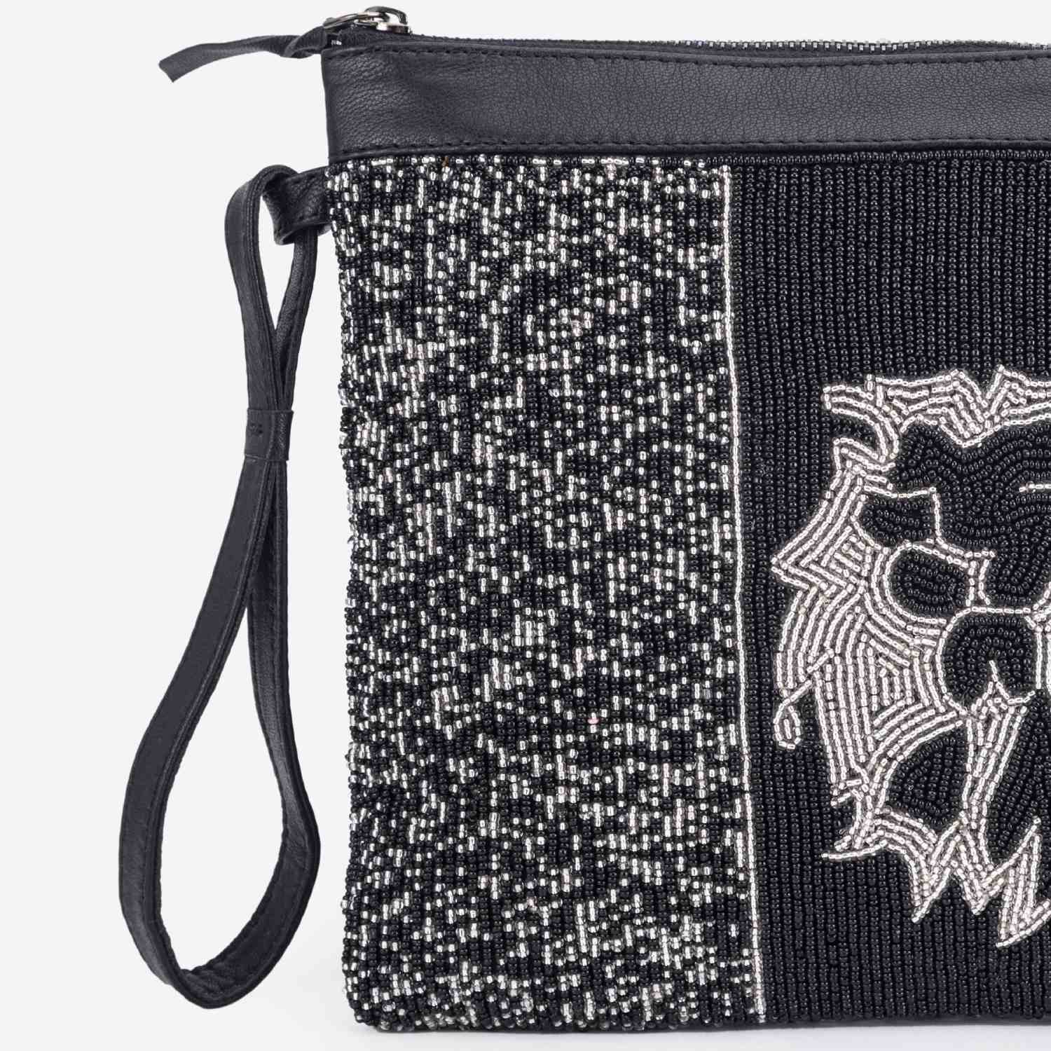 This beautiful handbag features a square shape and comes in a silver-black shade for an elegant look. It is crafted from a combination of leather and beads, offering a mix of textures and durability. The handbag is equipped with a zipper closure, ensuring the security of your belongings.