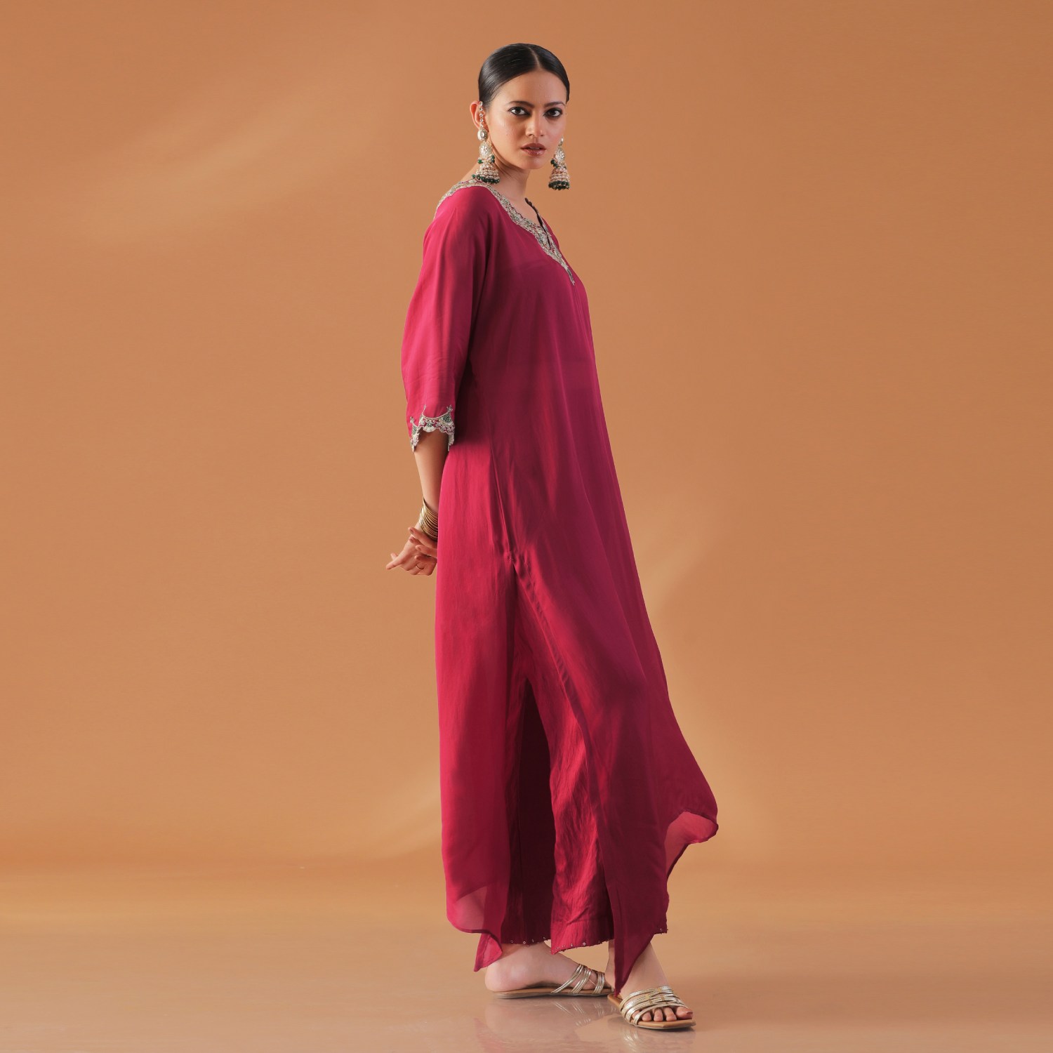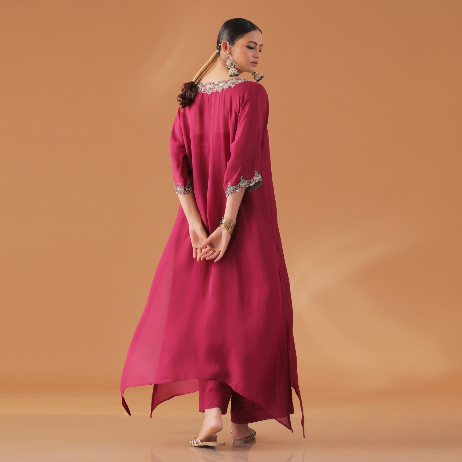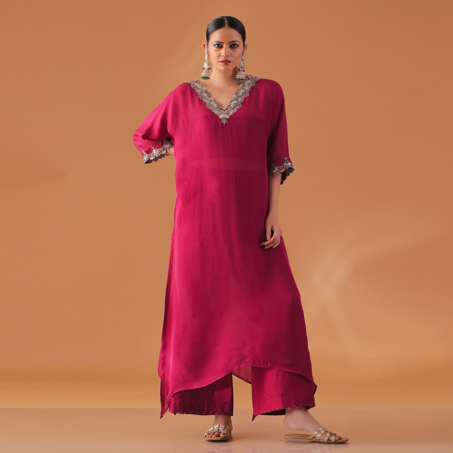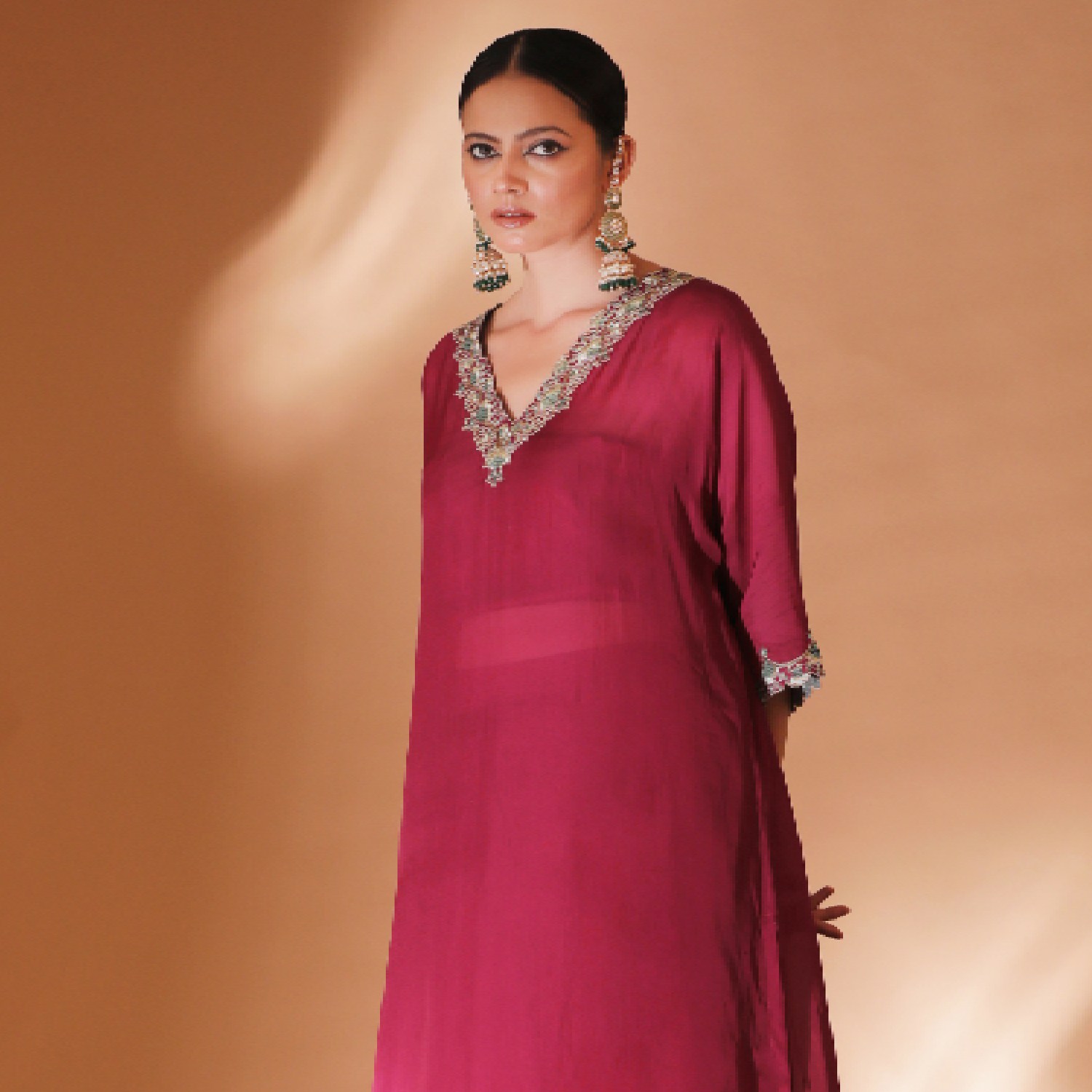 This stunning set includes a mulberry organza kaftan kurta adorned with intricate hand embroidery, featuring a flattering V neckline and elegant elbow-length sleeves. It comes with a matching lycra satin bustier and comfortable chanderi silk pants, completing the look. Pair it with kundan earrings and a bracelet for a dressy evening event.