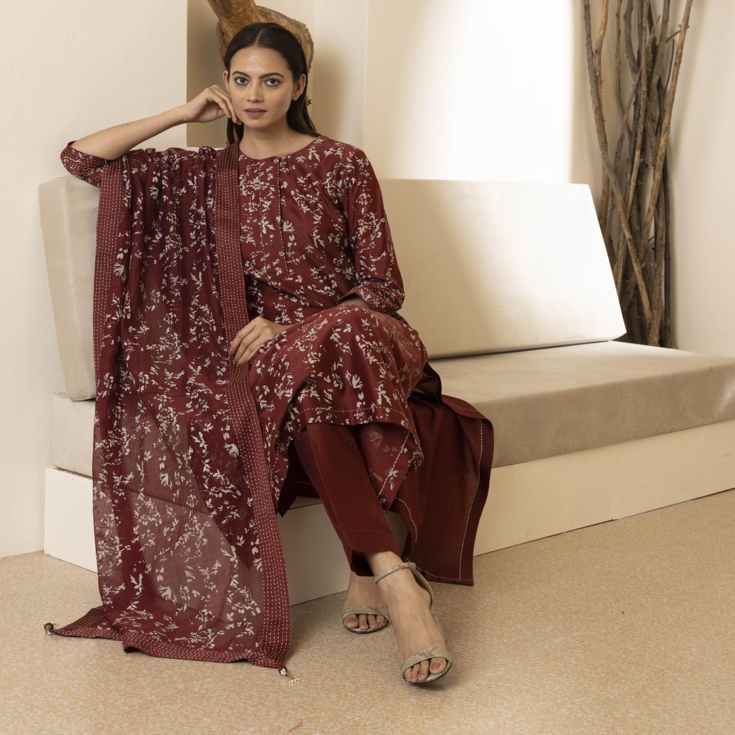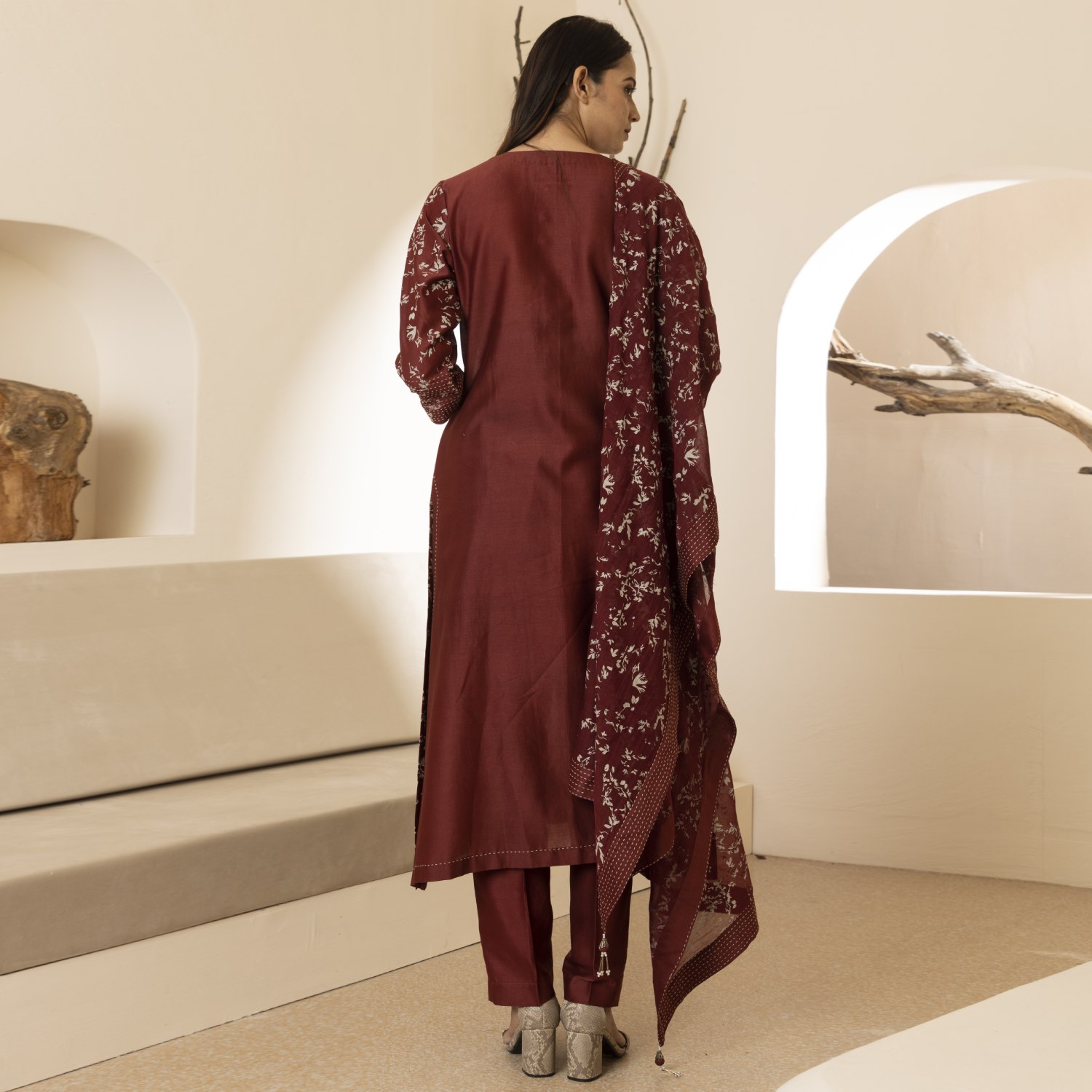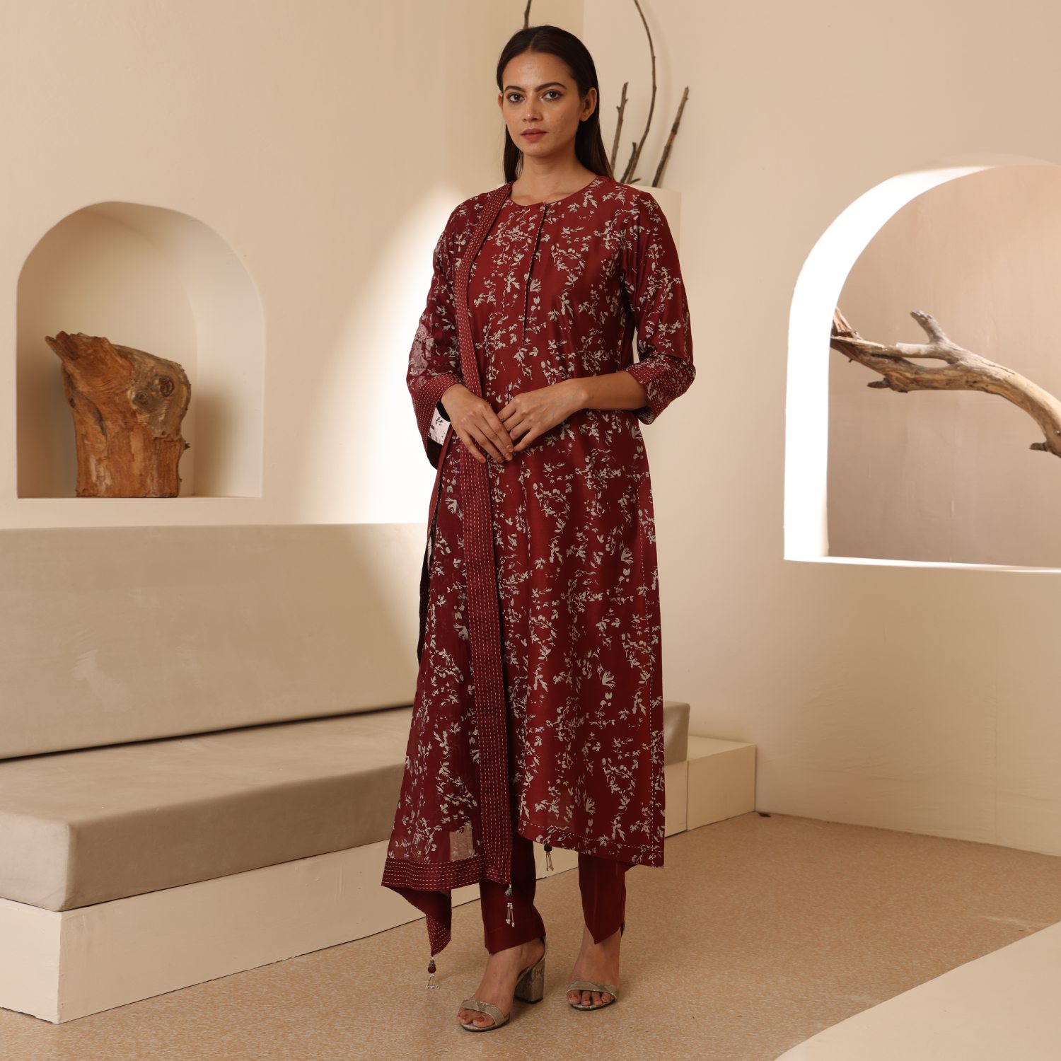 This stunning maroon screen-printed chanderi silk kurta set has delicate chawal taka details along with the print. It falls into a perfect A-line silhouette with a relaxed fit. This set is perfect for various occasions. Pair it with delicate jewellery and heels for festivities and weddings.