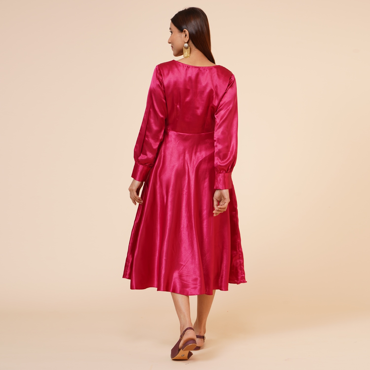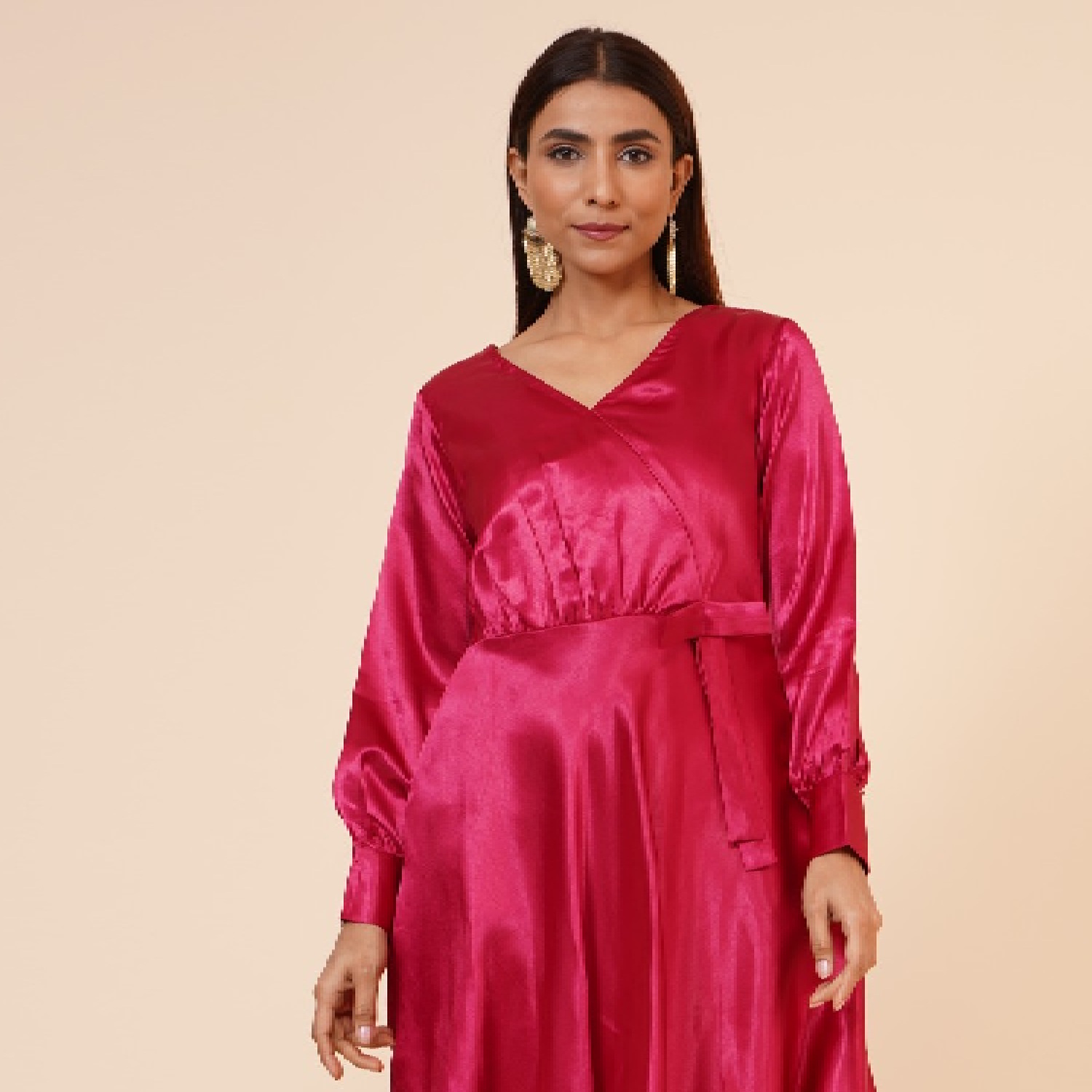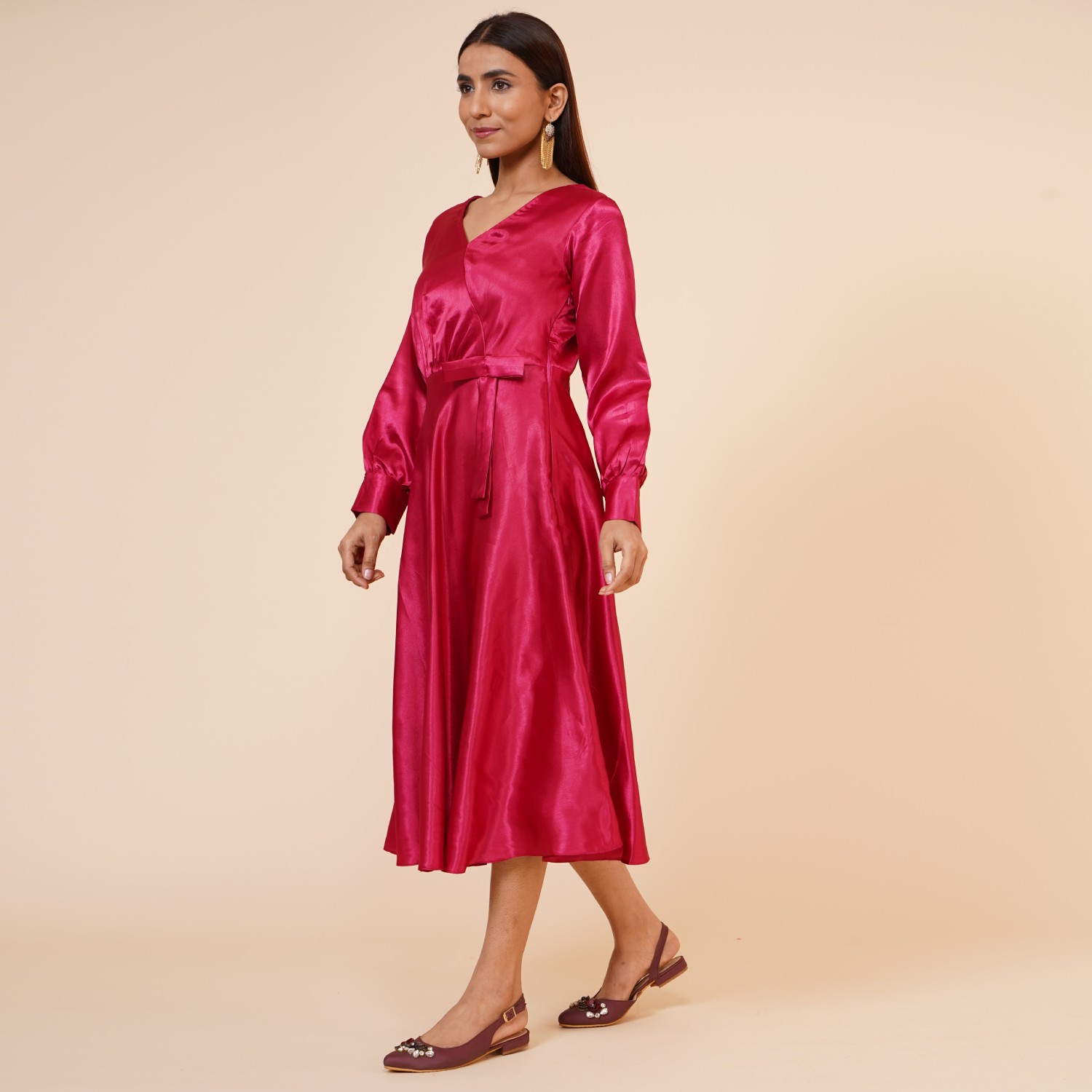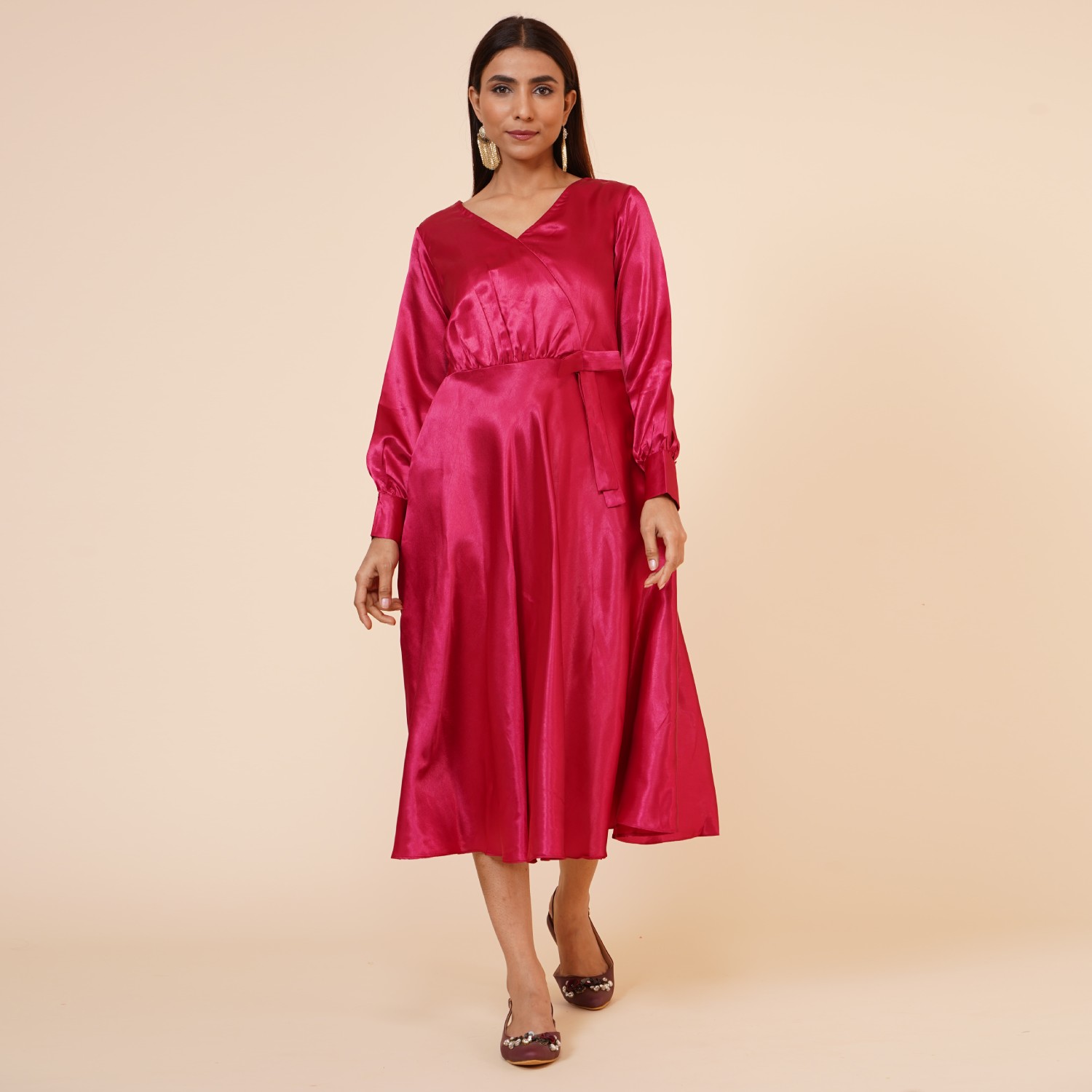 ₹ 1,500 (20% off)This beautiful maroon dress is crafted from luxurious satin fabric. The empire line design creates a flattering high waistline, enhancing your figure and giving you an elegant silhouette. It features a stylish ribbon drape and a knee-length hem, making it a versatile option of various occasions. The dress is lined with hosiery fabric and offers a regular fit, providing all-day comfort.