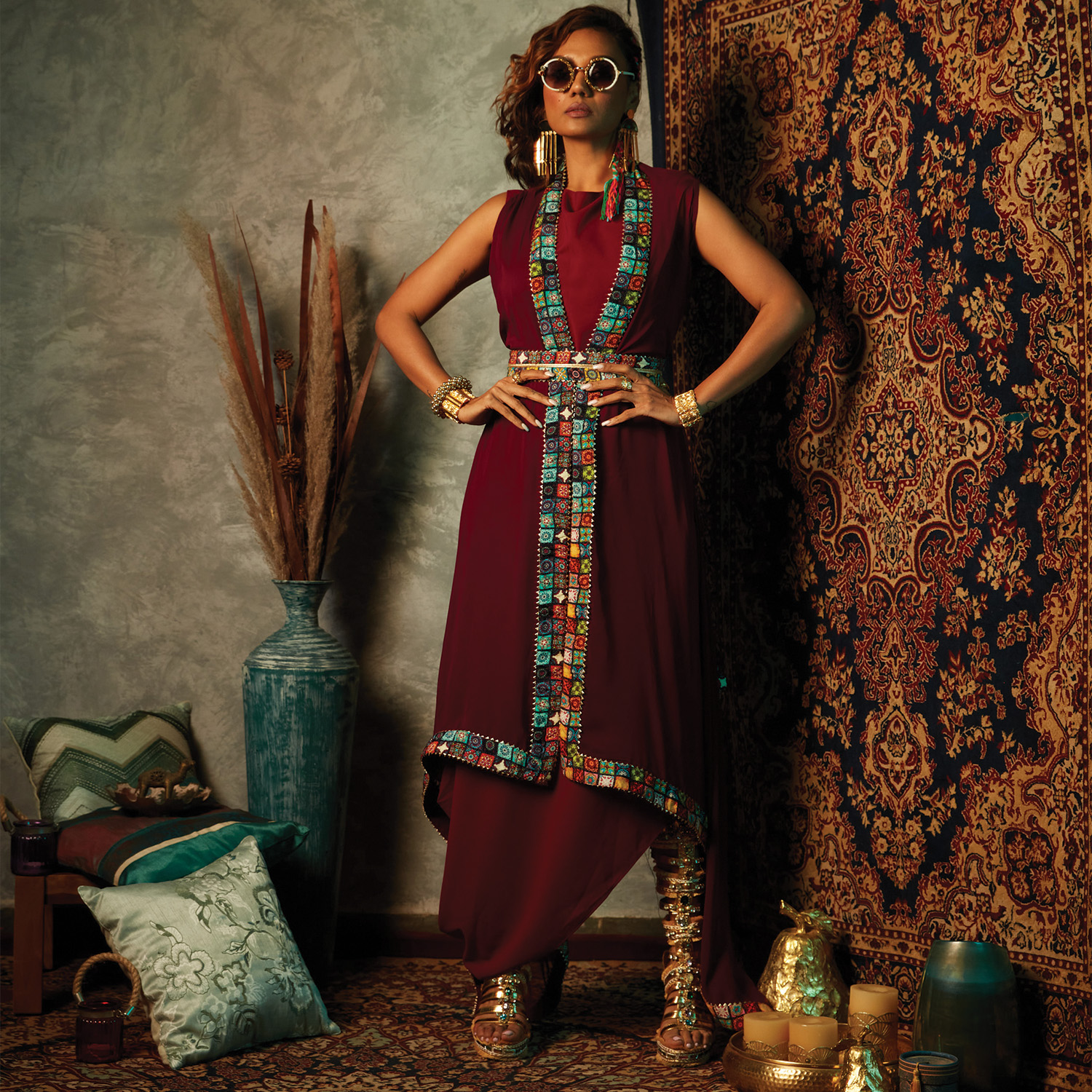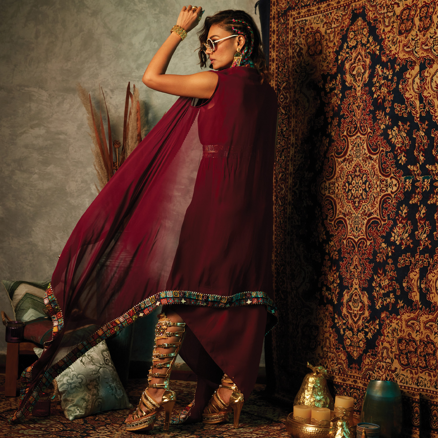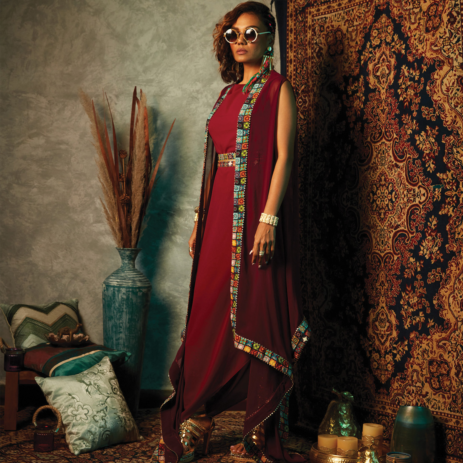 This sleeveless cape, made from a comfortable viscose crepe, features an asymmetrical neck for a unique look. The multicolor tile border adds vibrancy to the purple base, and the below-knee length design exudes elegance. Style it with a chunky bracelet and heels for a dressy evening event.