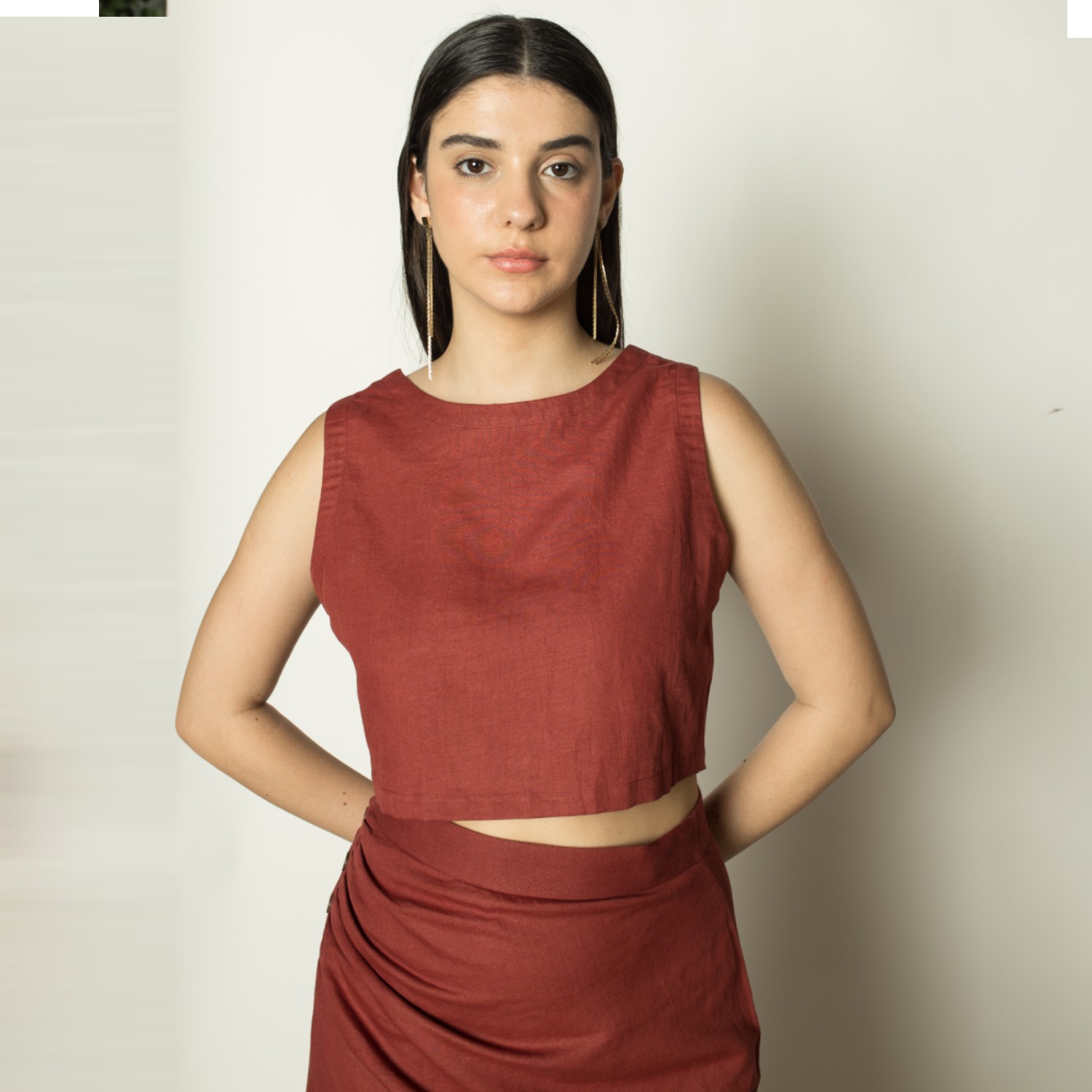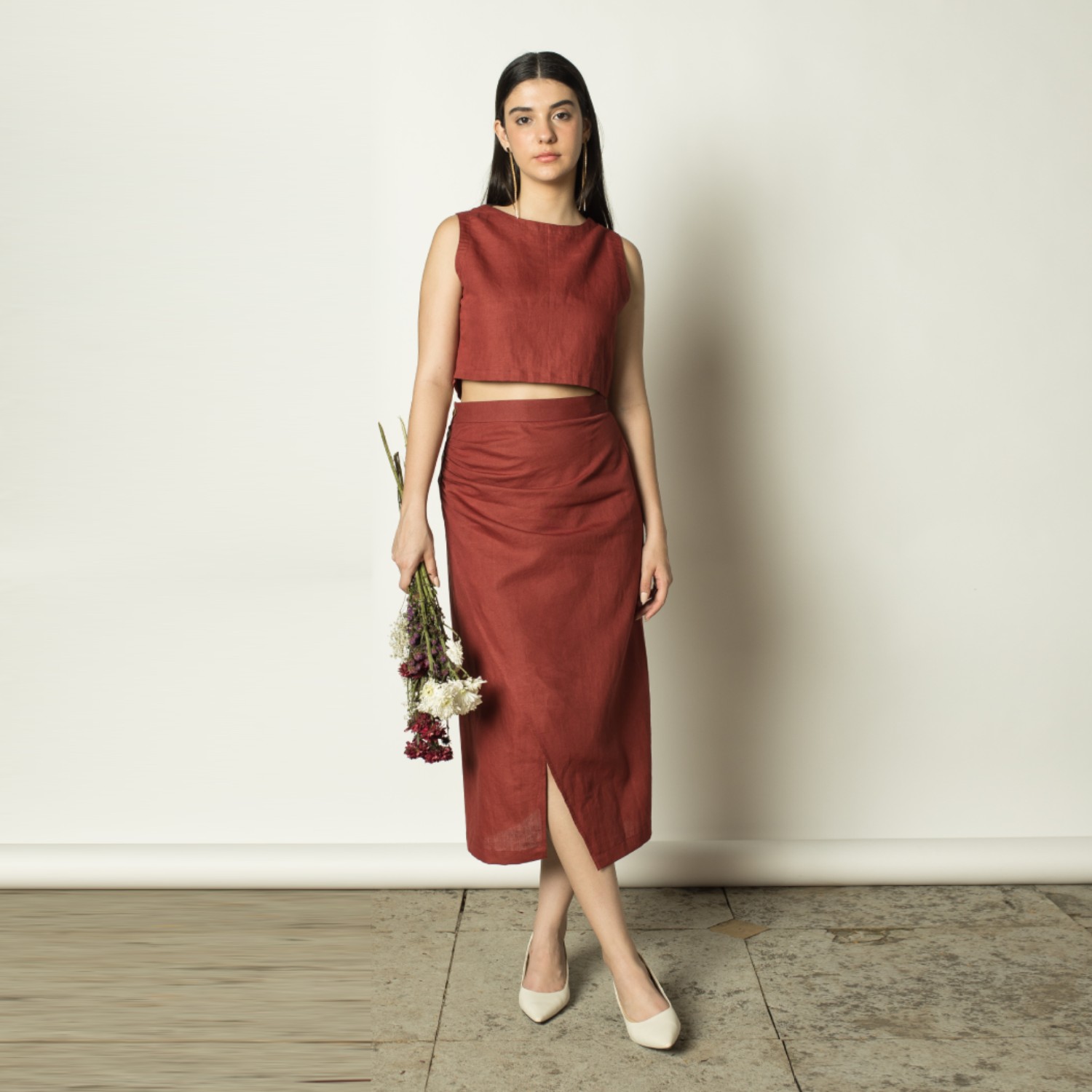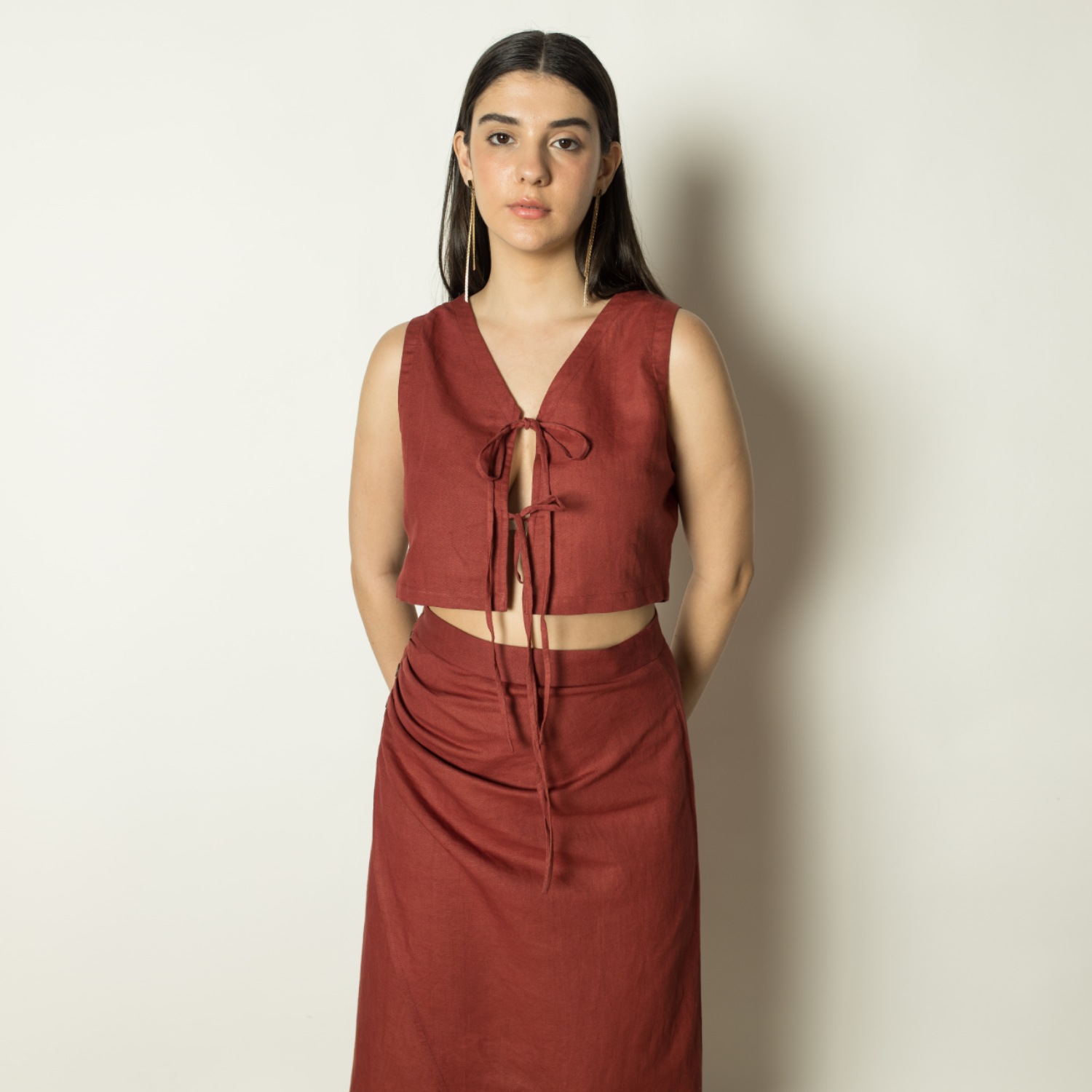 This functional crop top is meticulously designed for a flattering fit, accentuating the form with special attention to detail. Its two-way wearability adds versatility to your wardrobe. For a coordinated look, pair it effortlessly with the wrap-around skirt, offering both style and comfort for any occasion.