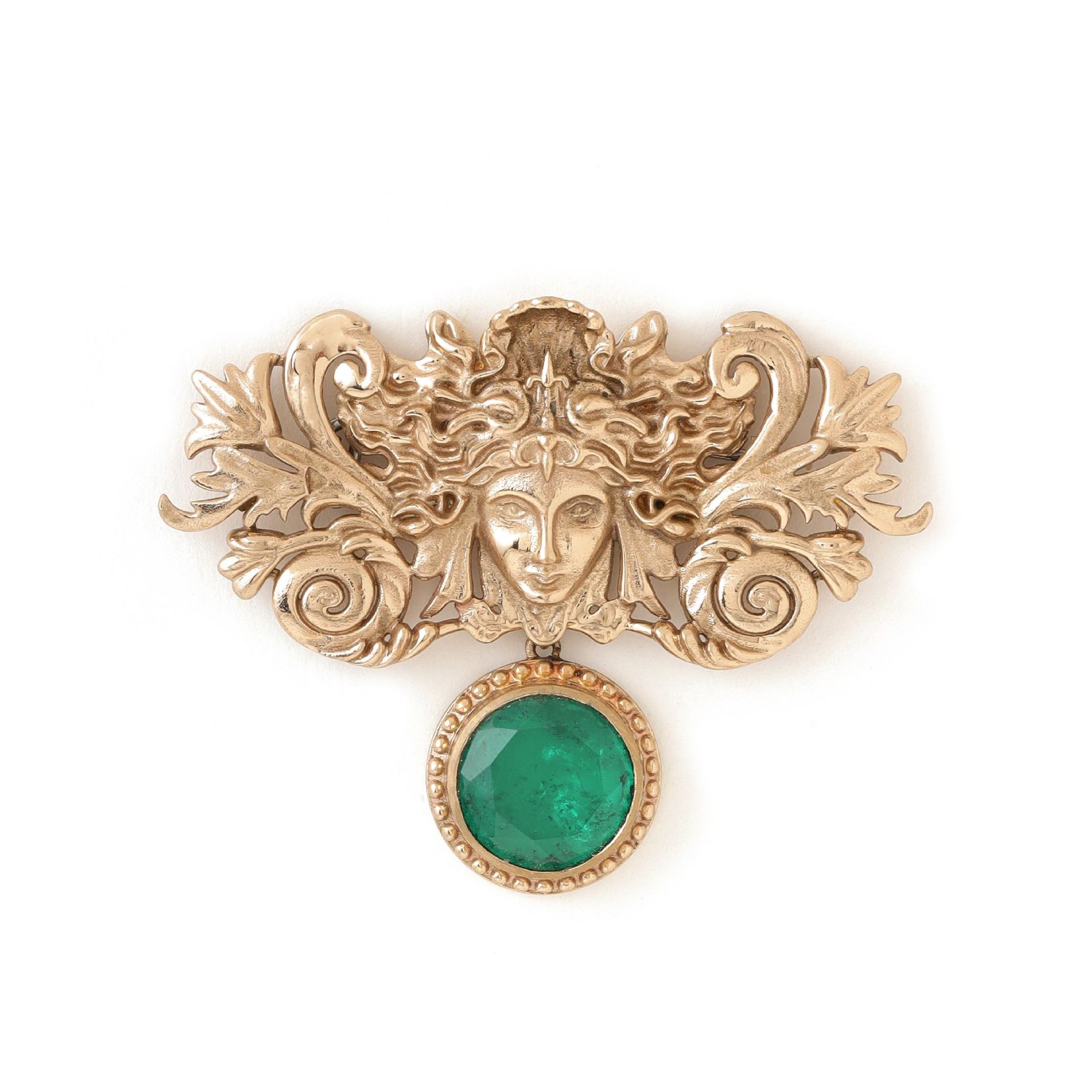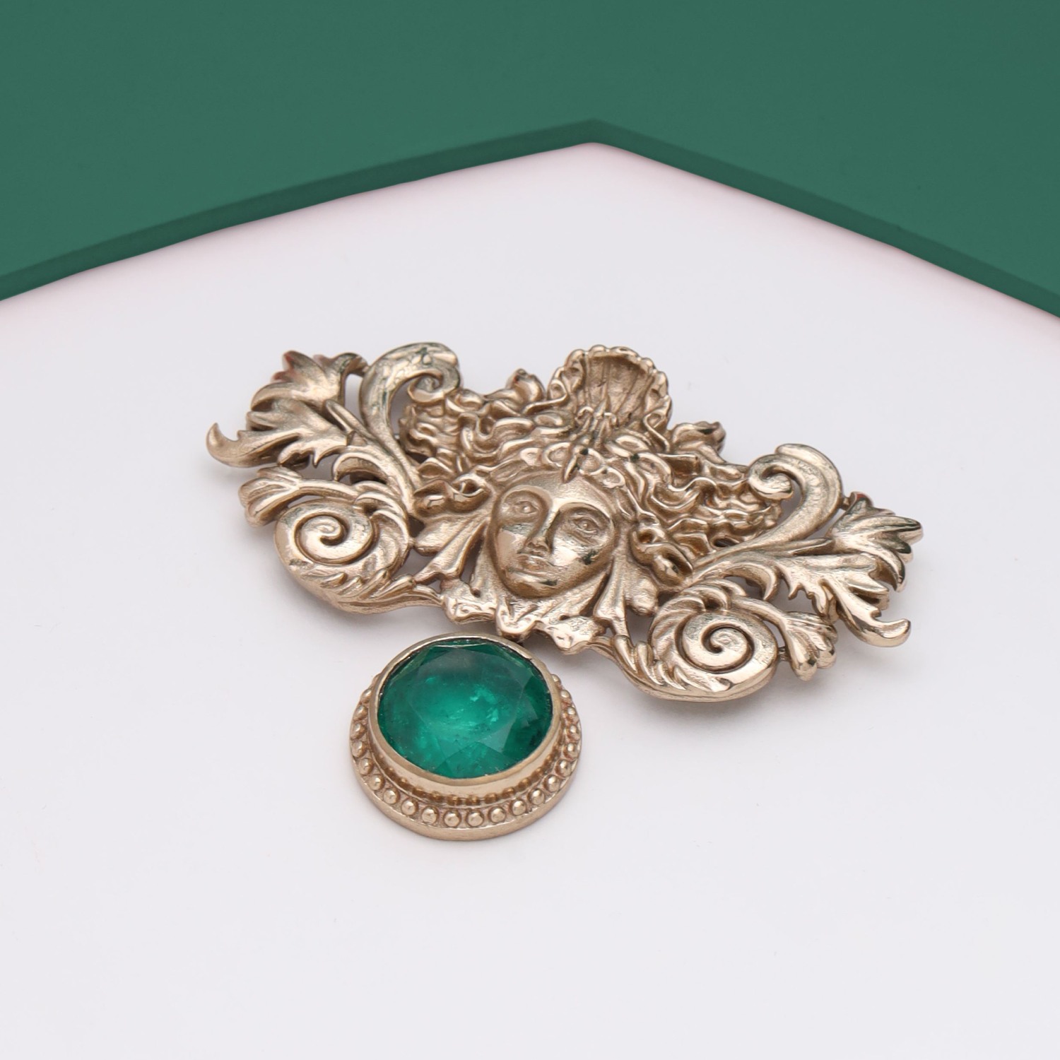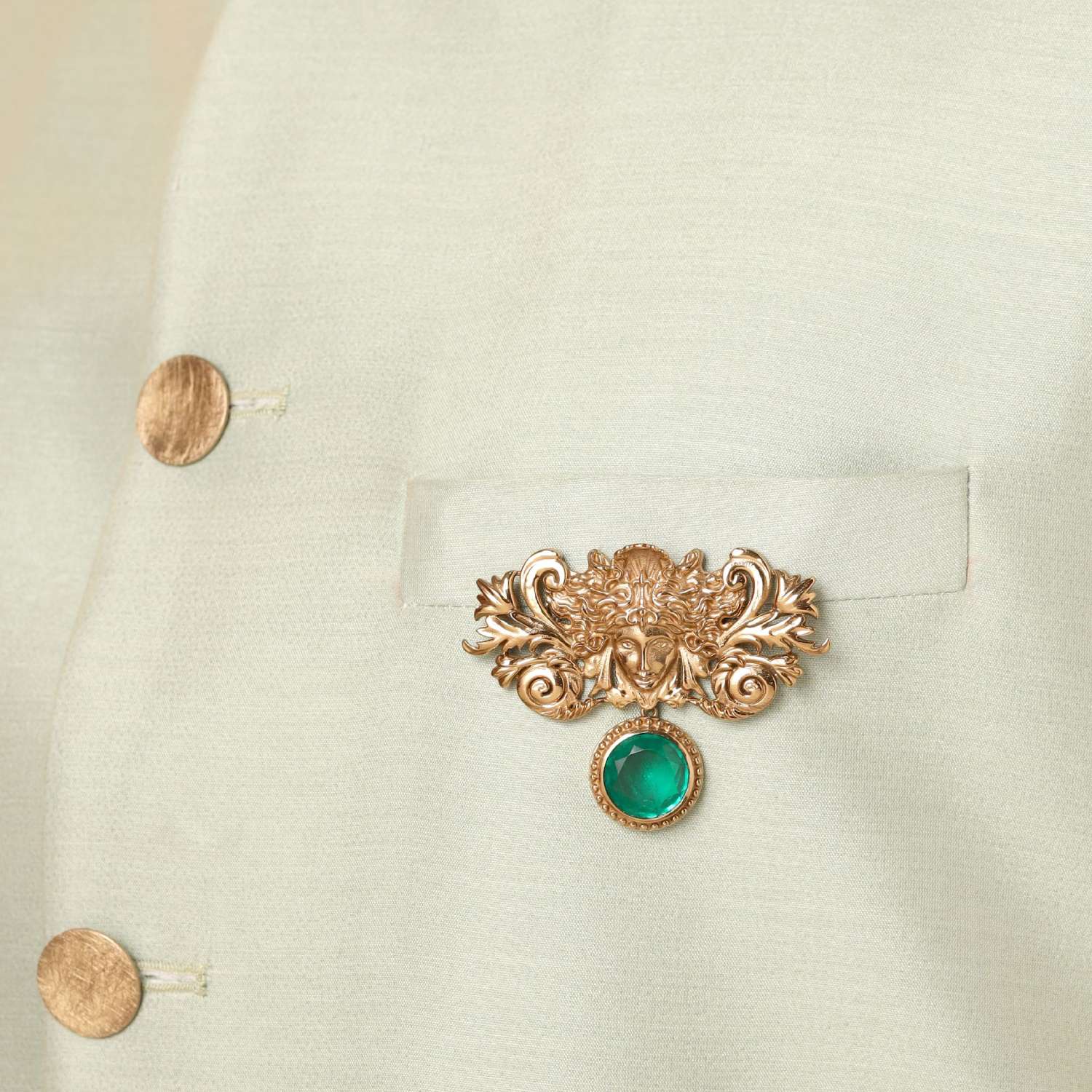 ₹ 3,300 (5% off)This stunning brooch features an intricately designed Medusa figure adorned with a rich green gemstone. Set against a gold base, this brooch exudes a sense of sophistication and uniqueness. Pair it with a bandhgala jacket and formal shoes for weddings or festivities.