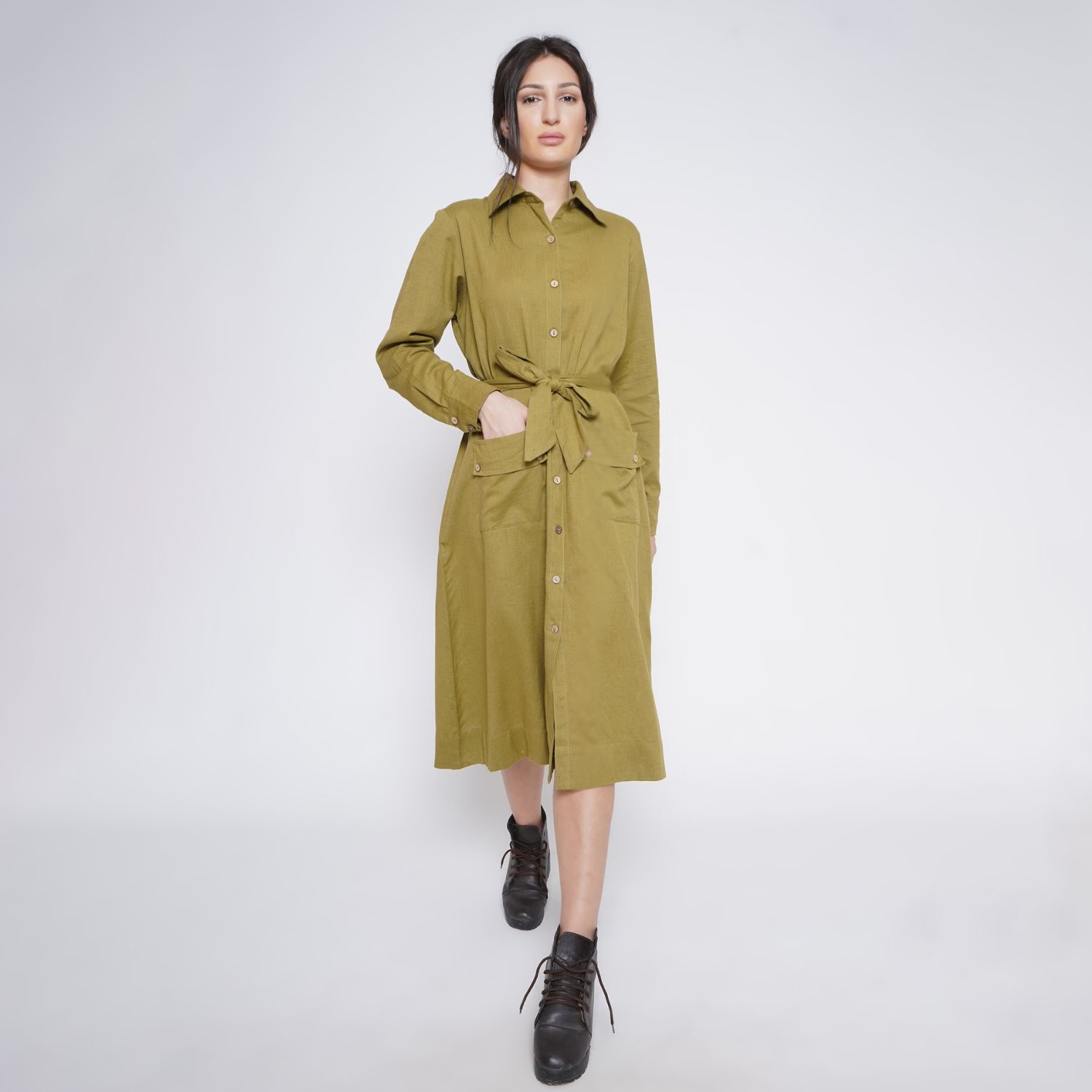 ₹ 4,200 (20% off)This collared buttoned shirt dress features a waist tie-up crafted from the same fabric, allowing you to customize the fit. Made from a linen blend, this dress offers a relaxed fit and full sleeves that are perfect for various occasions. Style this dress with a delicate pendant and a wristwatch for a casual day out.