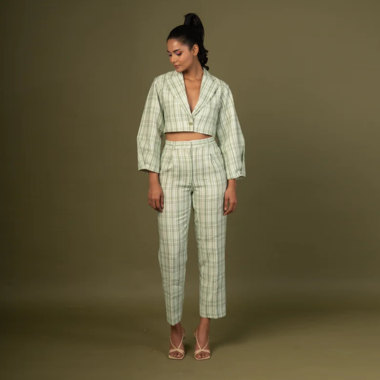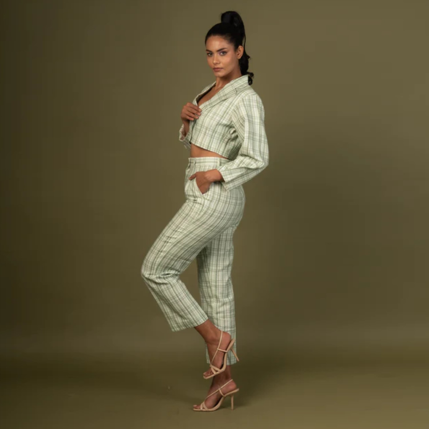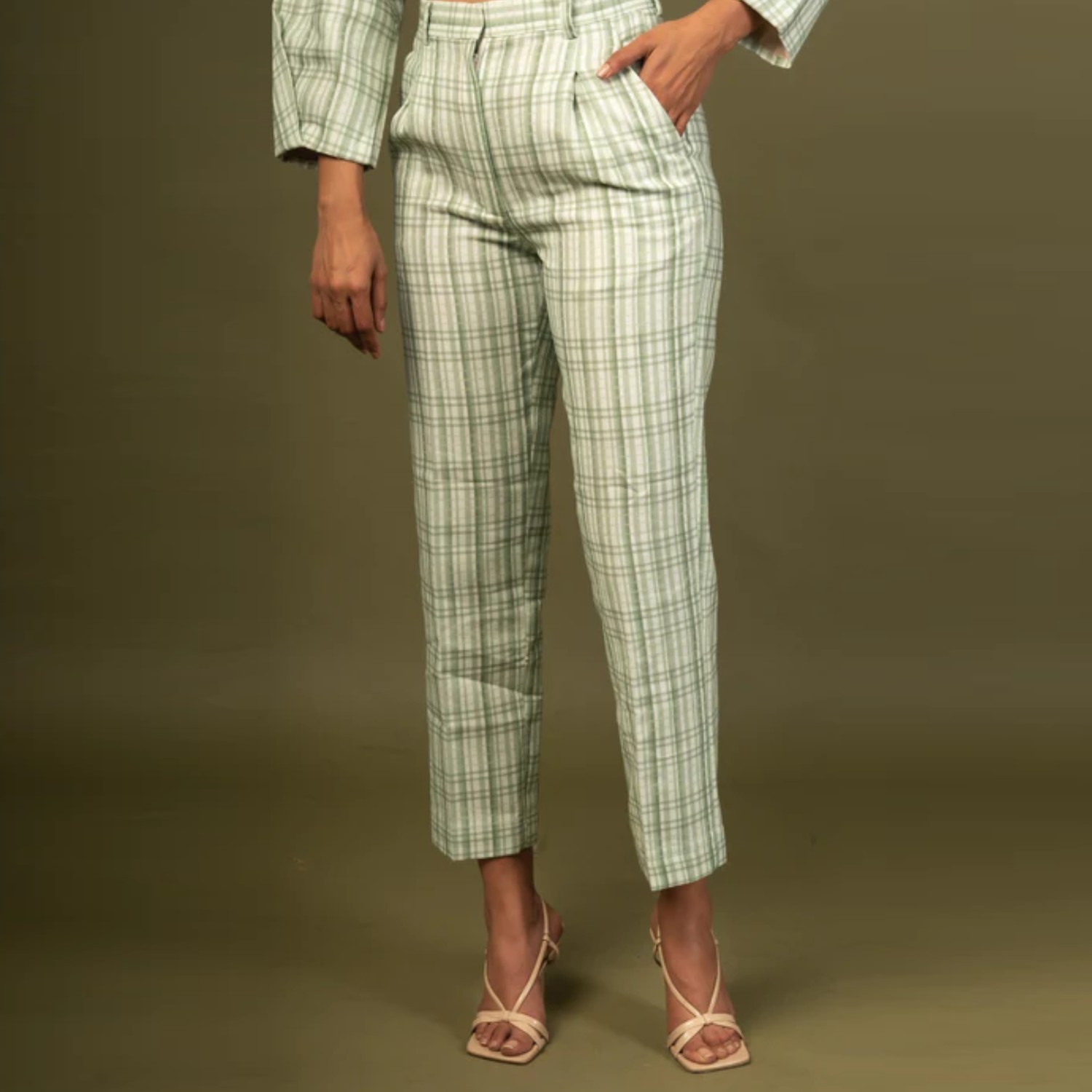 ₹ 3,900 (25% off)Crafted from high-quality linen fabric, these pants feature mint green checkered on a white base. These pants have a relaxed fit, offering a flattering silhouette. Style it with statement gold hoops and heels for a dressy event.
