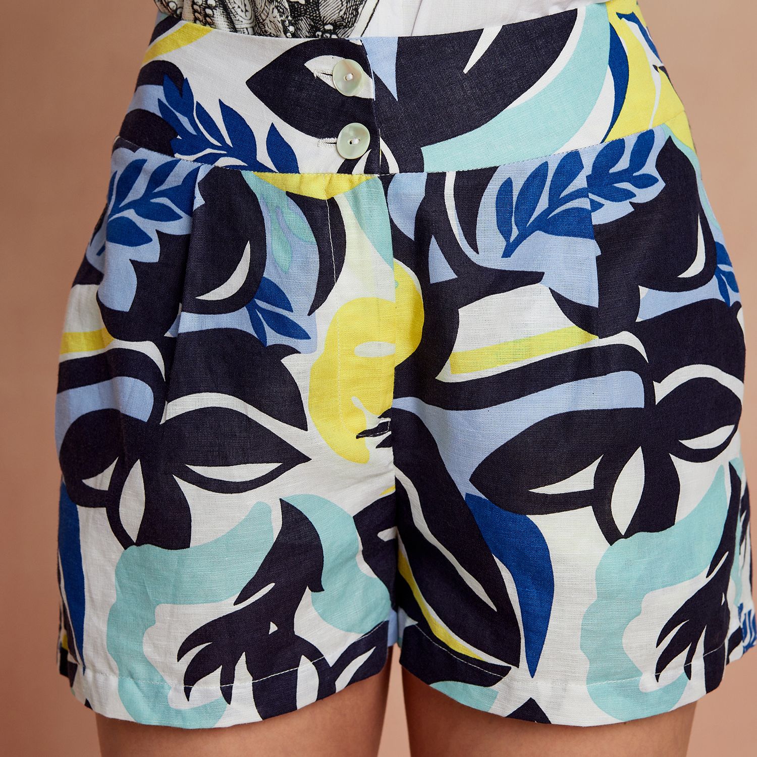These shorts feature a captivating multi-color monstera print, adding a touch of fun and freshness to your summer wardrobe. Crafted from a comfortable blend of cotton and linen, they offer a lightweight and breathable feel.