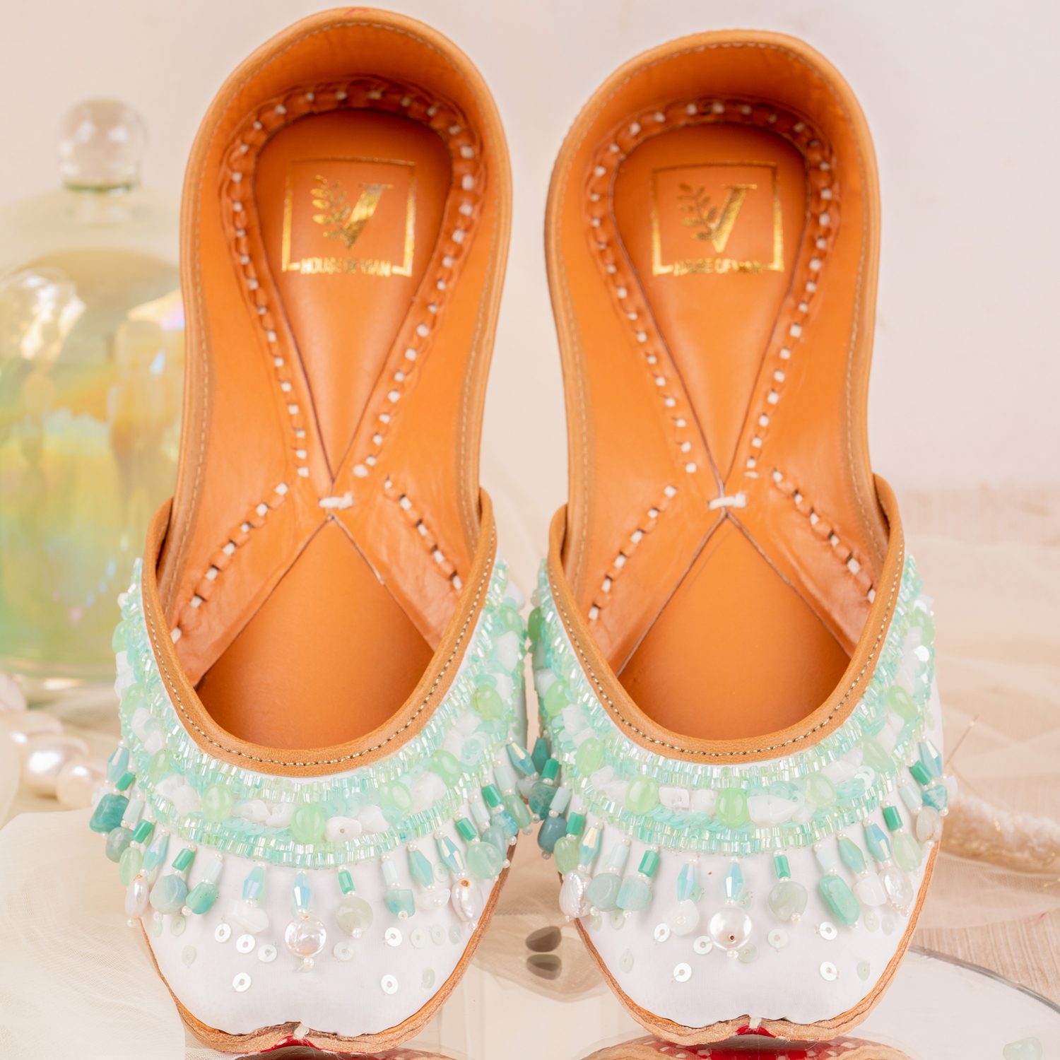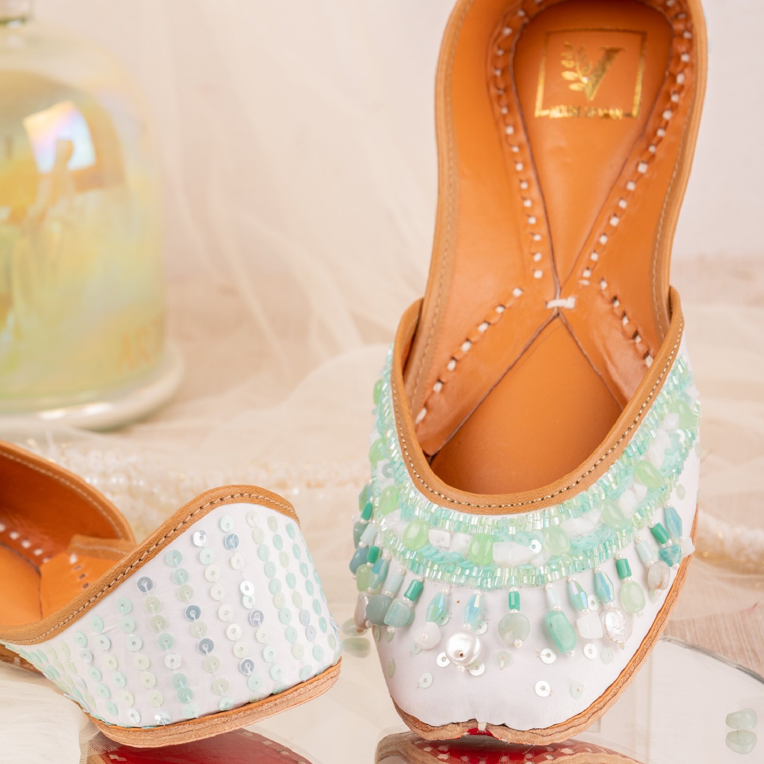 Crafted from high-quality crepe material in a white shade, these juttis feature real freshwater pearls, sequins, and beads, adding a subtle sheen to the look. The leather lining and pure leather sole ensure style and durability. Style them with a green kurta and a sling bag for weddings or festivities.
