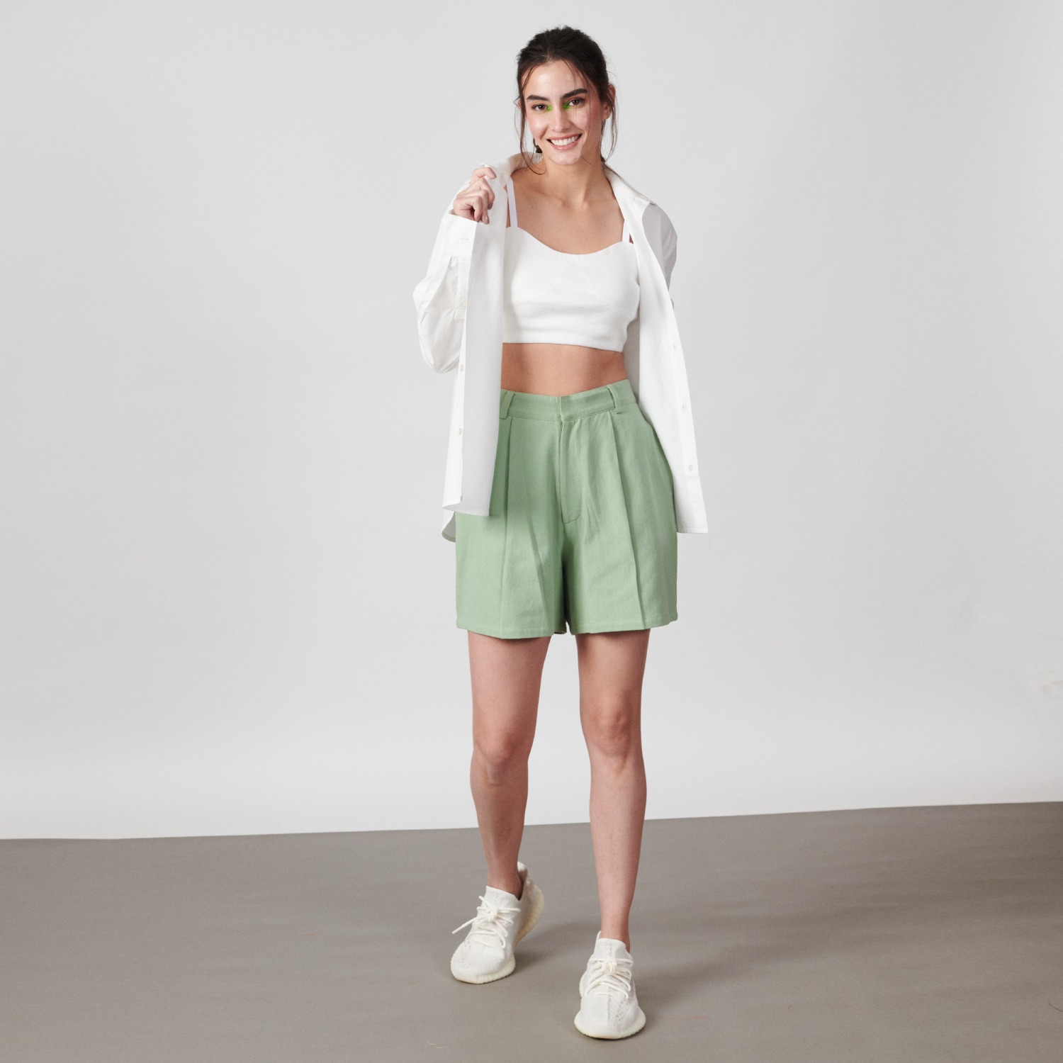 Crafted from high-quality cotton fabric, these shorts have a refreshing pista green shade. These shorts feature a tailored silhouette and a high waist. The inclusion of pockets offers convenience and functionality. Style them with a white top and heels for a dressy day soiree.
