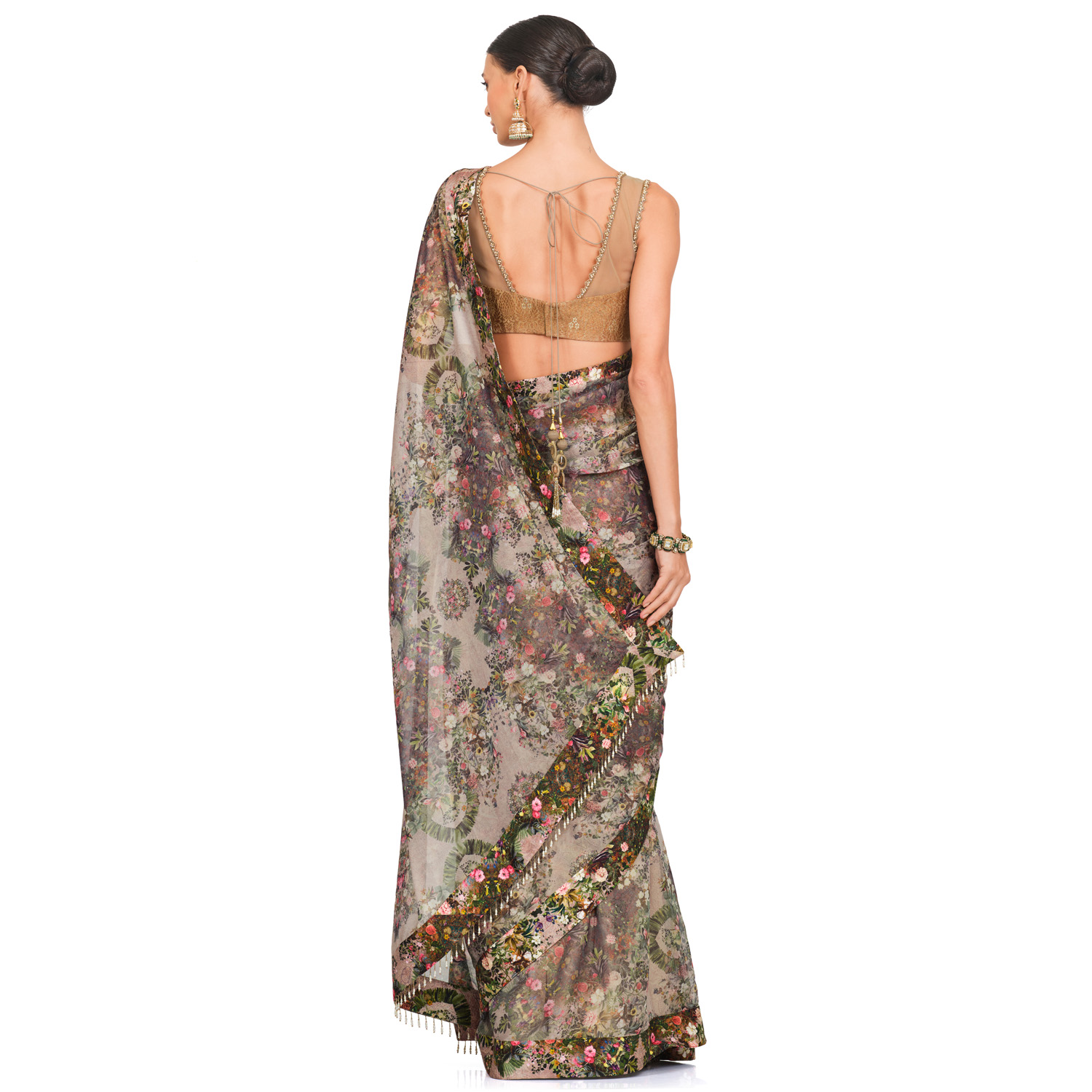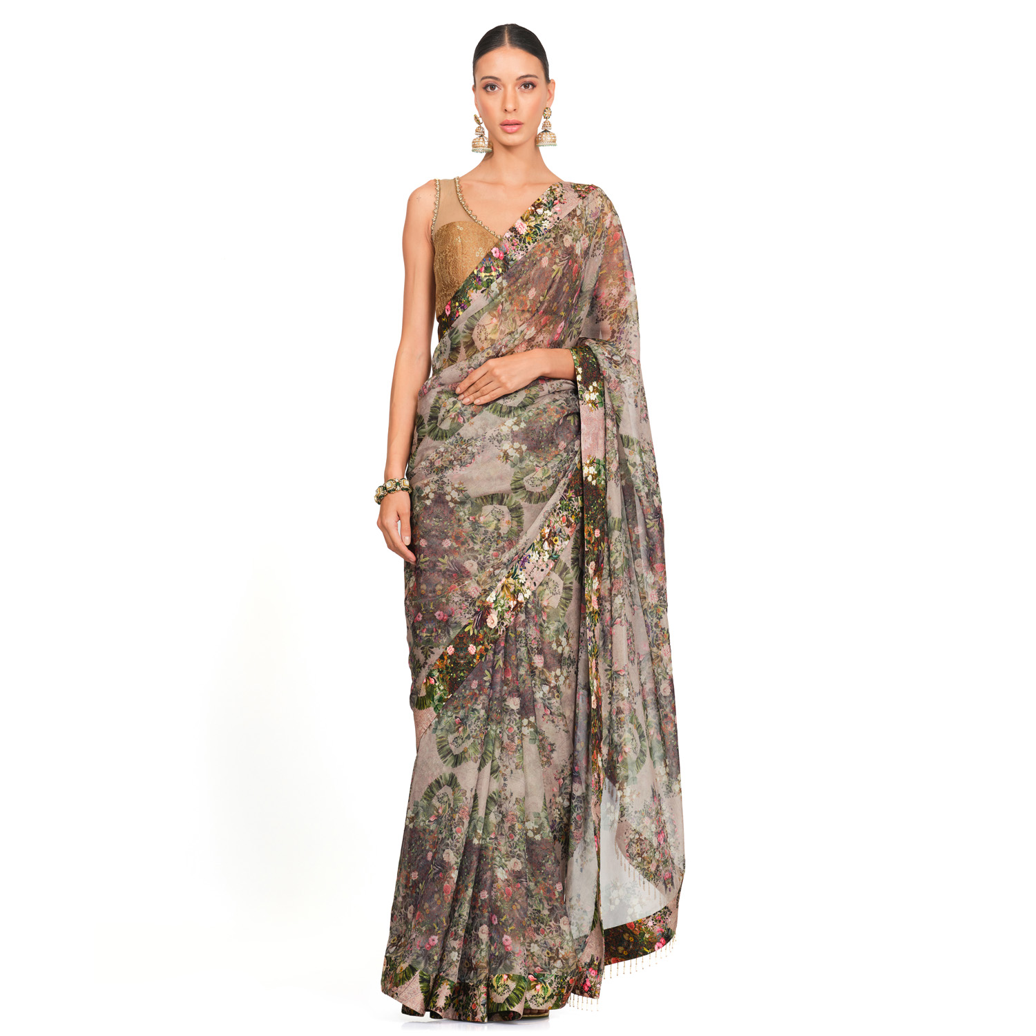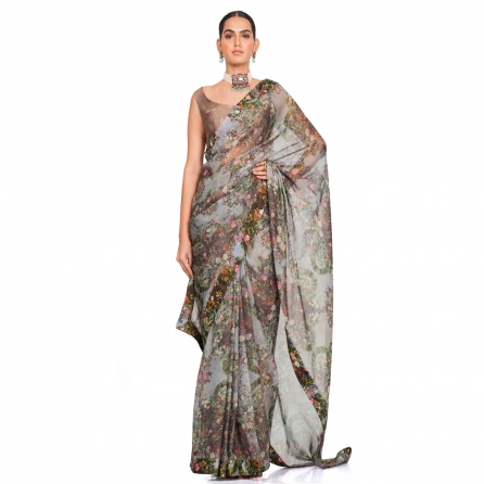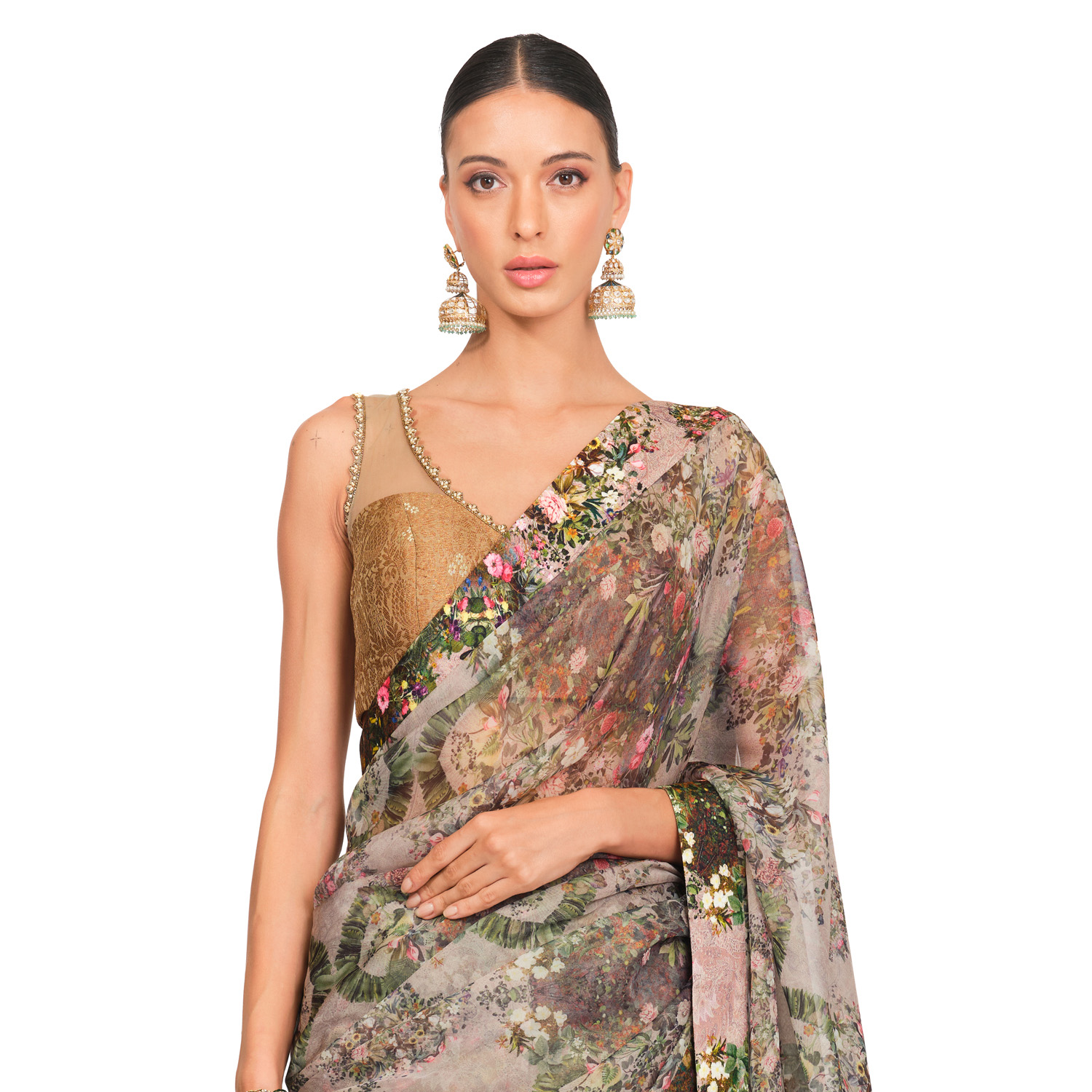 This saree is made from lightweight and sheer organza fabric with a beautiful multicolor print. The sleeveless blouse is crafted from brocade fabric and has beautiful scallop detailing. The set includes an underskirt to provide a secure base for draping the saree. Pair this saree with gold jewellery and a clutch for weddings or festivities.