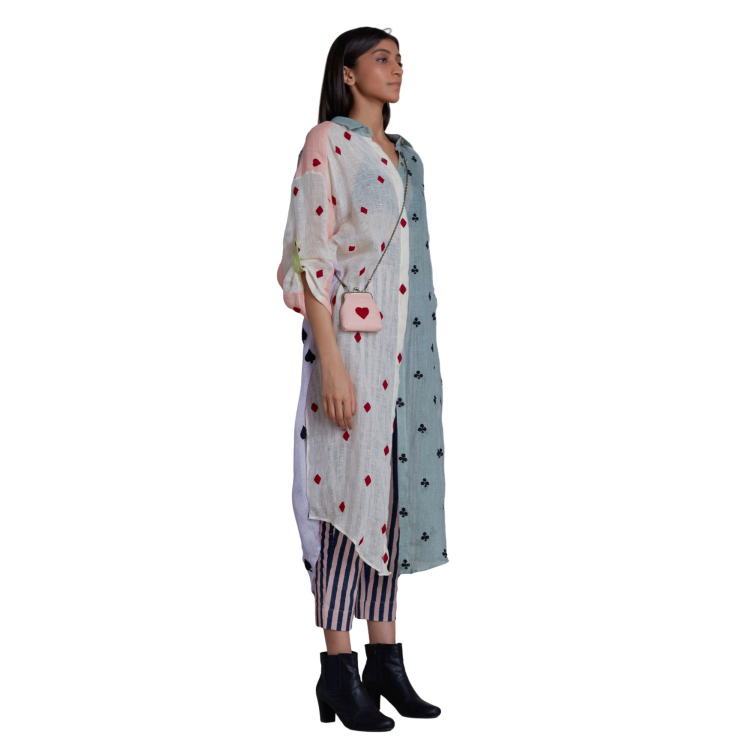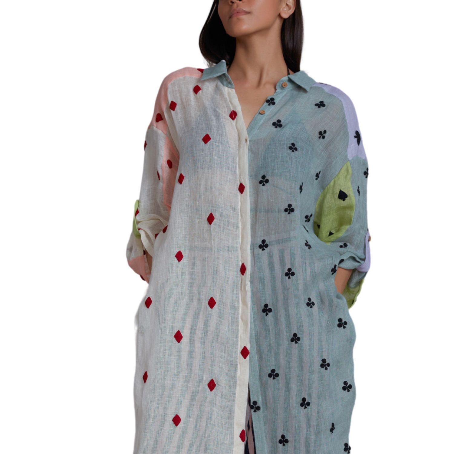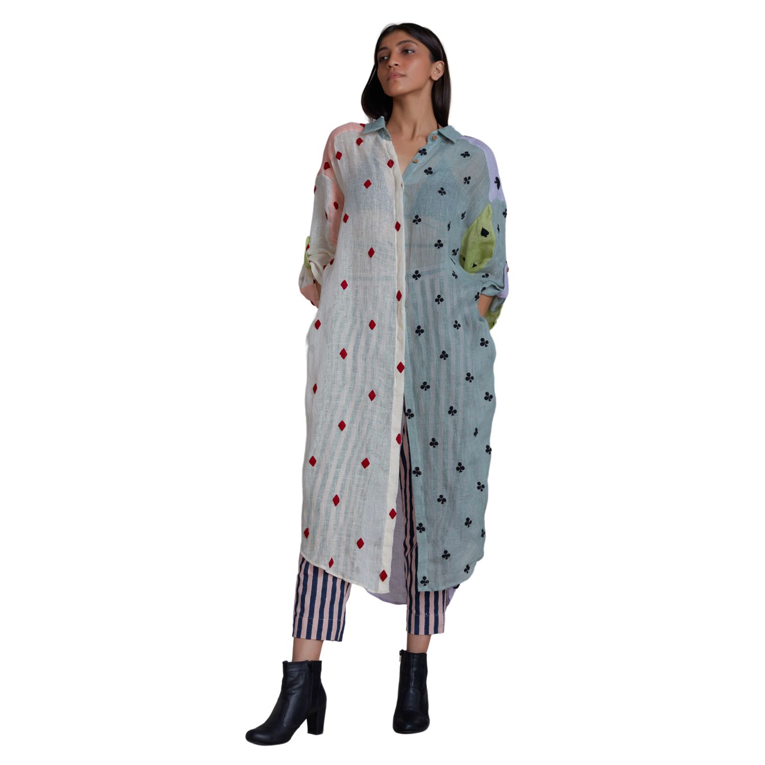 ₹ 21,300 (10% off)Experience the epitome of style and comfort with this color block embroidered pure linen shirt. The v-neck buttoned down detailing and the playful interplay of colors make it perfect for an edgy festive look. This set also includes well-fitted striped pants, featuring elastication at the back for a comfortable fit. Embrace this ensemble to effortlessly showcase your style while enjoying the perfect balance of sophistication and ease