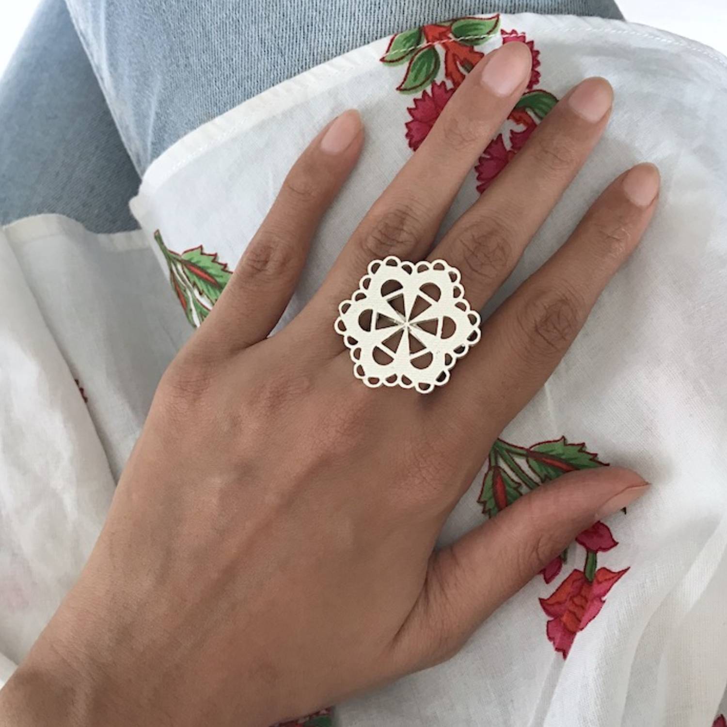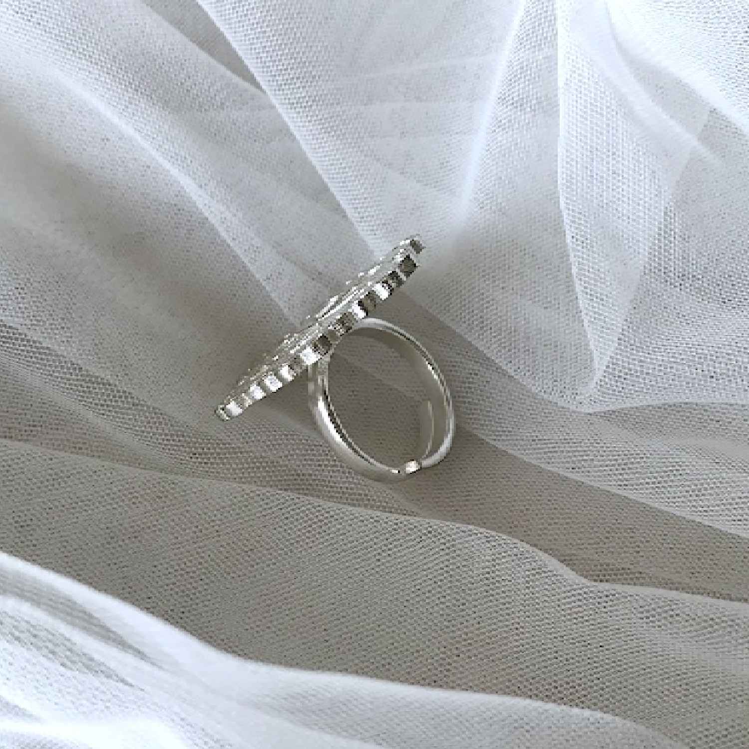This silver ring is an elegant masterpiece, handcrafted with high-quality brass. Its exquisite design and fine craftsmanship make it a standout piece of jewellery. The ring is adjustable, allowing for a comfortable fit, and its matte silver finish adds opulence to the overall look.