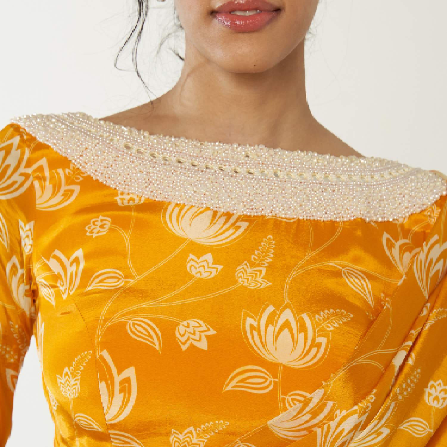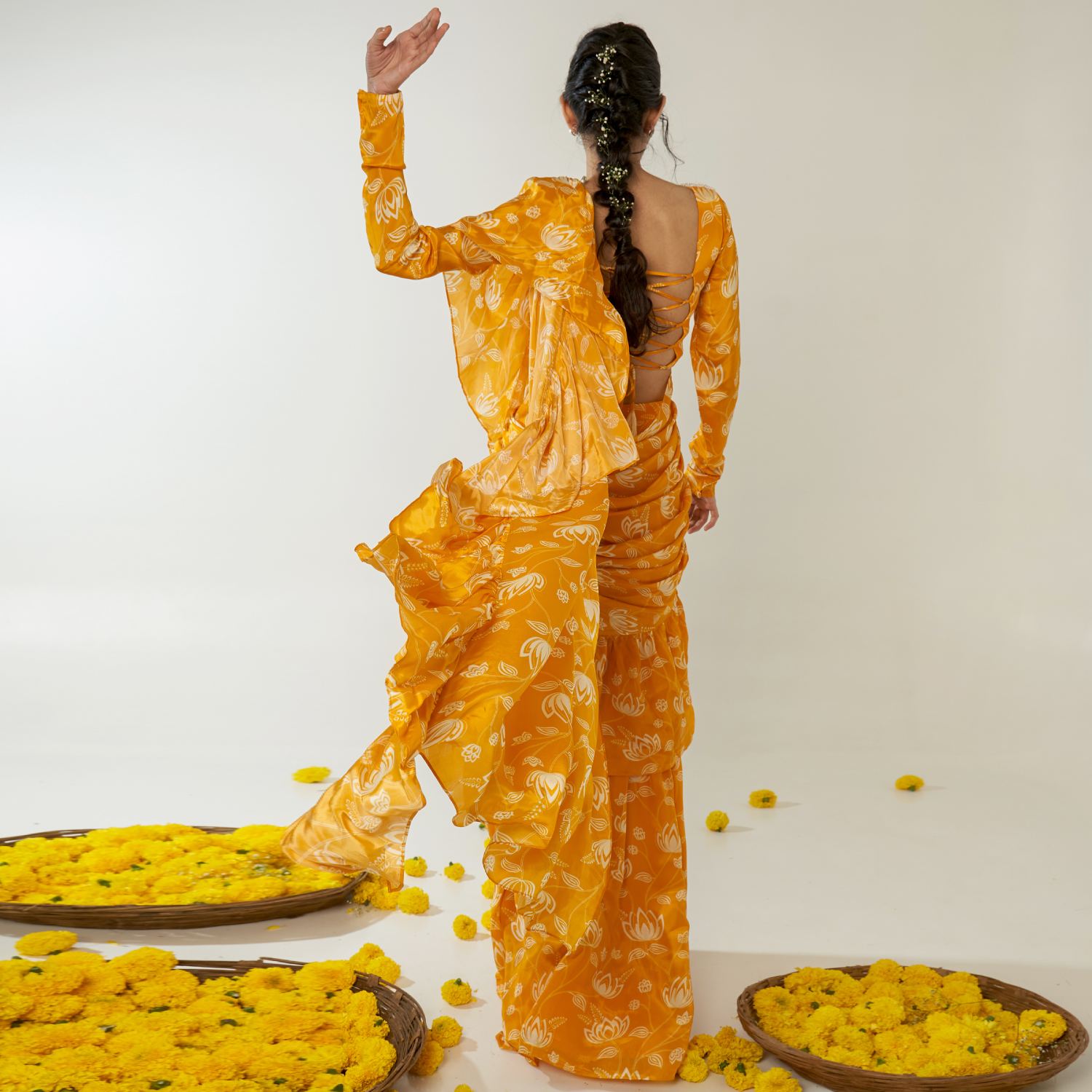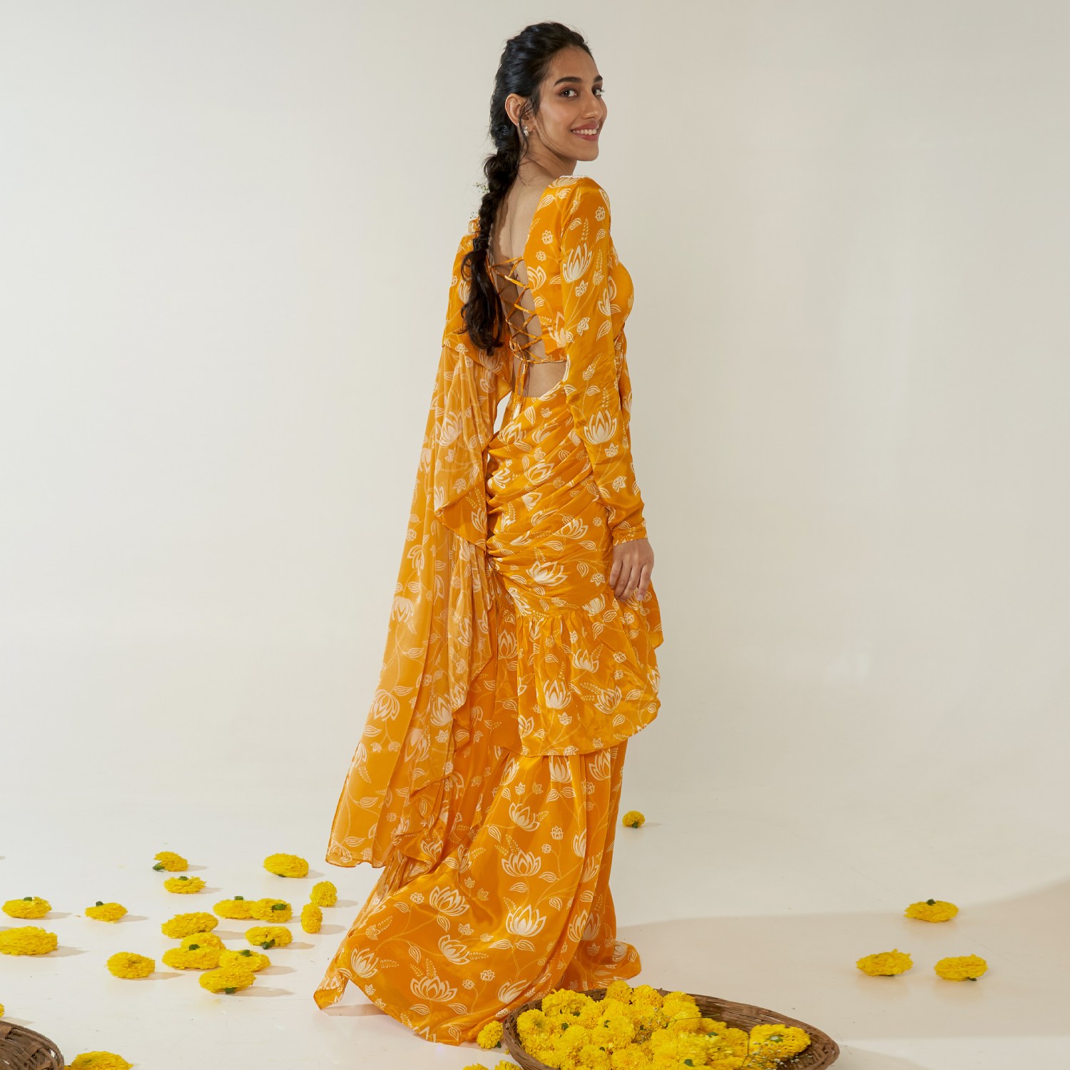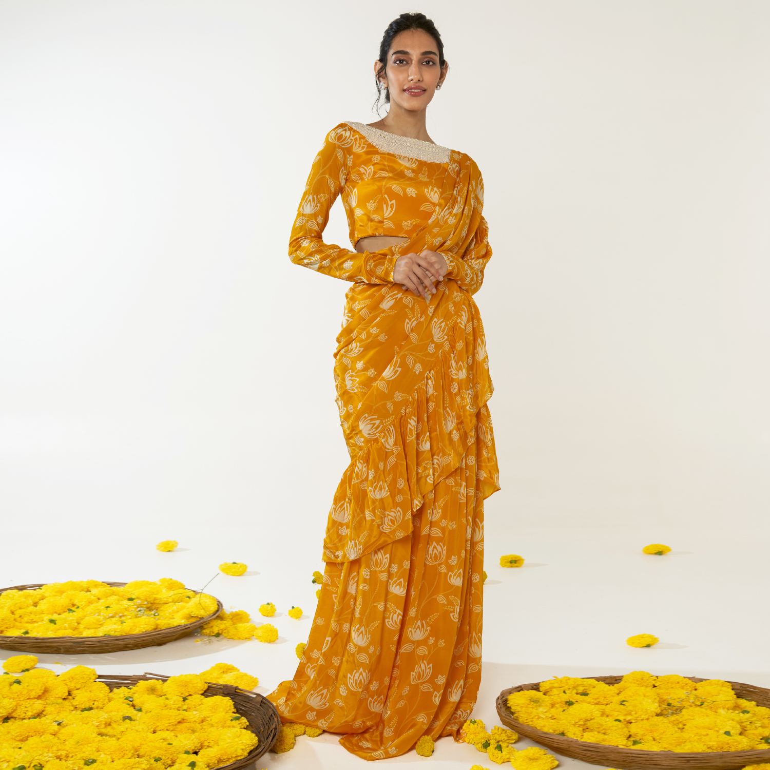 ₹ 22,500 (15% off)This gorgeous set includes a ruffle saree with a pre-stitched pallu, making it easy to drape and creating an elegant look. The set comes with a blouse, and its neckline is hand-embroidered with pearls, white glass beads, resham, and mirrors, adding intricate detail to the design. The saree and blouse are made from crepe, which offers a smooth and comfortable drape.