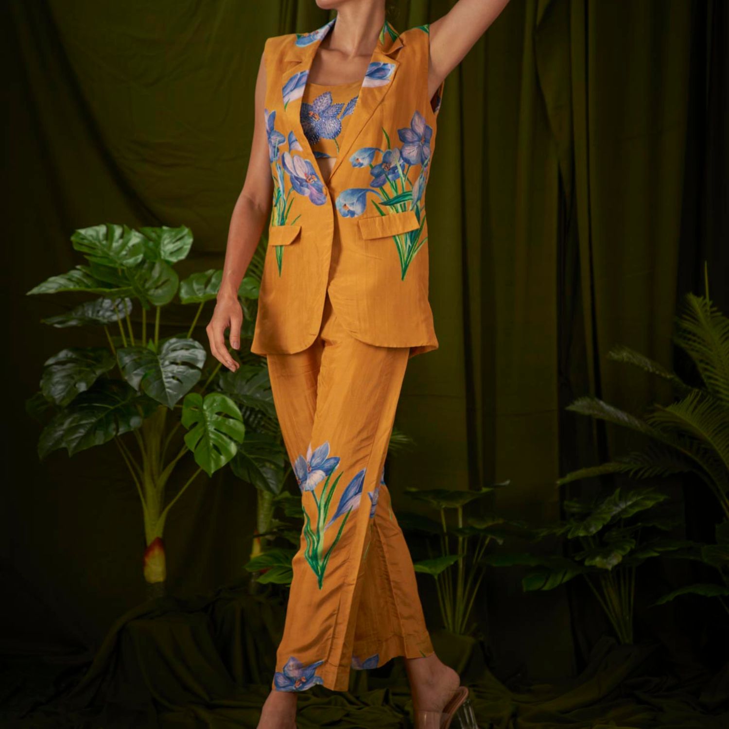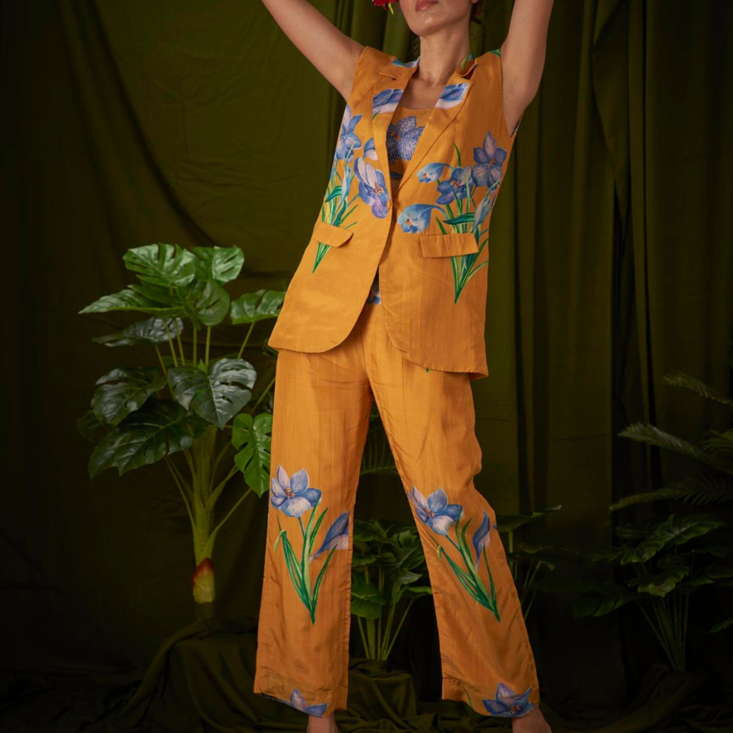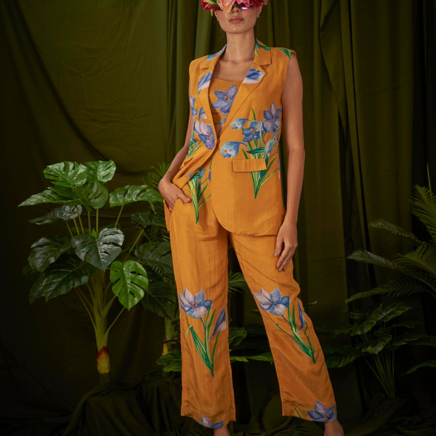 With its stunning wildflower print, this meticulously crafted sleeveless pantsuit embodies sophistication and seamlessly combines masculine and feminine elements, making it the pinnacle of suit fashion.