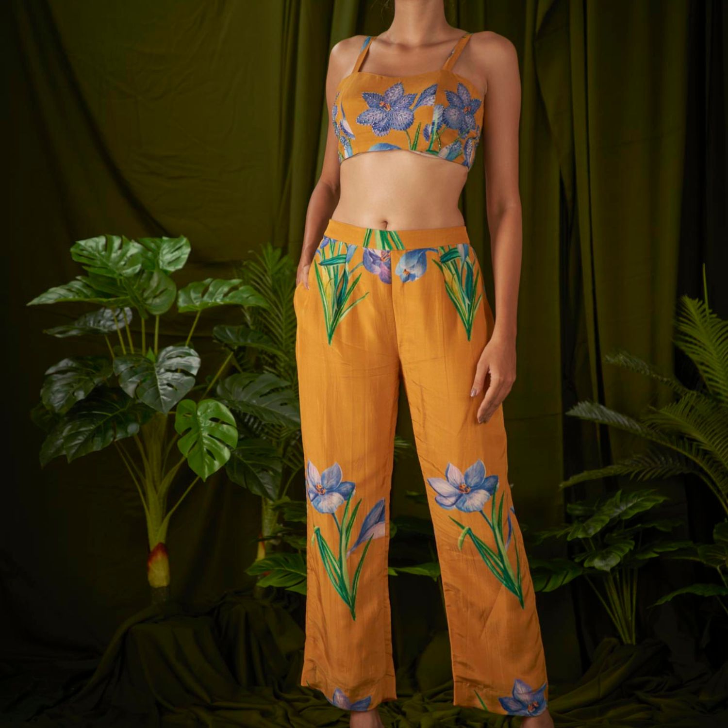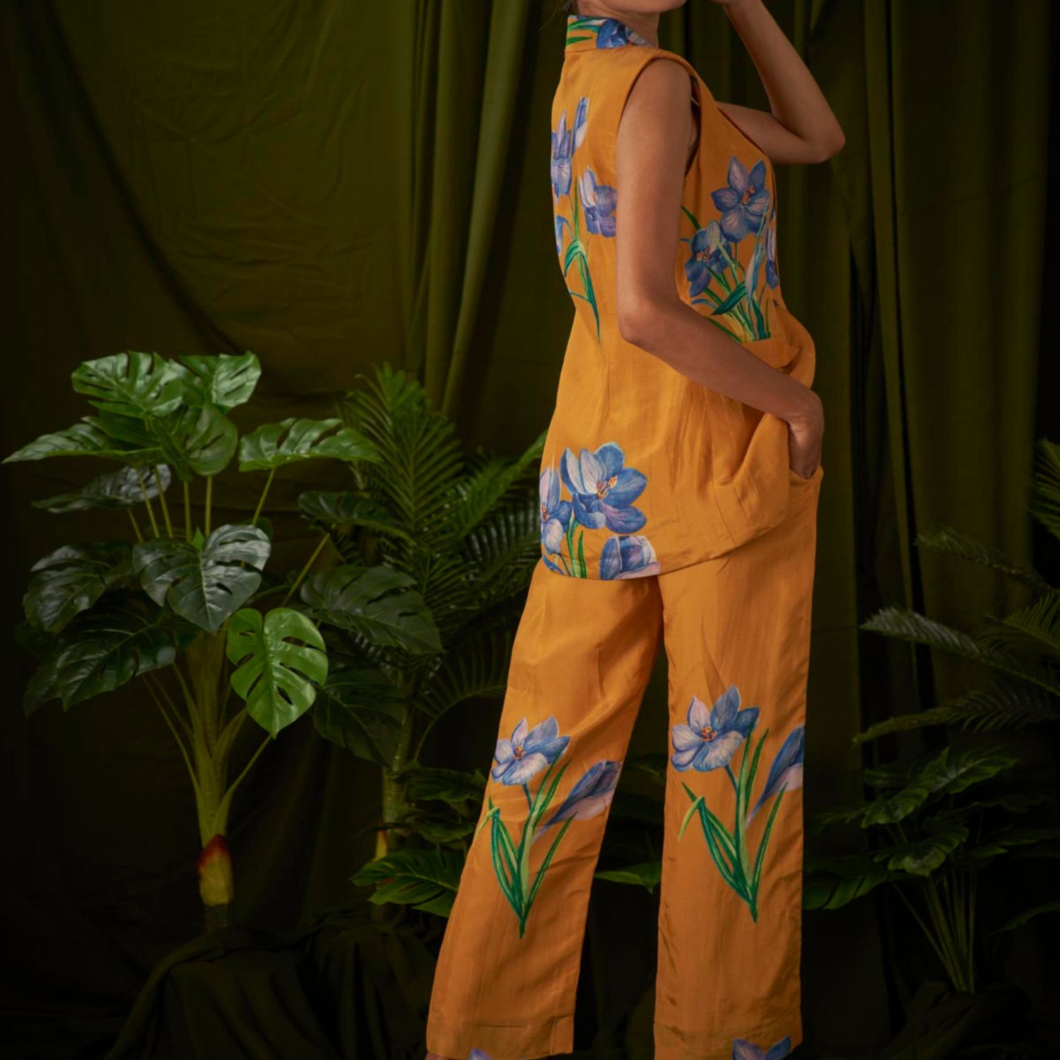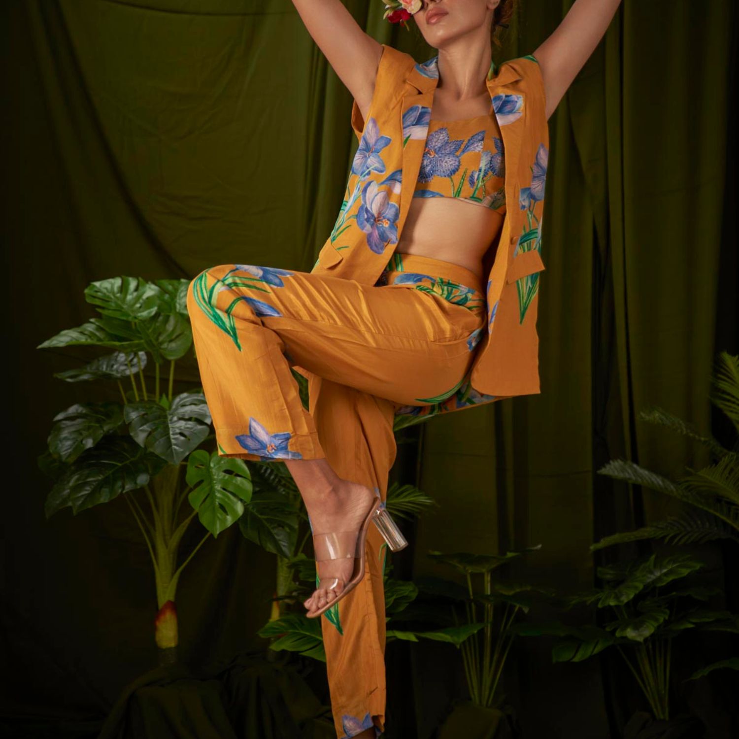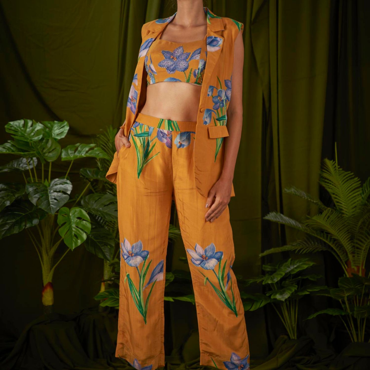 With its stunning wildflower print, this meticulously crafted sleeveless pantsuit embodies sophistication and seamlessly combines masculine and feminine elements, making it the pinnacle of suit fashion.