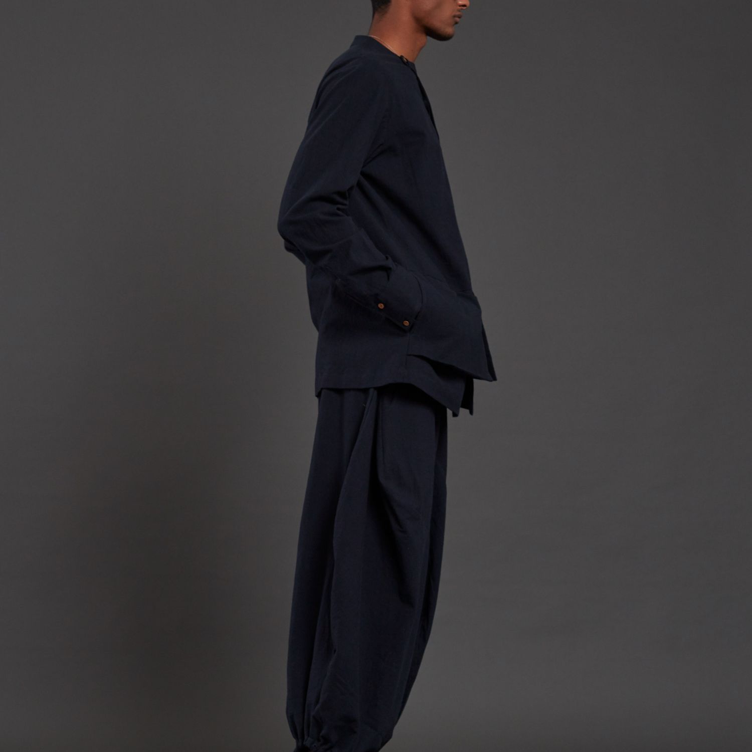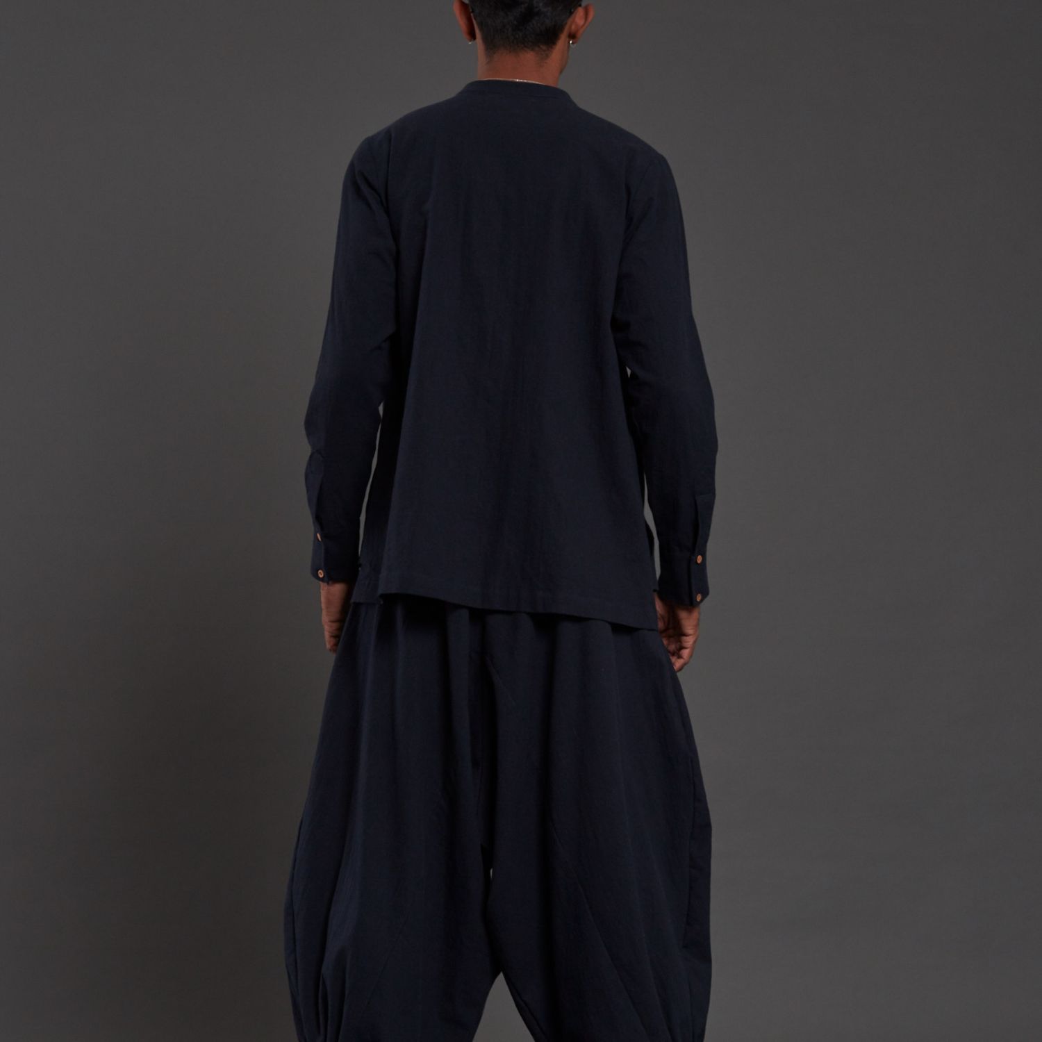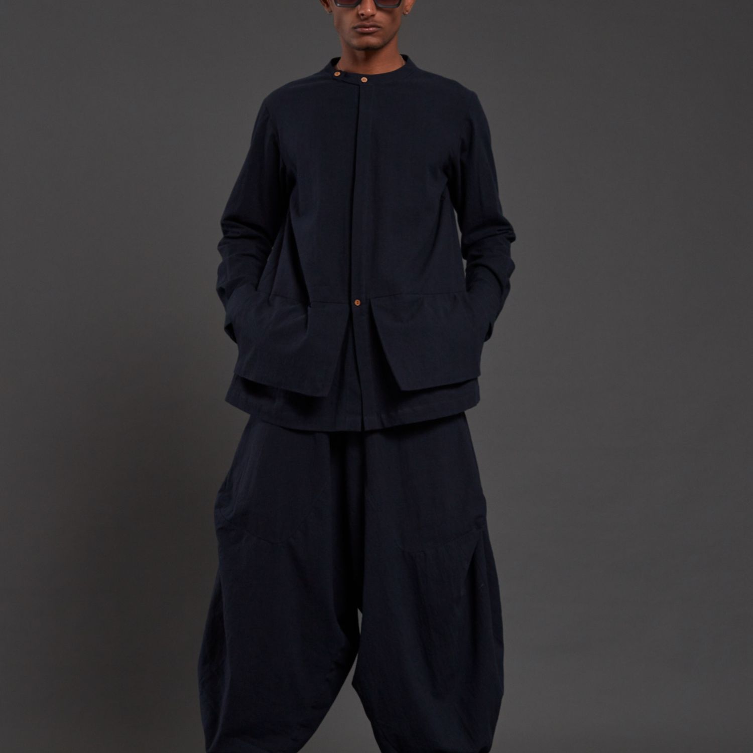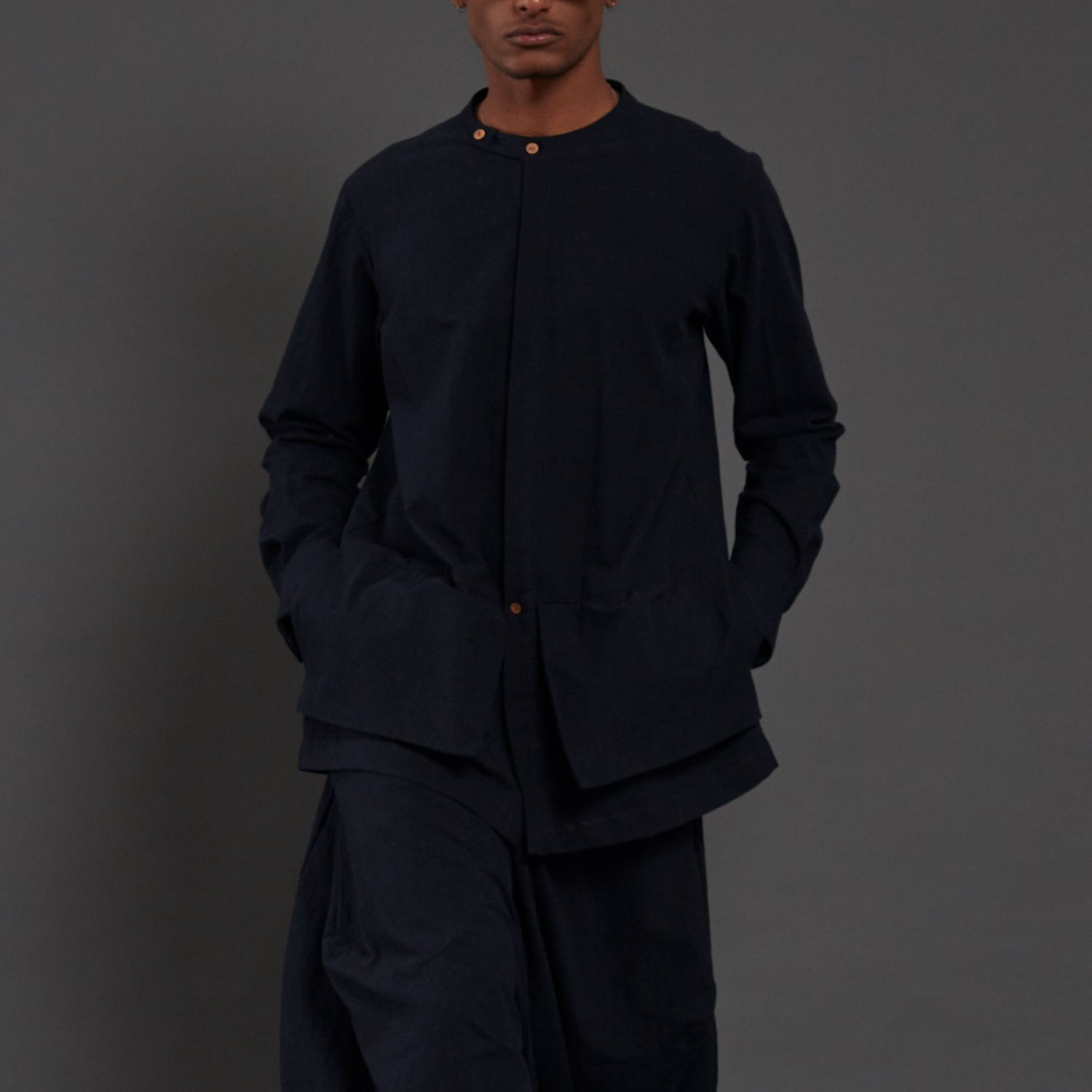 Introducing this versatile navy blue overlap collared shirt featuring stylish pocket detailing in the front. This shirt not only serves as a fashionable top but can also be effortlessly worn as a jacket, providing versatility to your wardrobe. Embrace the chic and functional design of this piece, perfect for adding a touch of sophistication to any outfit.