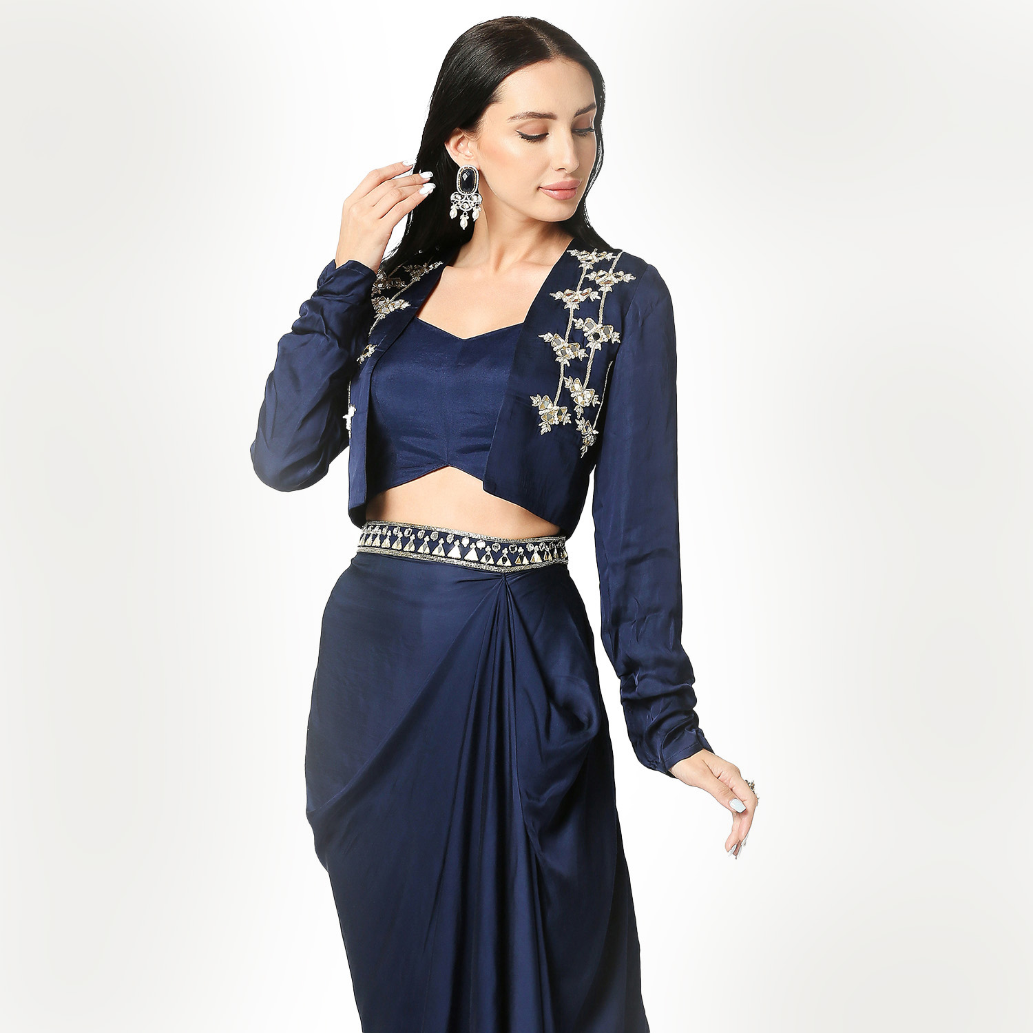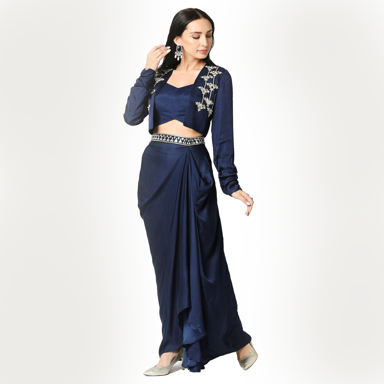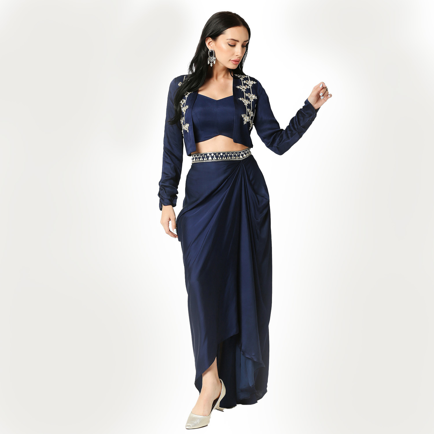 ₹ 25,000 (10% off)The set comprises a navy blue modal satin open jacket, beautifully tailored with stylized sleeves and adorned with intricate mirror, sequins, and zardozi embroidery. Accompanying the jacket is a navy blue modal satin draped skirt featuring a hand-embroidered waist belt for a flattering silhouette. The ensemble also includes a navy blue silk bustier that perfectly complements the jacket and skirt. Pair this outfit with neutral or metallic heels to complement the navy blue color.