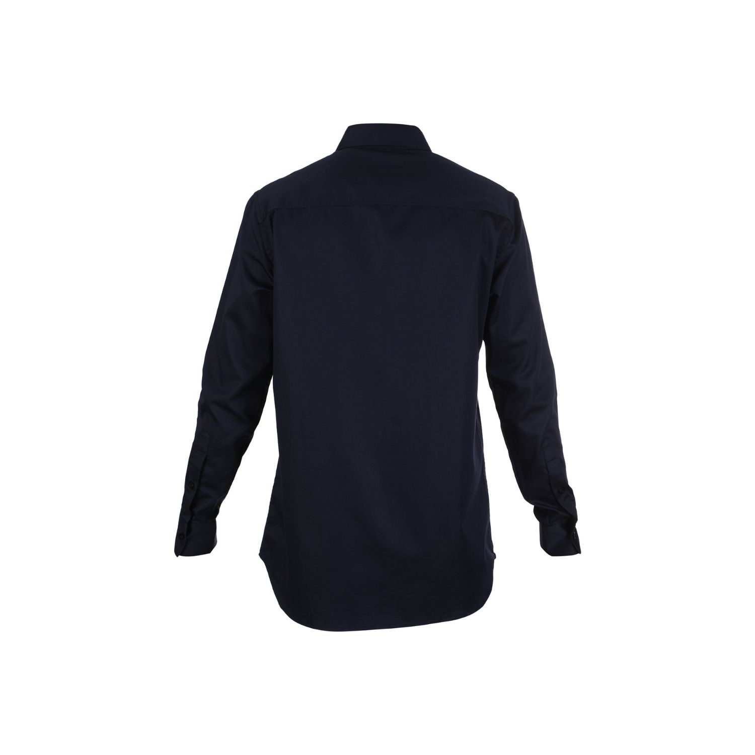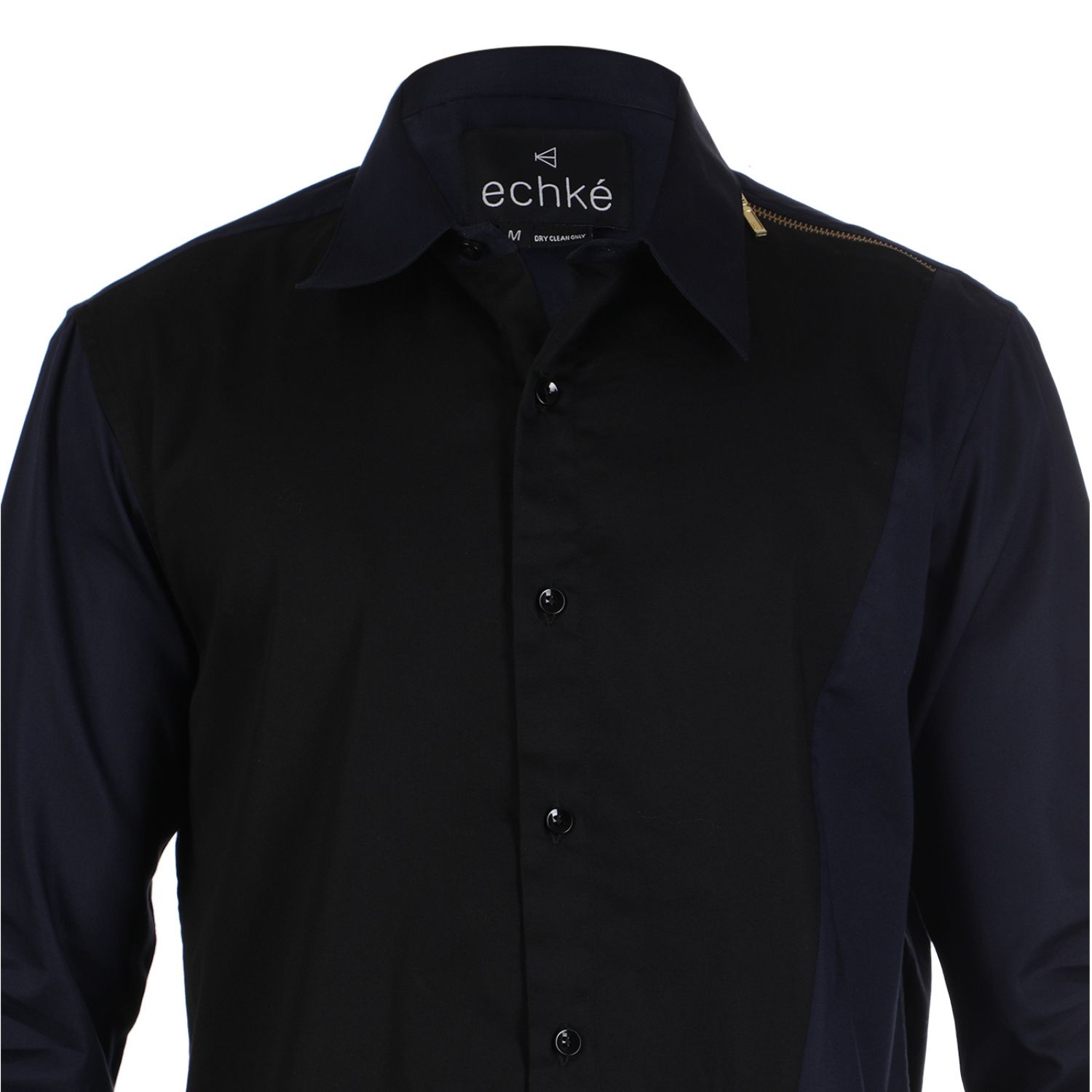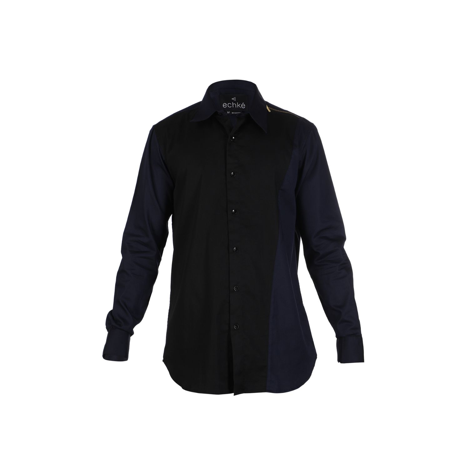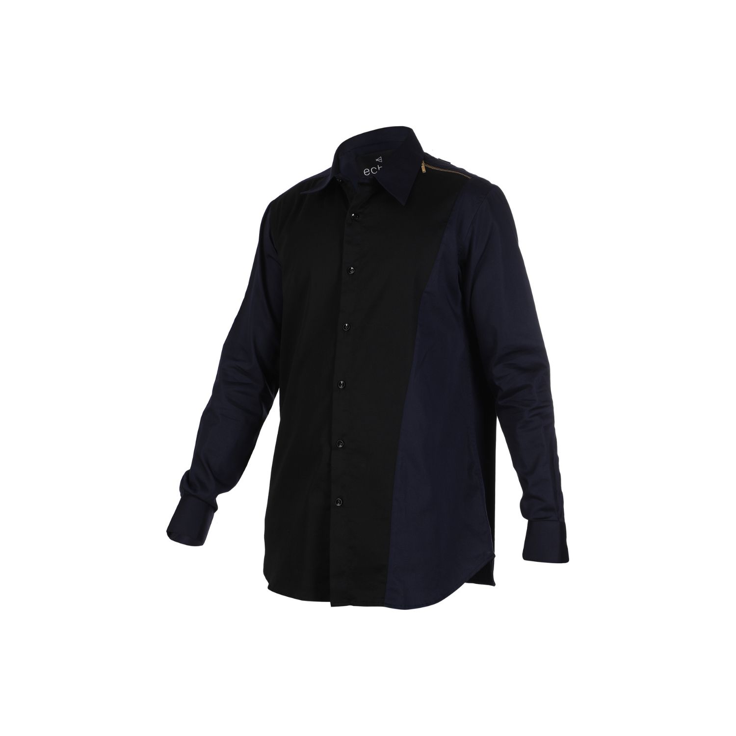 This navy blue shirt is a luxurious must-have with a daring black diagonal flap and zipper accent on one shoulder. The cotton-blend fabric offers comfort and style for the most refined gentlemen.