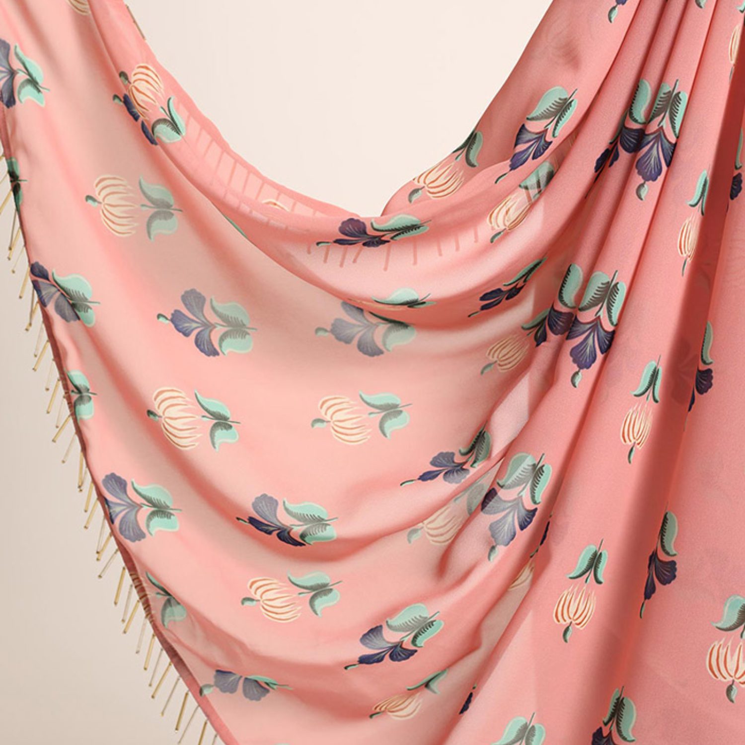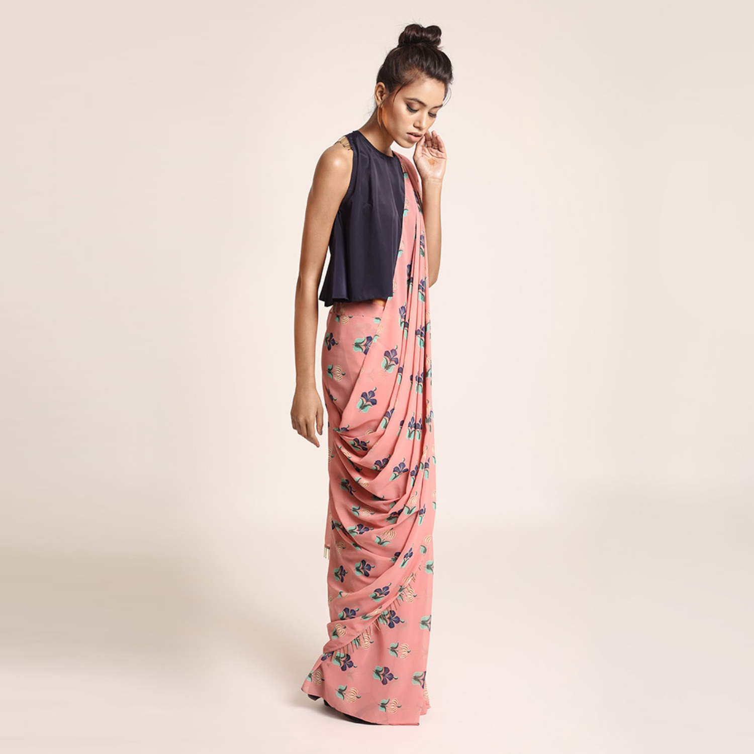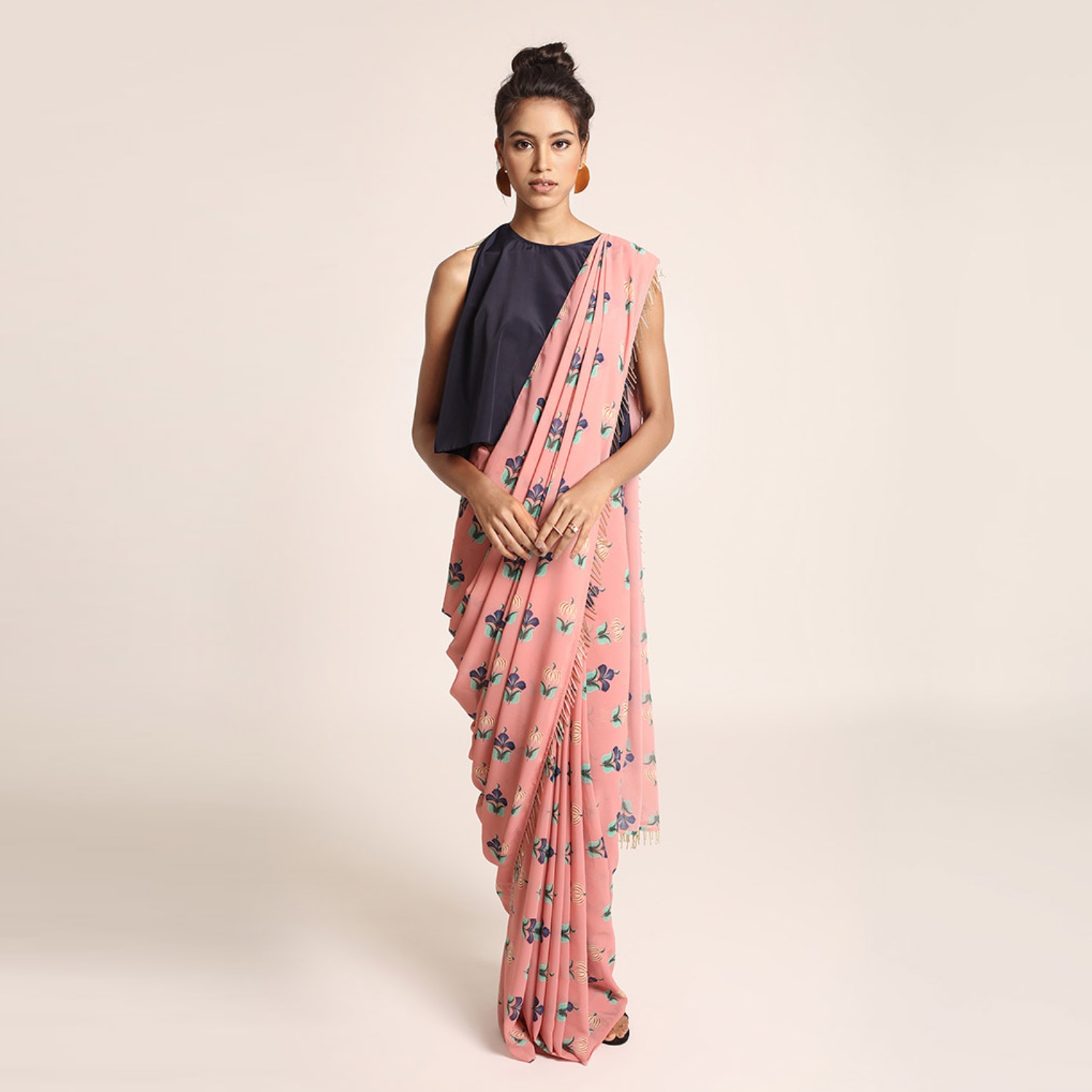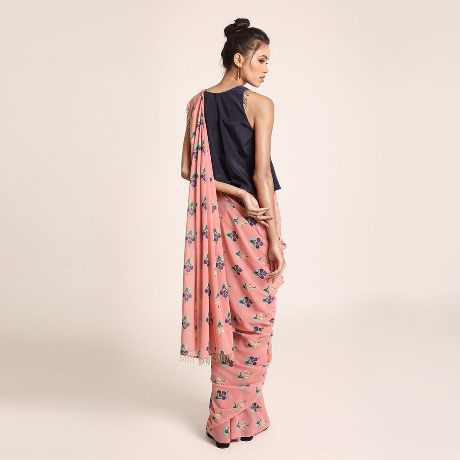 This beautiful set is crafted from high-quality crepe and georgette fabrics. It features a solid navy blue blouse with a sleeveless design and a coral printed saree with tassel detailing, adding a beautiful contrast to the look. Style it with statement earrings and heels for a dressy soiree.